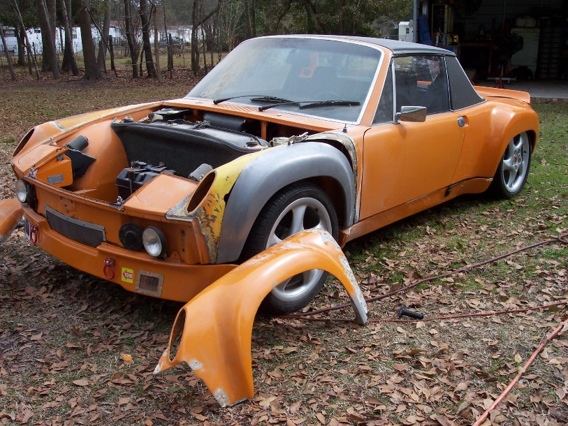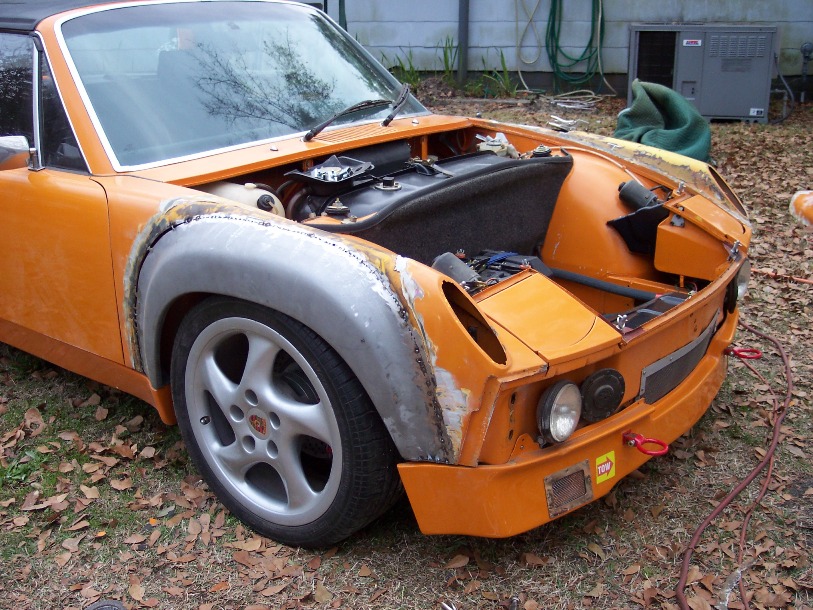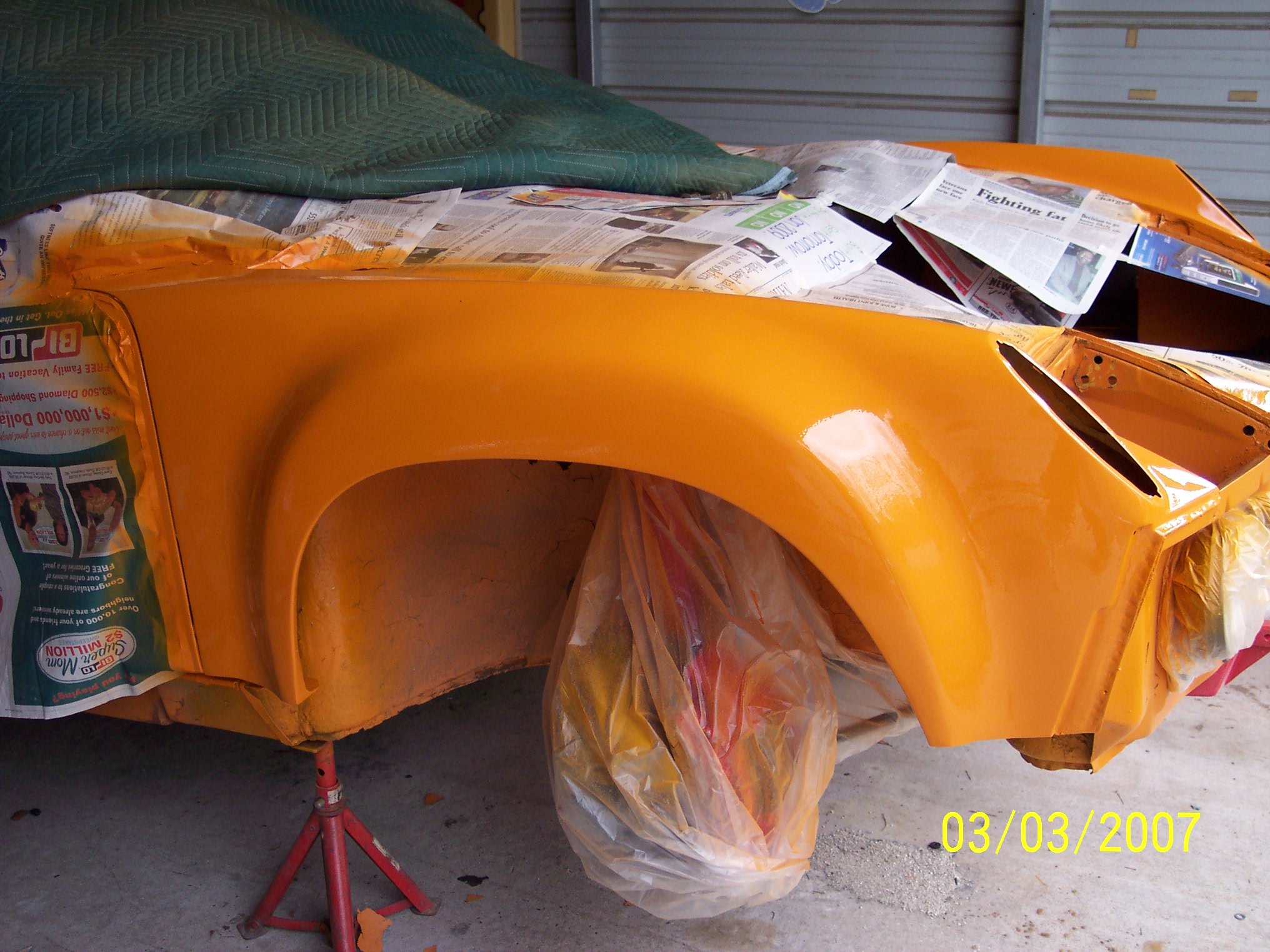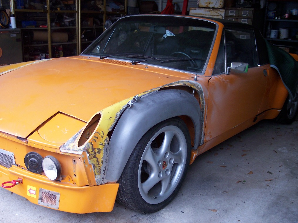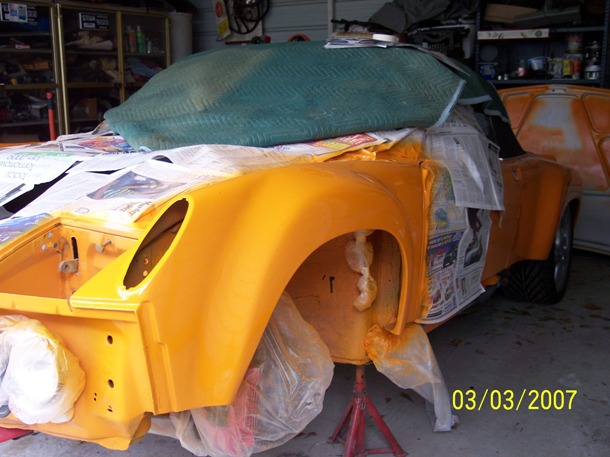 Front flares are now completely fitted,and primed. I've rolled the fender lips,cause the front tires rubbed when turned. For anyone wondering,my front setup is 930 brakes,930 hubs,78 930 front wheel spacers,and the 18X8 front wheels. the front and rear flare ends need a serious amount of fab-work to get them to match the rockers and spoiler.I would suggest that anyone putting on flares have the spoiler and rockers in place to make everything line up before any paint is laid. Ron Attached thumbnail(s) Entries on Tuesday 6th February 2007
