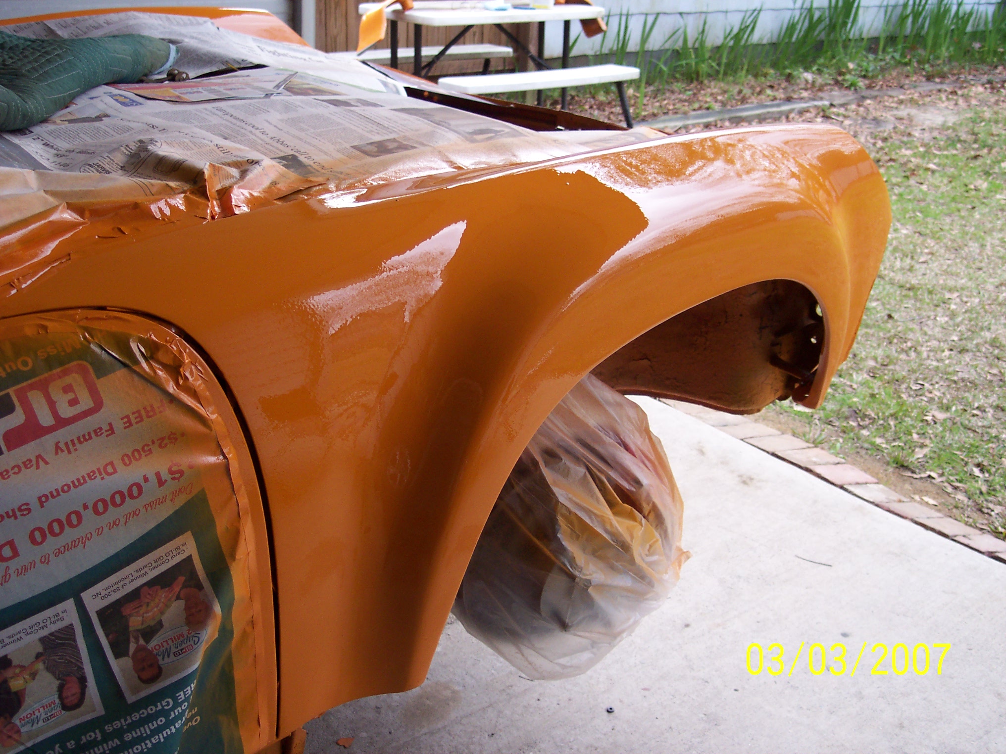 This weekend was a good one for the old flare switch. Got the repo flares cut and started the 2" widening process. The amount needed to widen is shown in the photo with tire on sticking out past the stock flare. Tire is a 265, on a 18X10 rim w/a 40MM offset setting on a 2" spacer. I've now got everything about 60%done on the rear. Hopefully I'll be completely done in about 2 weeks. Ron Entries on Monday 19th March 2007