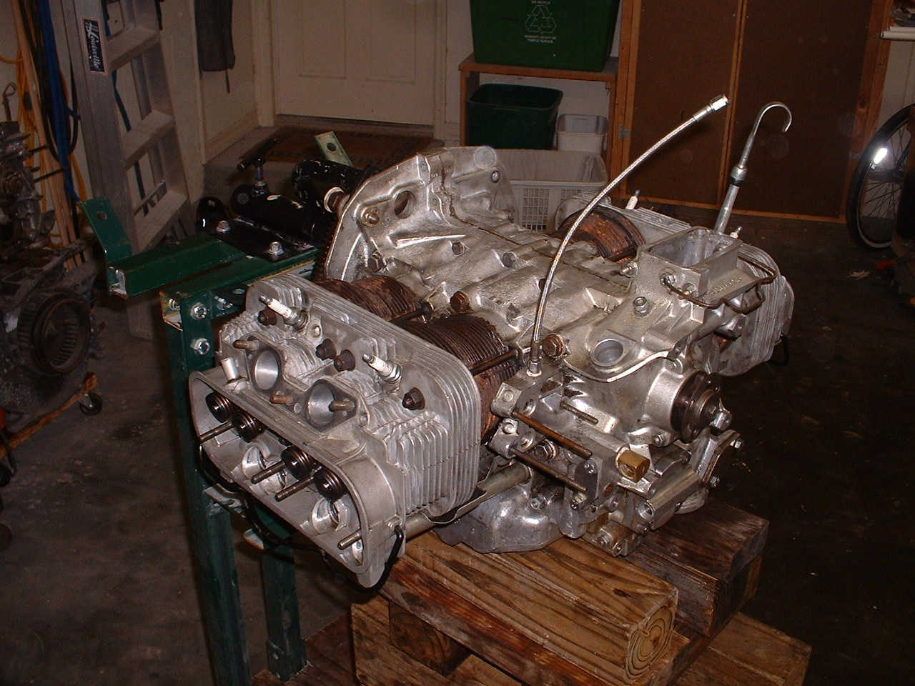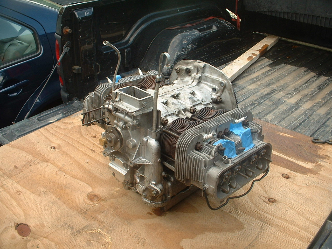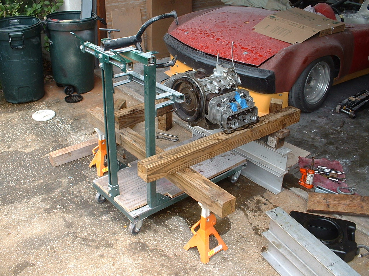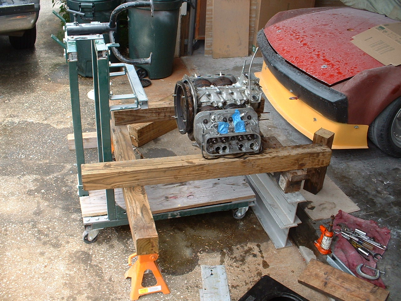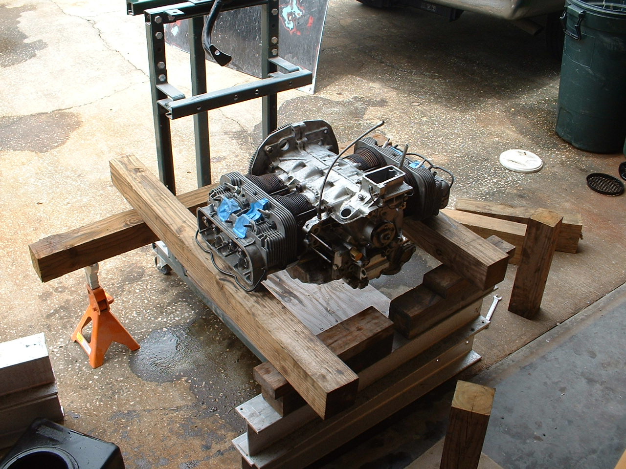 I picked up my Raby's Aircooled Technology engine yesterday. First pic is the engine on David's floor. Second is in the back of my truck. Others are of me jacking it up to get it high enough to go on the engine stand. You can do anything with enough 4x4's.