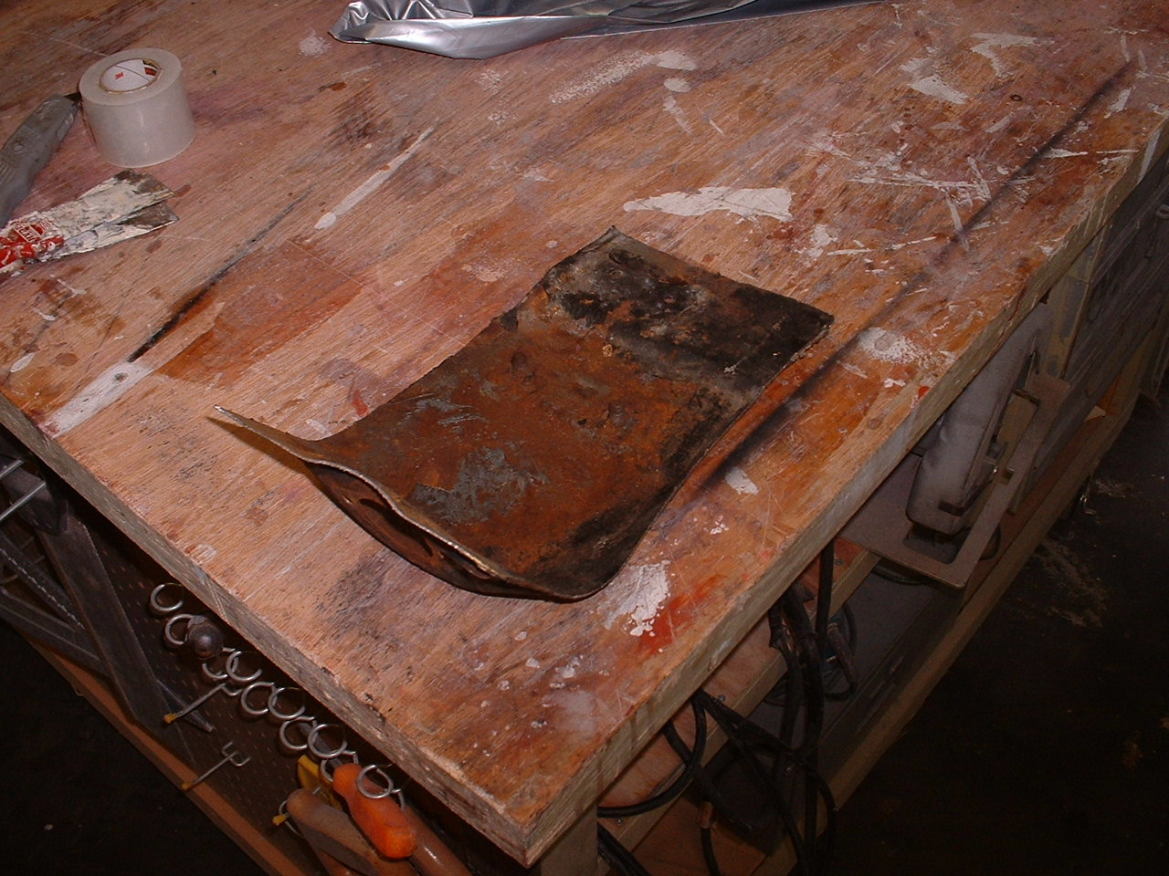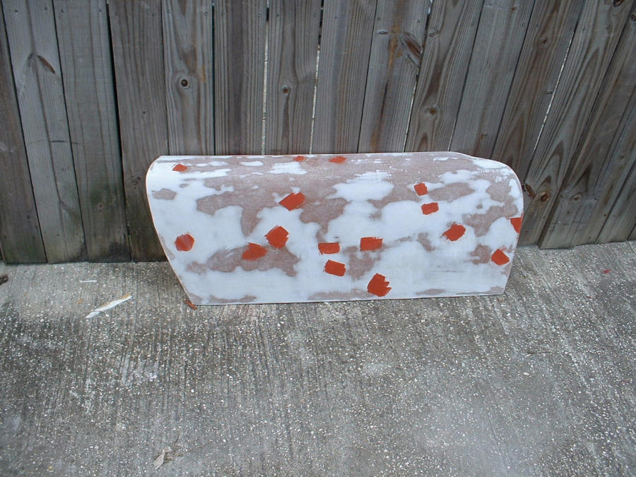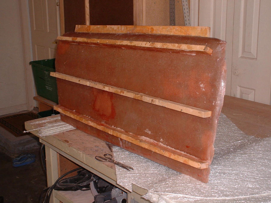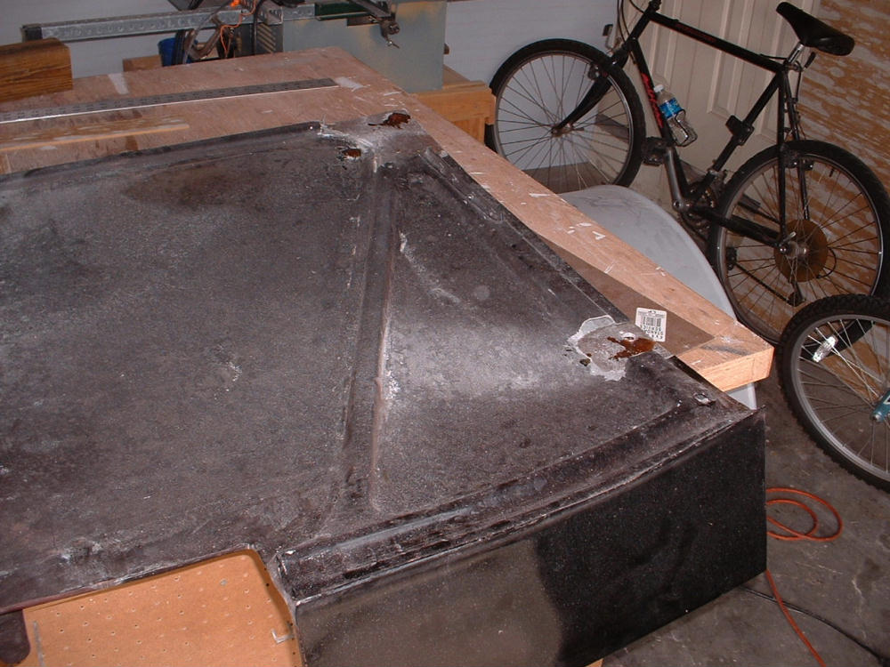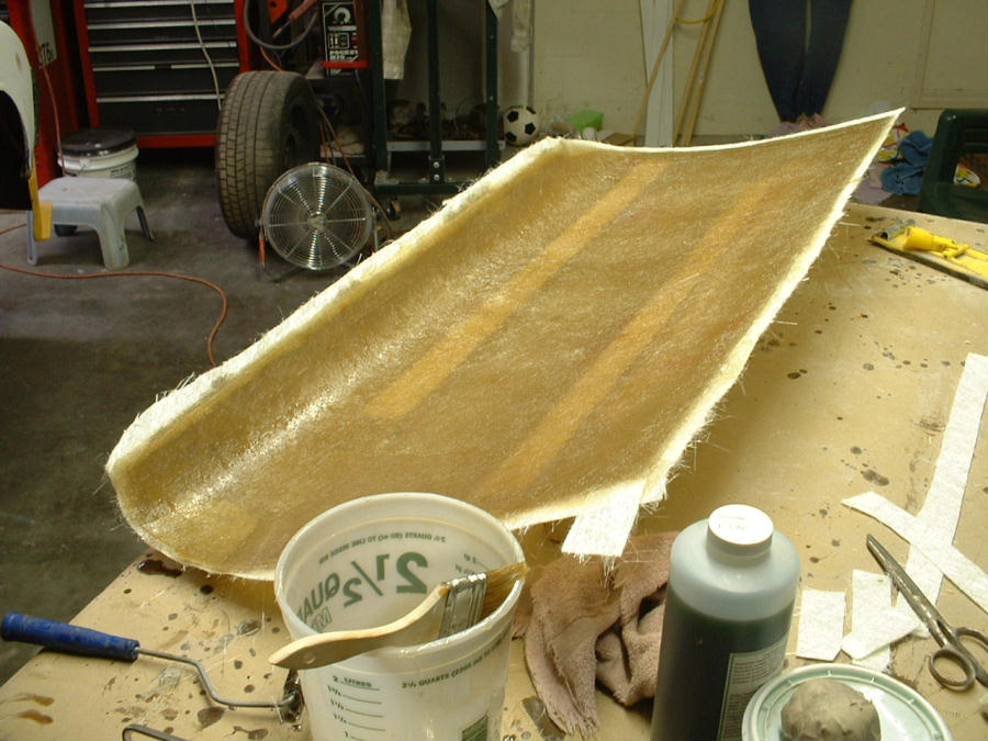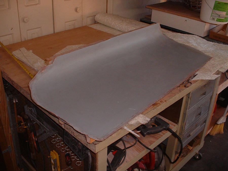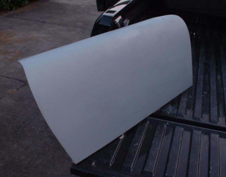 I make fiberglass door skins... First two pictures are of the mold. Third picture is of the mat in the mold Fourth is Joe's door after a skim coat of bondo and some filler. Last picture is TimT's door after it was primed. A door skin weighs just under 5 pounds. Attached thumbnail(s)