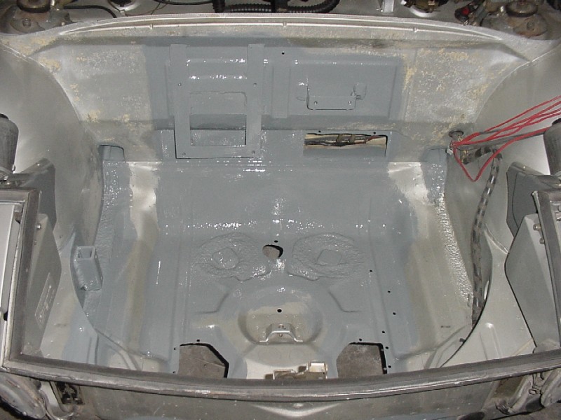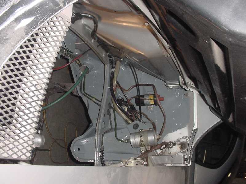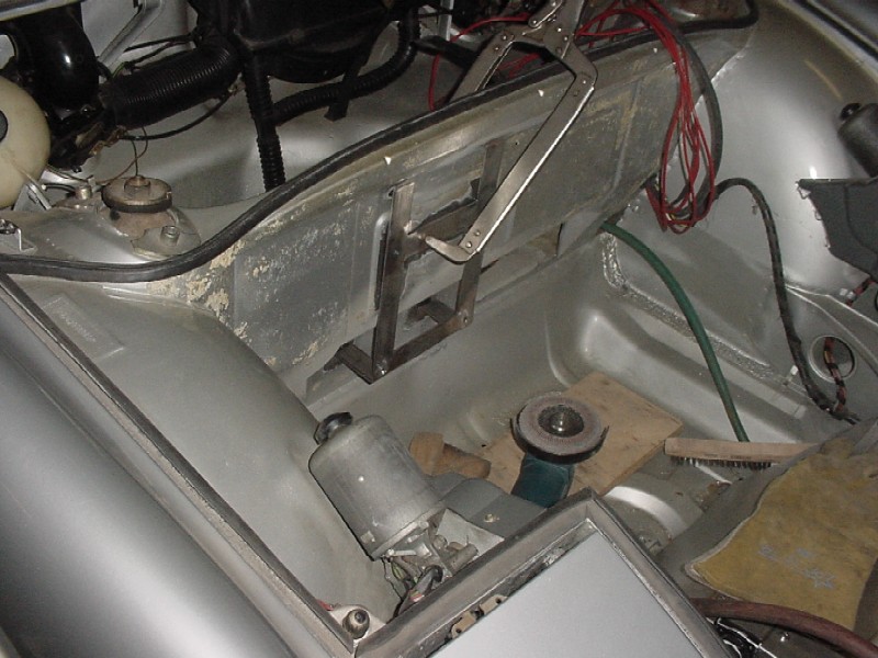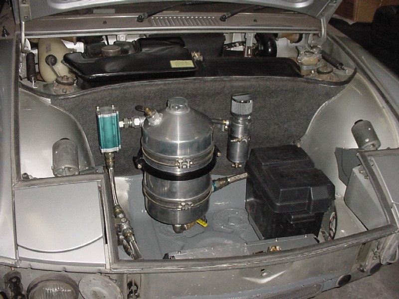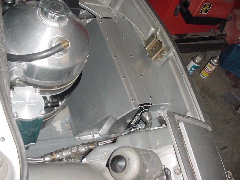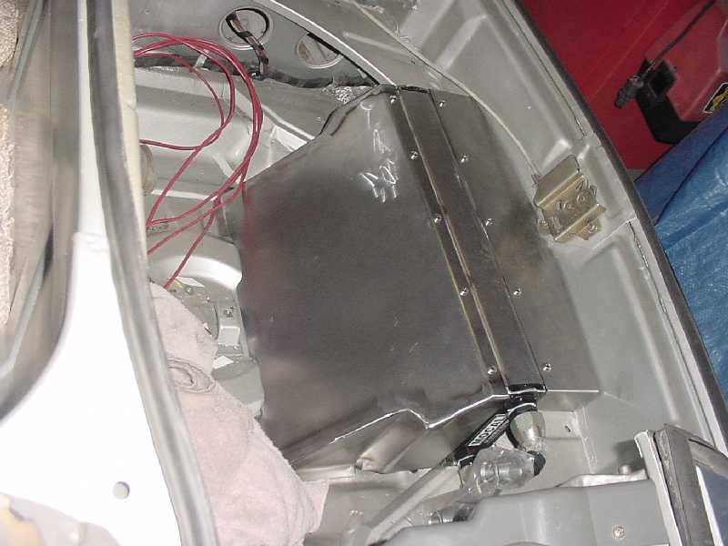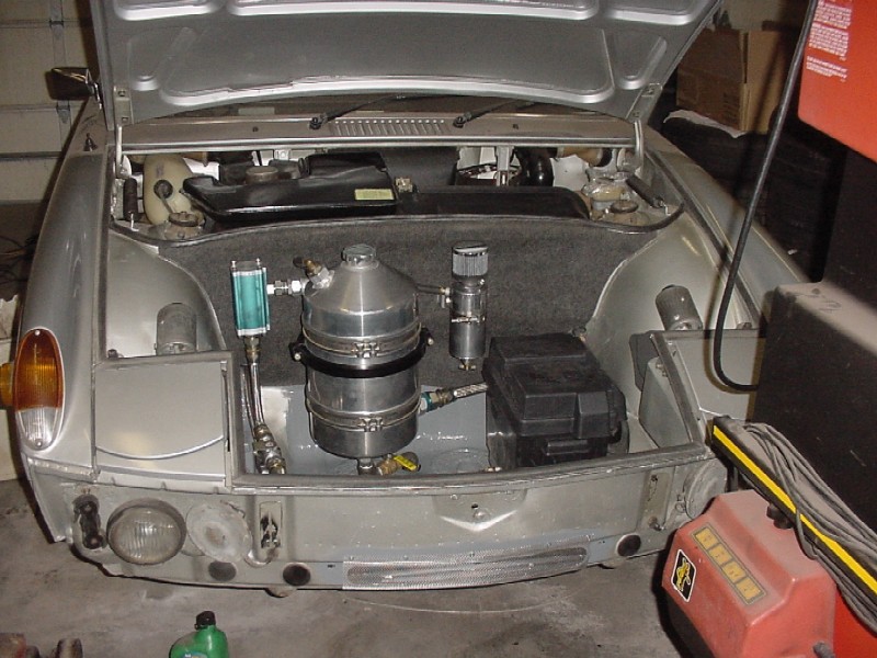 I worked at finishing up the front trunk. I re-installed the felt, I installed the oil tank, the tank breather, the thermostat, the cooler and it's powder coated shroud, the battery box, the fuel pump, fuel lines, and gas tank.