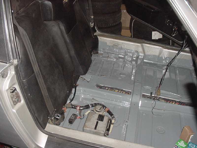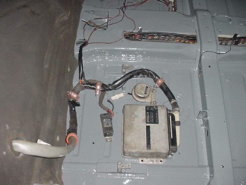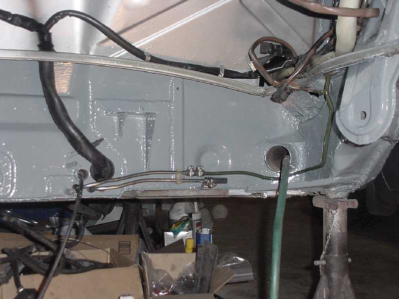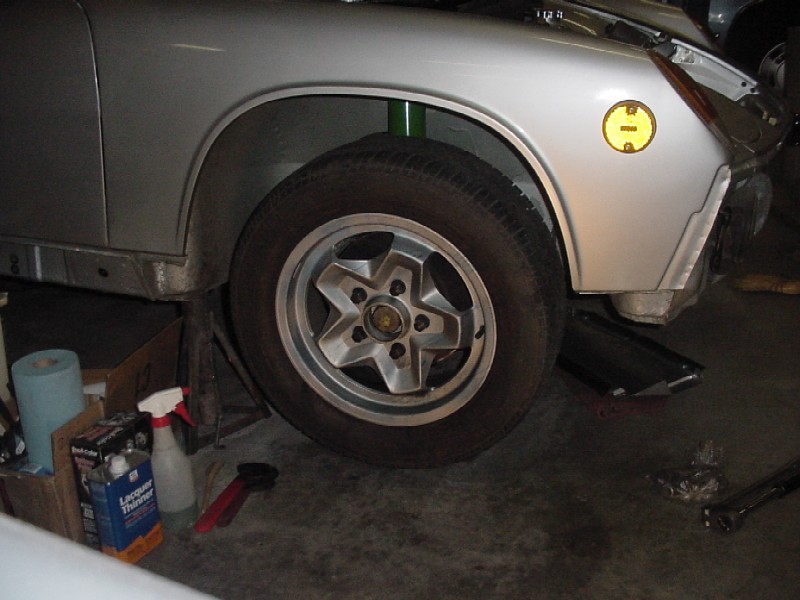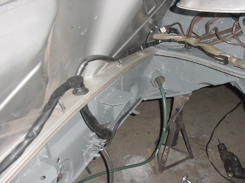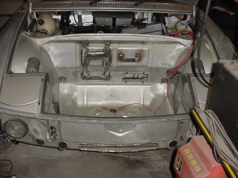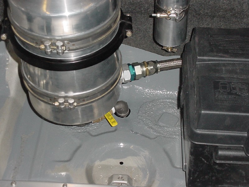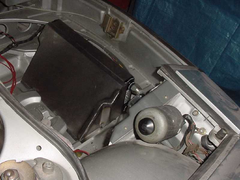 I worked at finishing up the front trunk. I re-installed the felt, I installed the oil tank, the tank breather, the thermostat, the cooler and it's powder coated shroud, the battery box, the fuel pump, fuel lines, and gas tank.