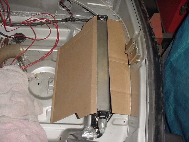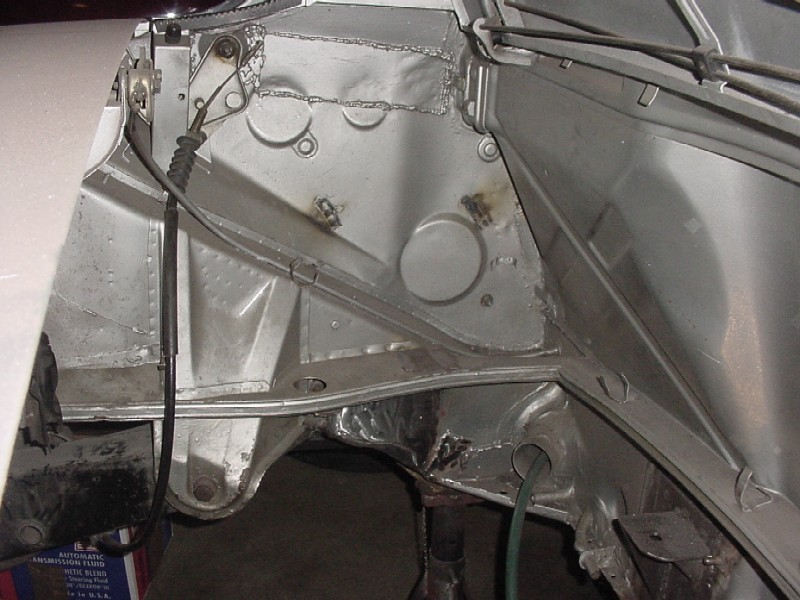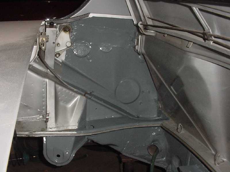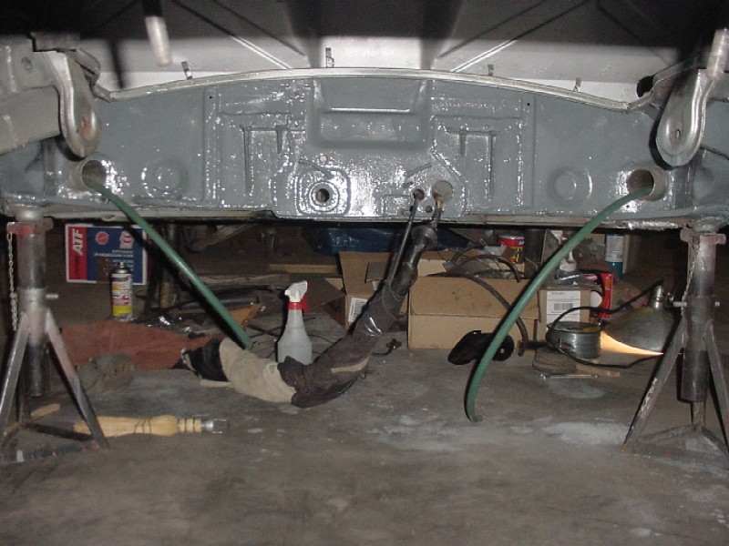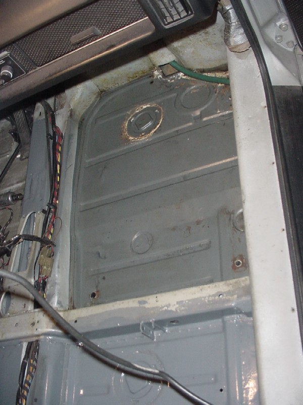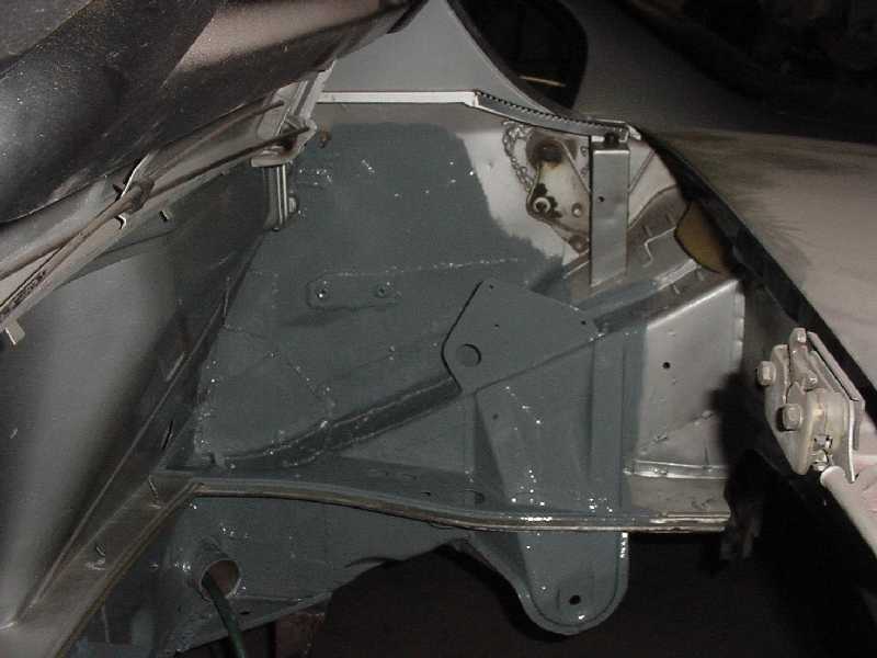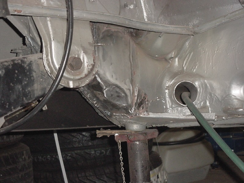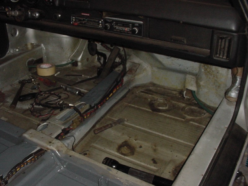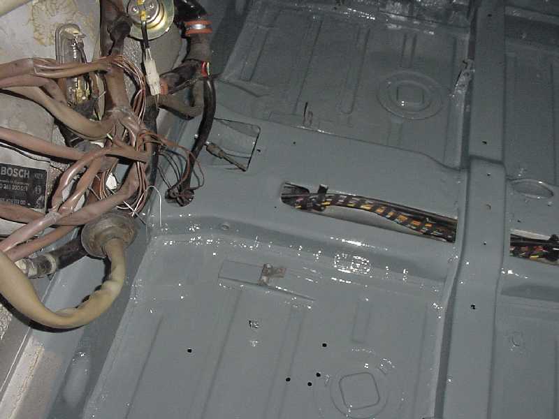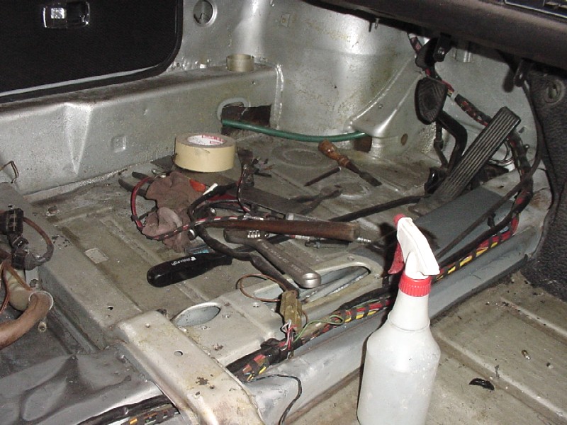 I started cleaning up the passenger side rear floor area to make sure that the floor is sound under the tar.... I also started planning the routing of my oil lines to the front. I'm going to go through the heater tubes and into the front trunk through the boxes on each side of the car (see green water hose). I have garden hoses pulled in where my oil lines will be run. The passenger side was not as rusty as the driver side was. Attached thumbnail(s)