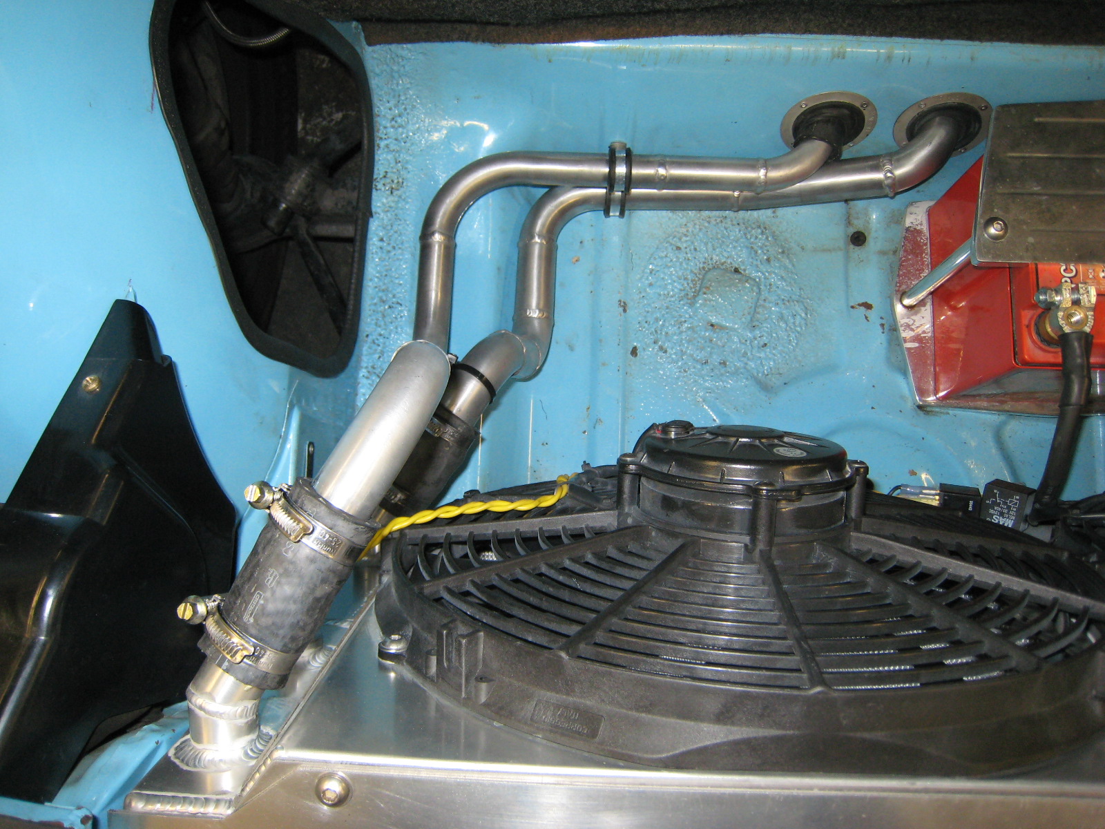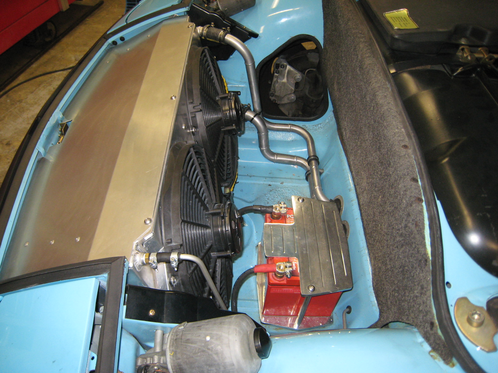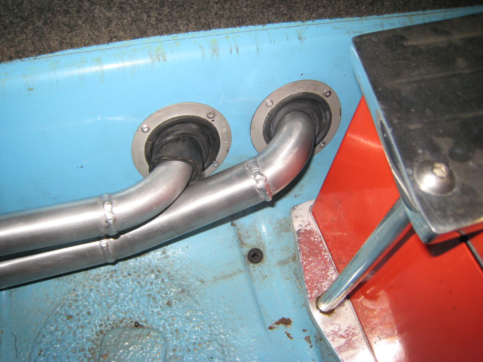 Just received the attached pics. Now the water lines (and brake and fuel lines and the shift cable) are fully protected AND I have just a little more room in the front! It will be time-intensive to remove the cover on the "tunnel" if necessary, but I really doubt I'll have to do that very often! More work being done re: lowering, corner balancing, alignment, some exterior cosmetic changes, minor repairs etc. Stay tuned, more pics to follow.