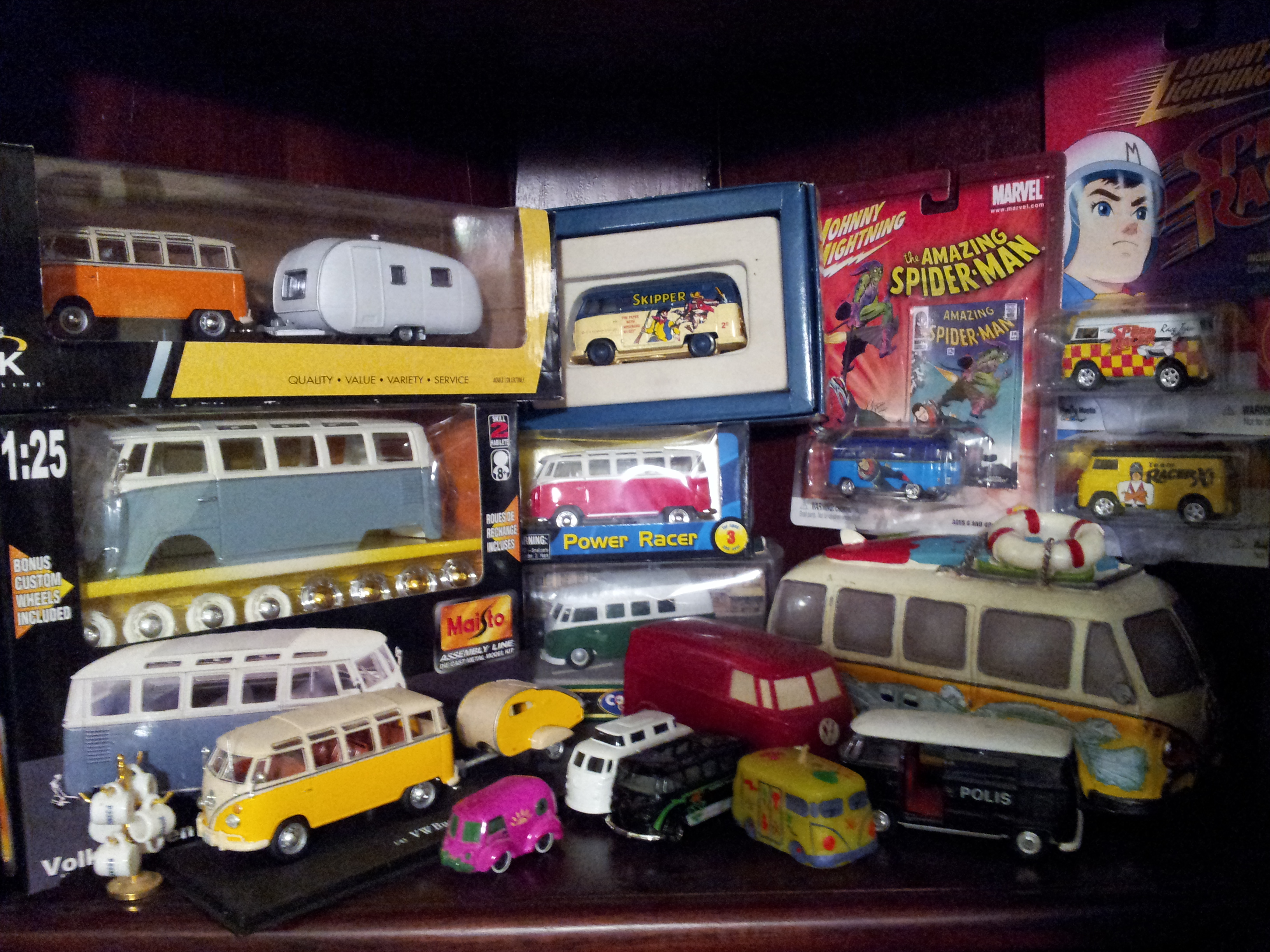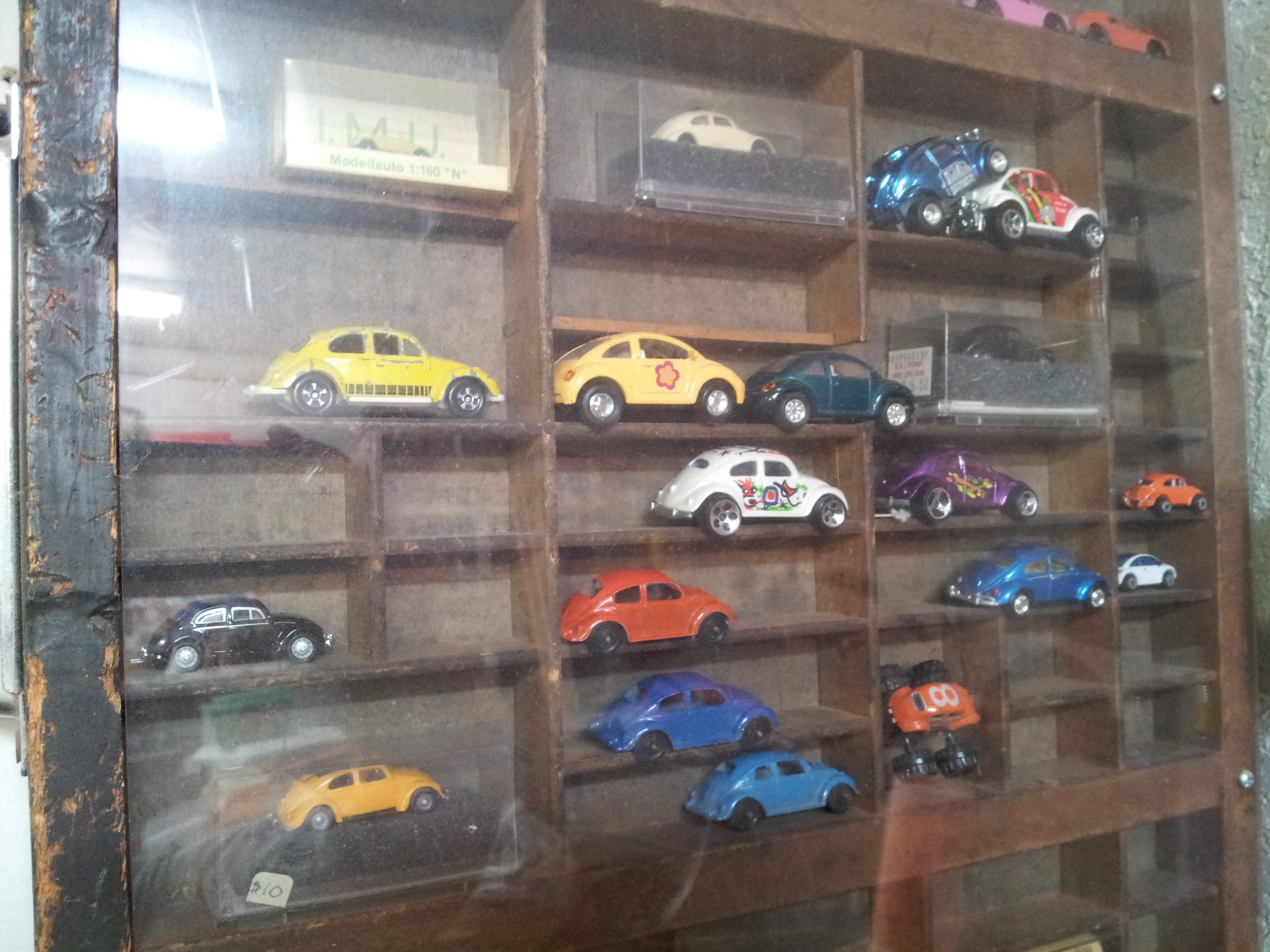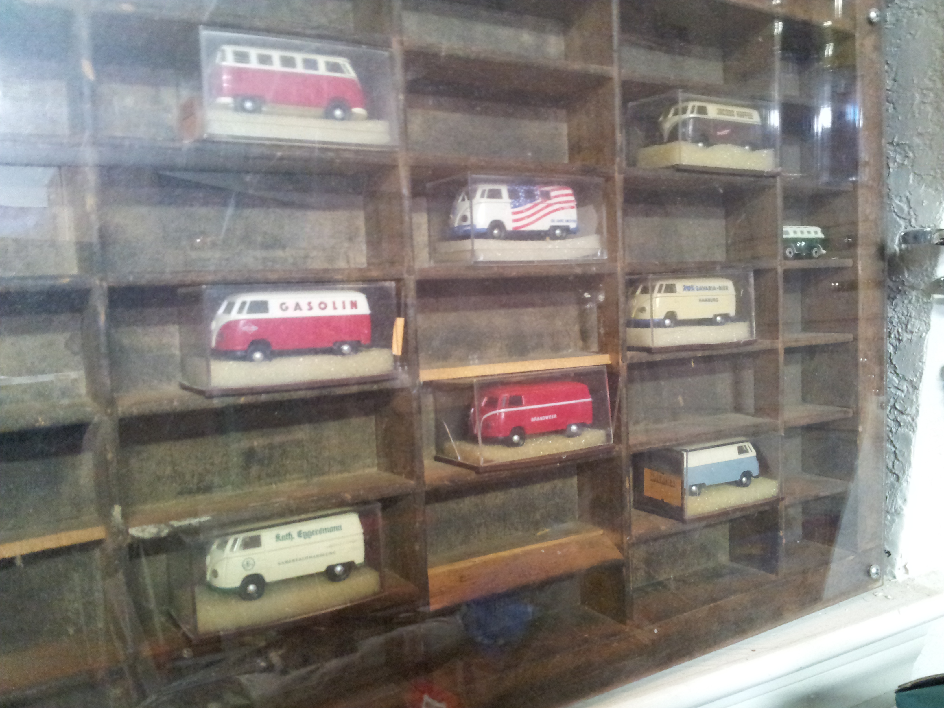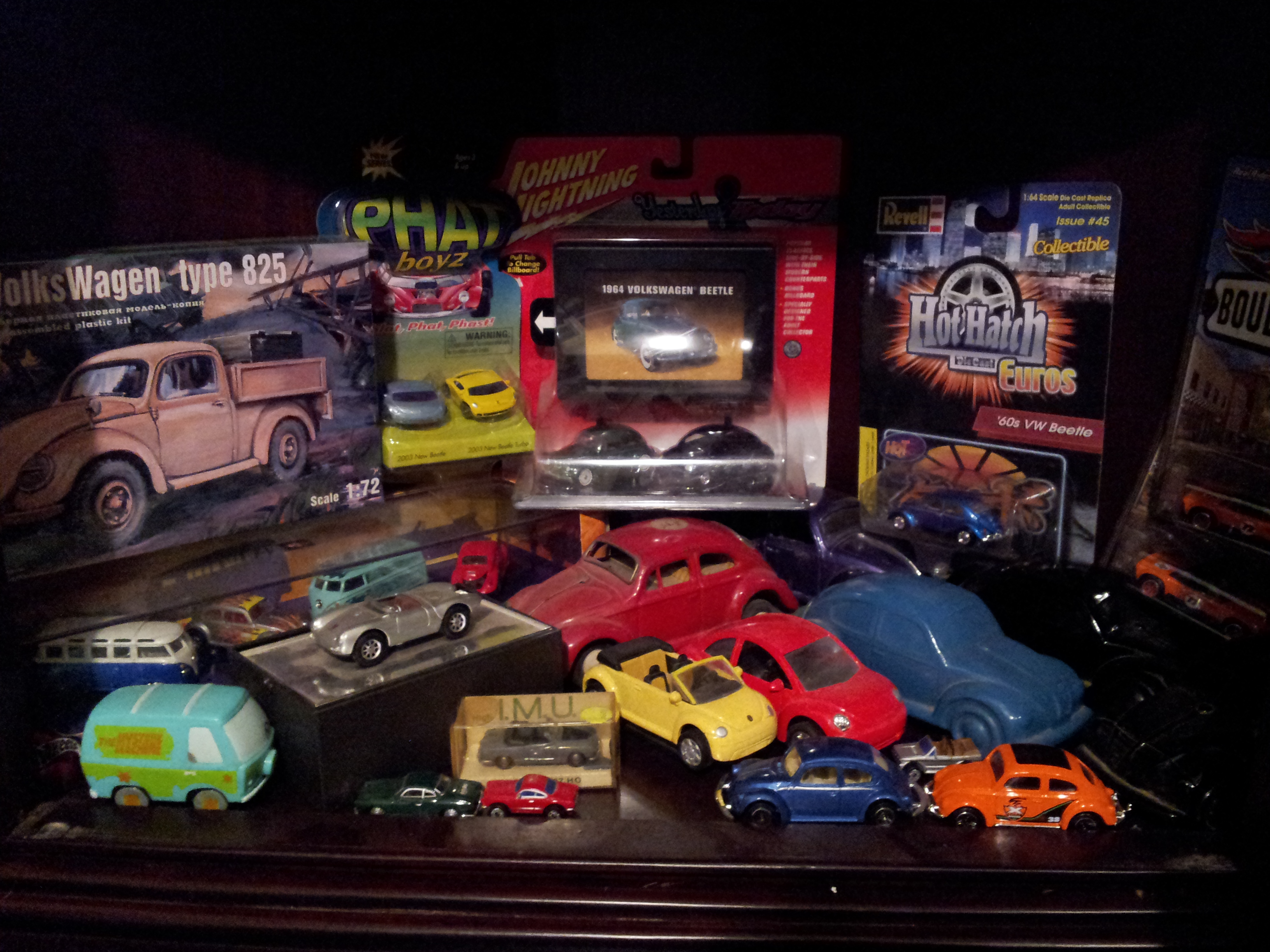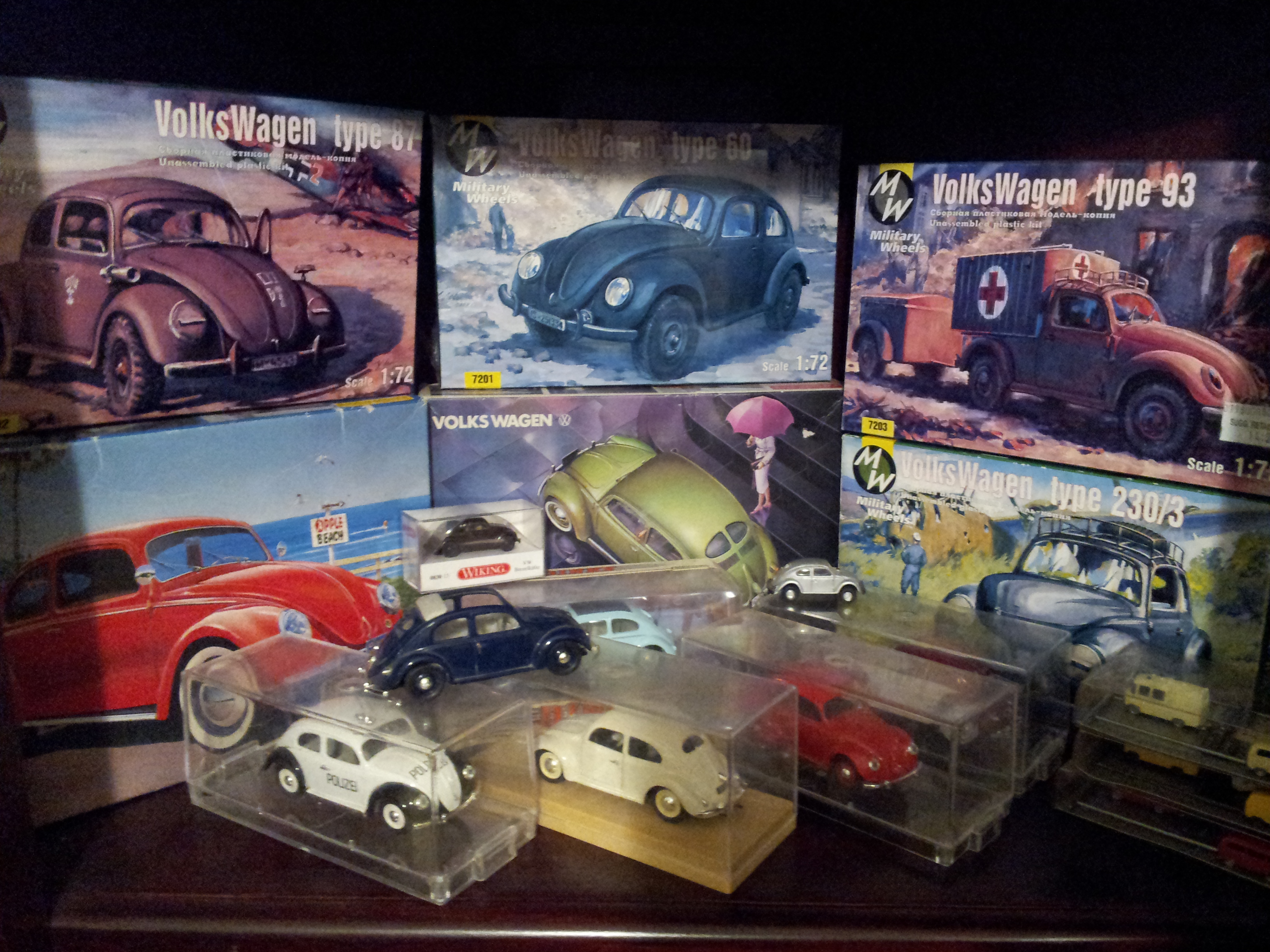 The White one at the bottom center is made by RIO. It's one of the only metal Oval window bugs I have ever seen. Most all early type 1's are Split windows. The plastic model kits are German Military VW's made in Poland.