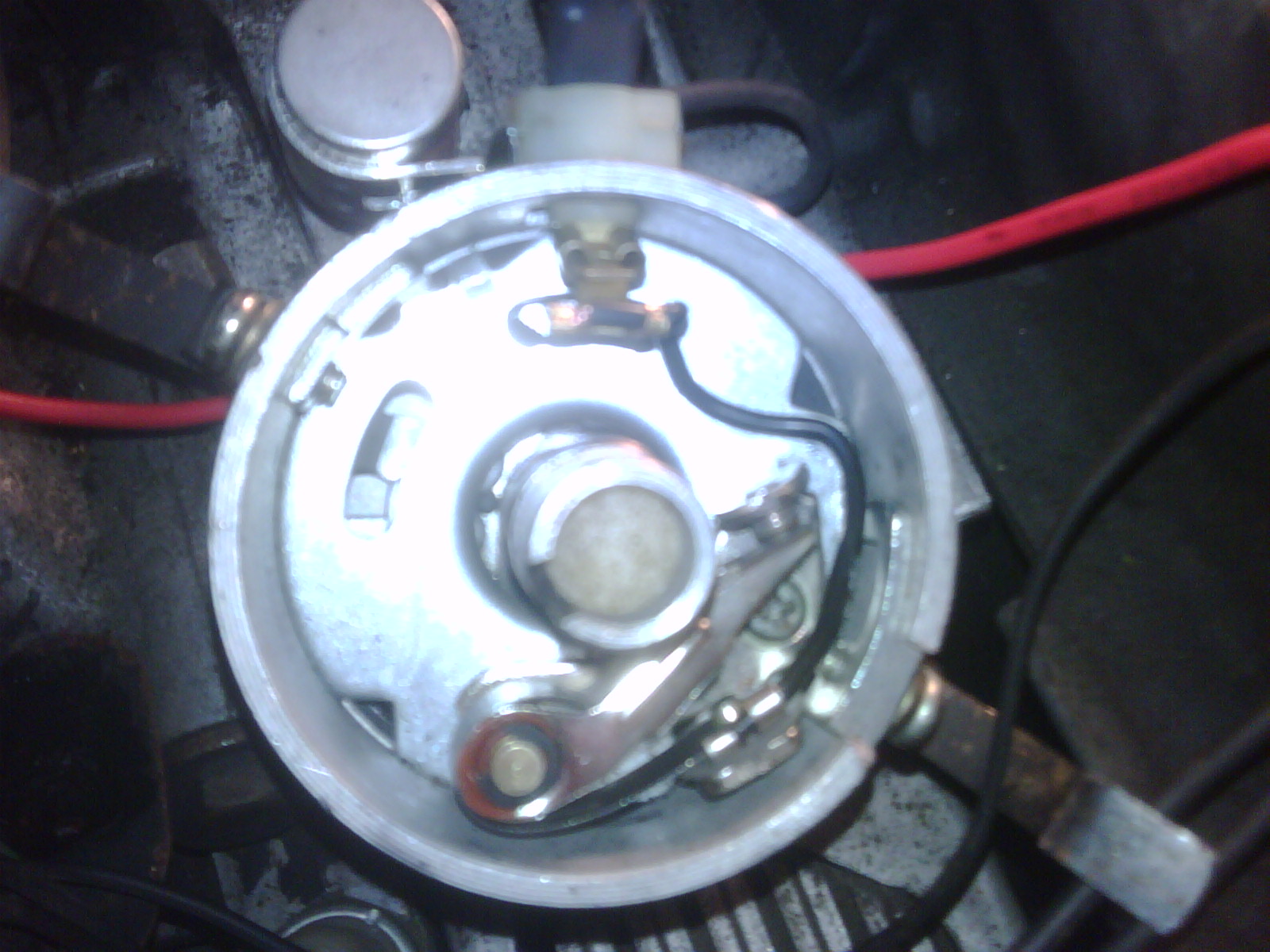 The prevoius owner had installed a Chevy one wire alt. I was getting a full 12V to the points at all times and it had melted the insulator on the points cam/rod/bar" thingy"?". I was told that it is supposed to get only 9.3V with the key in the run position and 12V only when you engage the starter. Notice in the picture the orange stuff melted. Gap and everything was set correctly, it just had leaned over enough to ground out without the insulation on that little bar. Solution: I could have intsalled a new set of points and a "univerasal ballest resistor" on the wire going to the dist to reduce the voltage to the correct amount (9.3). Instaed I went ahead and upgraded to a 12V Pertronix electronic ignition that will handle the full 12V's all the time. Runs better than ever now!