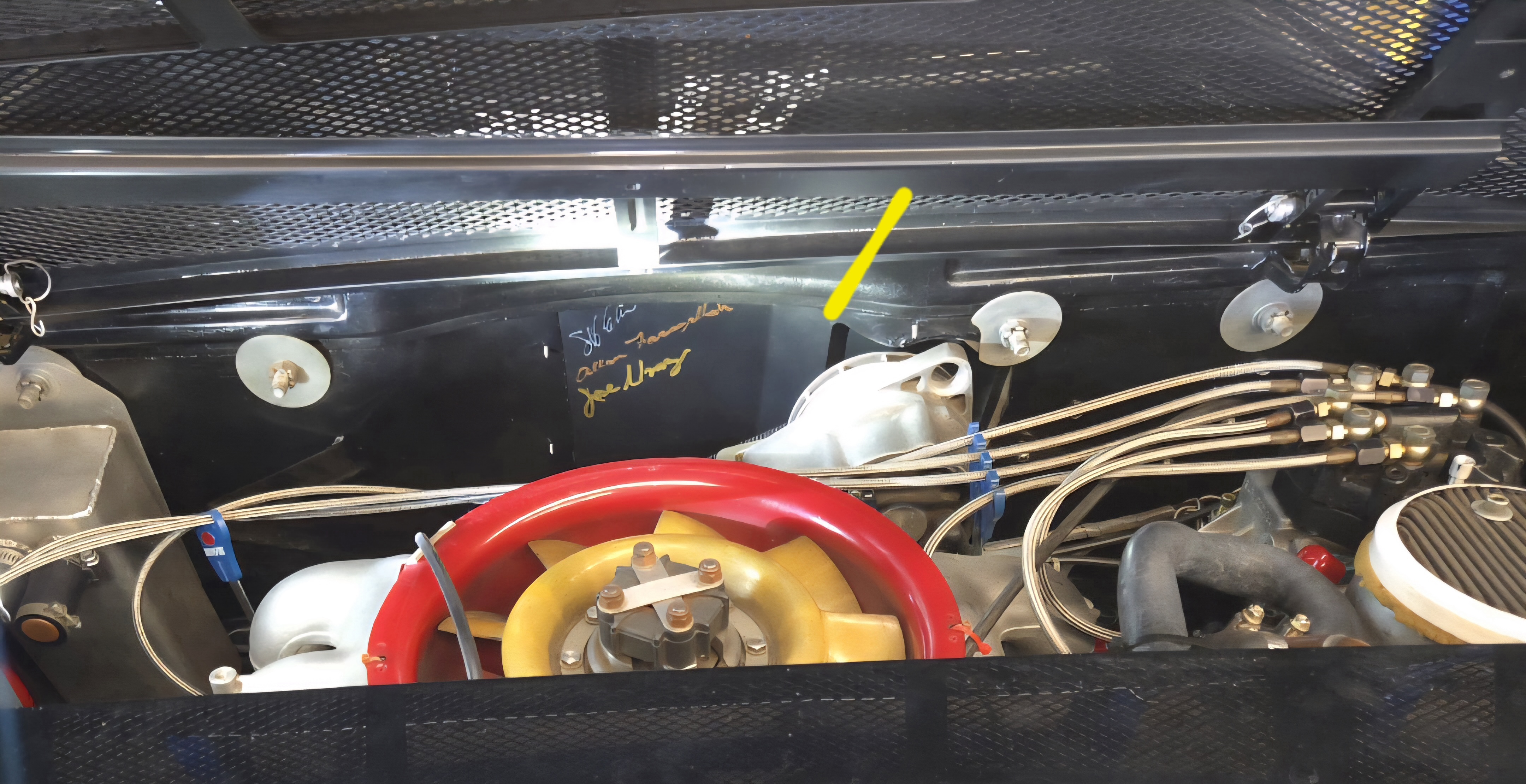 Clay, yellow line = the small sheet metal 'Bump-out that I formed on the firewall cover plate/ to clear the alternator nose. I believe the Weissach boys used an off the shelf Scirroco Vw alternator.