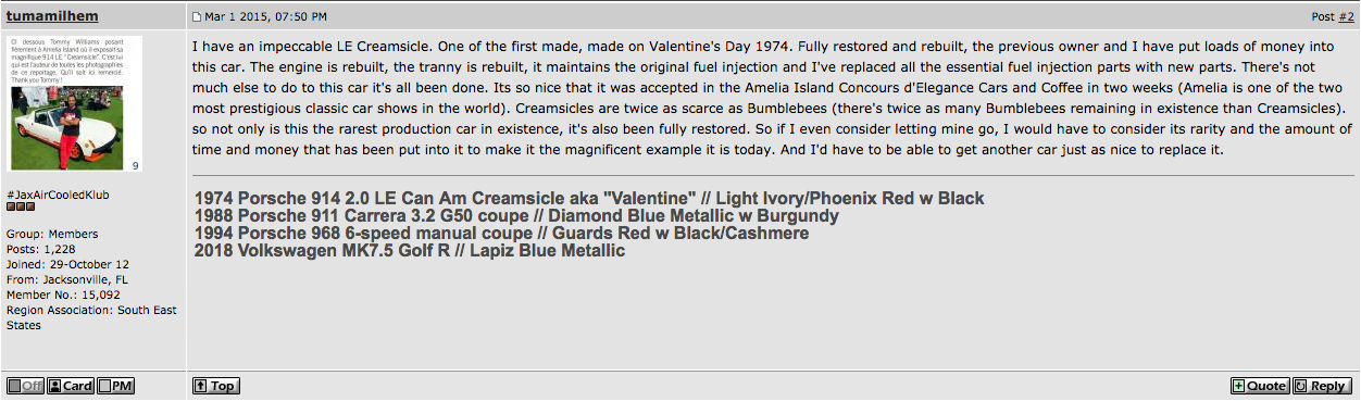 Dragging this back out after five years?? Why?? Let me tell all you haters a story. Tommy is a great guy and a personal friend. He probably won’t see this crap because he never comes to this forum because of the negativity he received and is getting again here on another post. This guy is a 914 enthusiast and loves his car. He has an awesome 911 and a mint 968 but usually can be seen in his 914. The first time I took my car to a the local C&C he practically ran up to me to and just made me feel great about my recent purchase. He went out of his way to make sure I went to the local PCA events and introduced me around. I just don’t get some people here on 914World. Not most but some. I even heard someone at Octeenerfest come up to Tommy and personally mentioned this post and how it was BS. I’m also going to post to the other tread throwing shade his way.