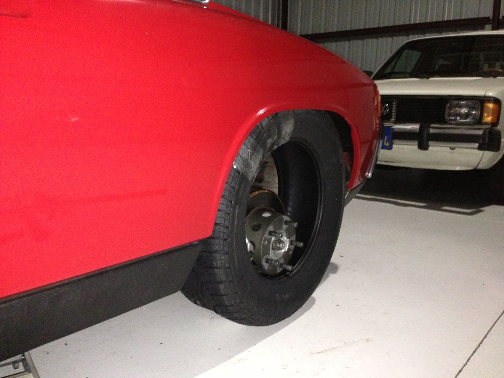 Working with washers and longer studs, I was able to get it into both sides, but the inner tire was rubbing on the trailing arm and car brake line, and there was NO room for the tire to "walk" around under load. So I skipped and went to 185/70R15 Avons for now. I like them, but miss seeing fatter rubber tucked under the car. May move to something else. We'll see. Attached thumbnail(s) |