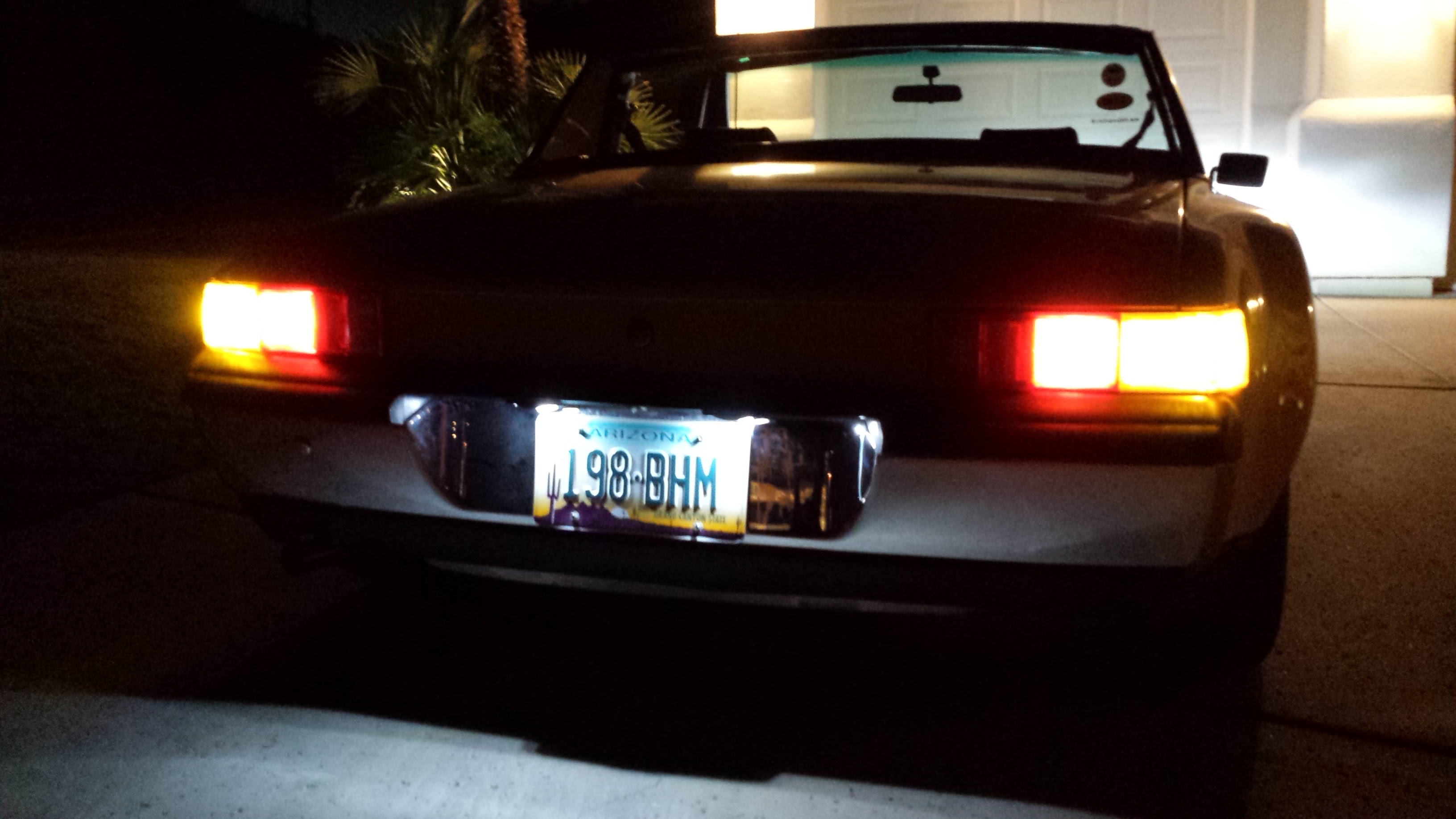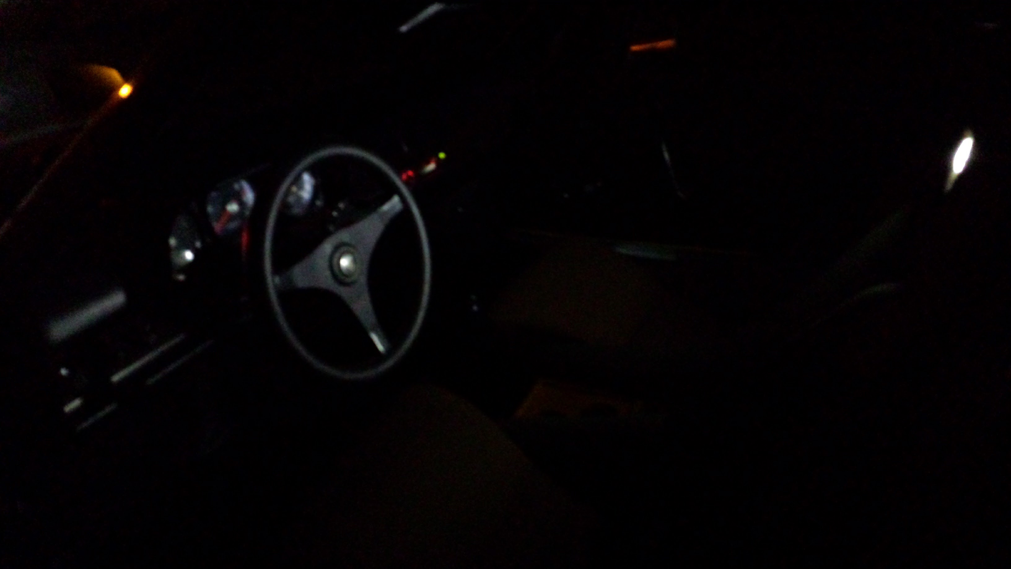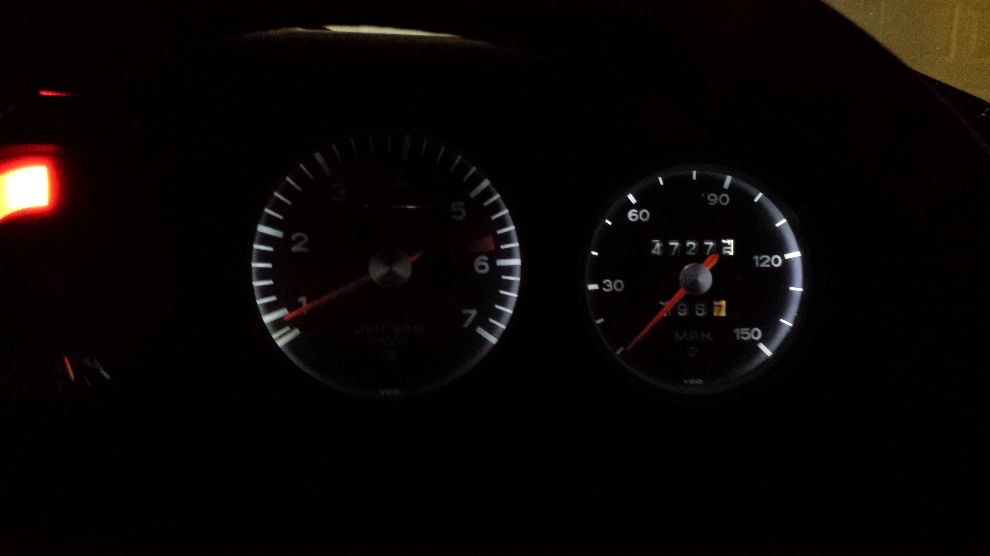 My purpose was twofold: better lighting, and lower current draw. I hoped with the lower current draw that issues I've had with parasitic alternator drag pulling down the idle with the lights on would be improved. Both goals were definitely accomplished. With the stock incandescent lights, if you have the lights on and you're using the low beams, the current draw from all of the lights (marker lights, F/R parking lights, headlights, license plate lights, trunk light, instrument lights) is 19.5 A at 12.8 V. Replacing those lights with the LED's I described above results in a current draw of 5.0 A, a reduction of 14.5 A (~75% reduction). For the first time since I've owned this car, turning on the lights has no effect on the idle. You could probably do the same thing by changing the alternator to a 70 A or the 160 A conversion, but you wouldn't get the improvement in lighting and it would likely cost a lot more. I can even turn on the fresh air blower, heater, or windshield wipers with the lights on at idle - though I think if I turned them all on simultaneously that would be pushing my luck too far. The lighting is vastly improved. The marker and parking lights are far brighter, as is the reverse lighting (actually useful, now). I can see things in my trunk. My interior light actually lights my interior. My instrument markings are white now and not a dull yellow. I need to build a PWM dimmer for them that works off of the dimmer knob, as right now, they're "on" or "off" (kind of how LED's work with DC voltage). Headlights are vastly improved. They're so white that when I see cars with halogen lights they look like kerosene lanterns. I'm not a big fan of the WHDZ low beams (not as uniform a pattern as I'd like), but in combo with my fog/driving lights, they're awesome. The WHDZ high beams are excellent, great pattern and super throw. IMO, it's a good upgrade for our aging cars. Superbrightled's has a nice vehicle system that will tell you all the lights you need. You can find the WHDZ lights on Amazon easily if you search for "WHDZ", they're $64 ea. Or, you can go with the Truck-Lites (~$170 ea) or the GE Nighthawks (~$220). There are some other projector-style LED lights on Amazon if you want to go that way. Some pics below.... |