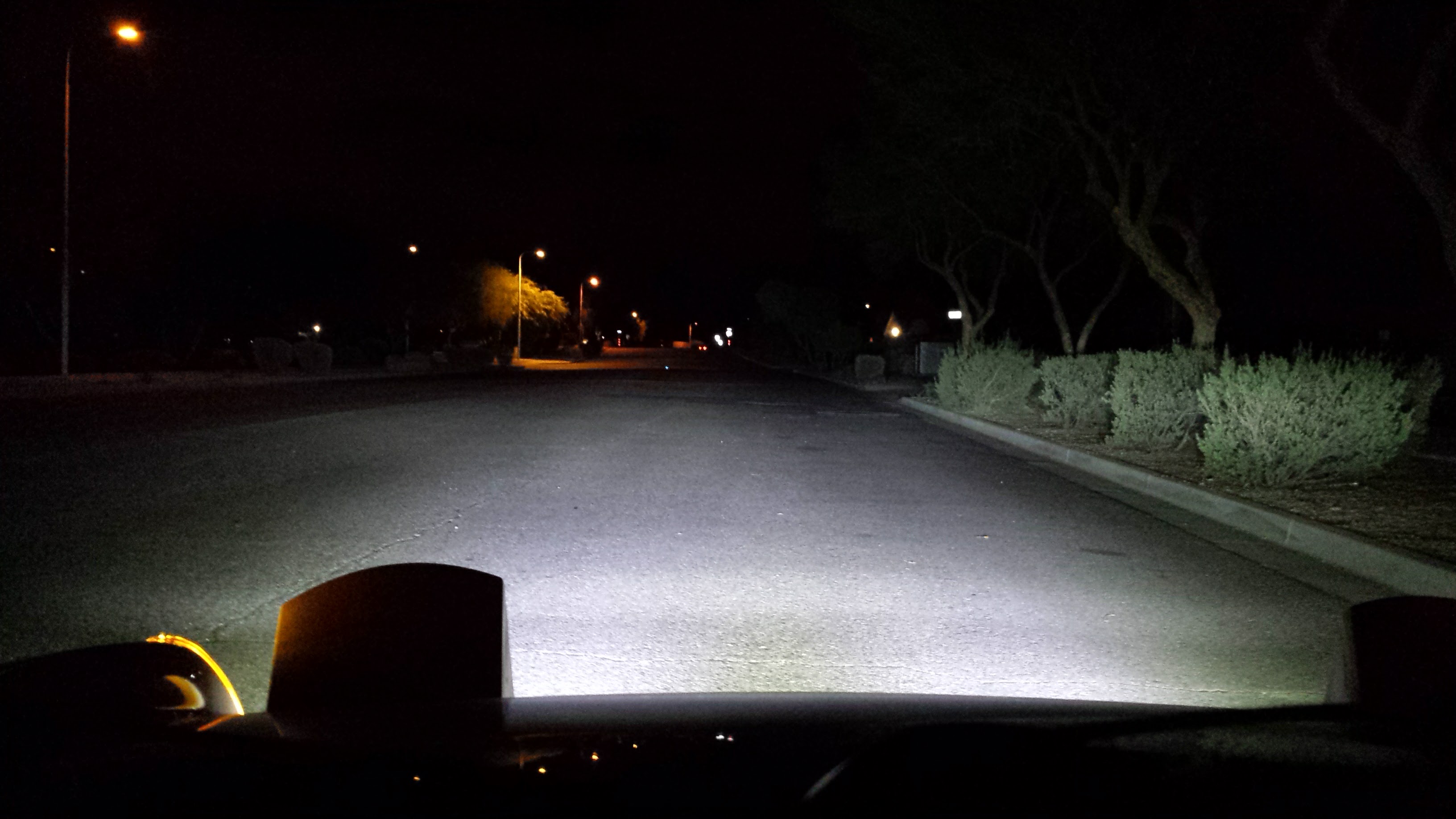 My aiming yesterday was seat-of-the-pants, I knew it was off and proper aiming would probably fix most of the pattern problems I was having. I followed the procedure in the factory workshop manual, the lights were aimed way low and the passenger light was too far to the right. Set them up correctly and the low beam pattern is vastly better. The "X" artifact is gone (it was the throw part of the pattern being imaged on the ground) and the pattern is uniform and bright. A few pics below. High beam throw is spectacular, I can see at least a half mile on a dark open road. Definitely worth taking the time to do the aiming properly, otherwise you won't get full performance from your headlights, regardless of the type.
