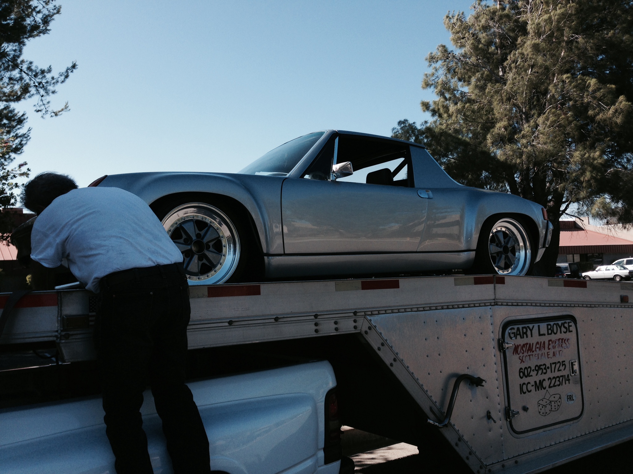 On July 4 the car was delivered to me, yay I was a happy boy. I now had the time to look at the car and admire her for her fineness. All was good in my world....except, as I had time to enjoy a few brews and look closely....almost everywhere I looked there was something not quite right. The list of strange work is long. There are issues with electrical, brakes, trans, steering and worst of all the suspension is totally wack. Well guys what you see here is the car being loaded up for a trip to Phoenix. I am biting the bullet here and sending her to Jim Patrick @ Patrick Motorsports because I simply do not trust how the car runs drives and brakes. Jim has offered to go thru the car and make it right. Who knows what else Jim he will find that is screwy....I know this will co$t but WTF I am in too deep anyway. You should be in good hands with Patrick Motorsports. He has turned out more killer 3.6 914's than anyone. I used to live in AZ and my favorite past time was drooling over the awesome 914's in his shop. |