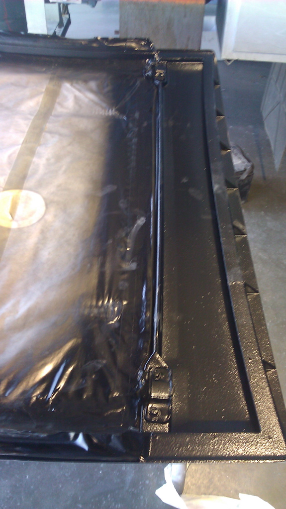 finish is black with a matte clear coat.... came out just about the way I had envisioned as far as finish color. I am quite pleased. Now just awaiting my new rear and side targa top seals to finish it off. (IMG:style_emoticons/default/biggrin.gif) one thing that I did notice, the new top is noticeably lighter in weight than the old top....I guess that pebble finish had some weight to it (IMG:style_emoticons/default/smile.gif) Attached image(s)