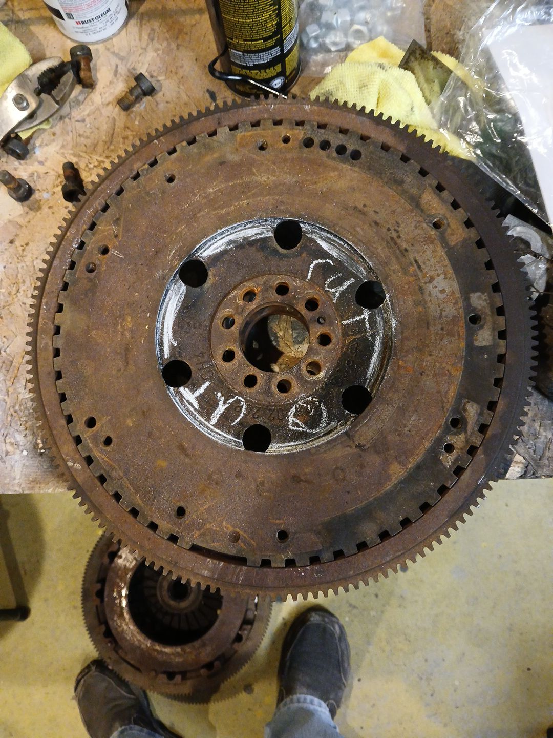 I have been busy with this thing. In doing the research I rapidly realized 928 guys and Boxster guys do not seem to work on their cars or really know much about how they work. Getting information was a long slow process. I was able to come up with a group of parts to make the first phase of the project work. What is pictured is a late 928 manual trans flywheel for a single disc clutch, The ring gear is from an early 928 auto trans and the pressure plate is for the Boxster. By the way, it was a direct bolt up to the 928 flywheel.