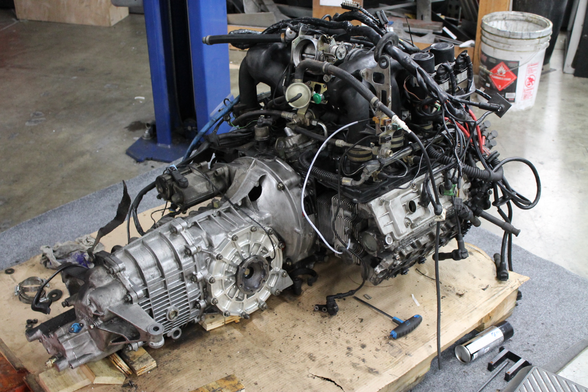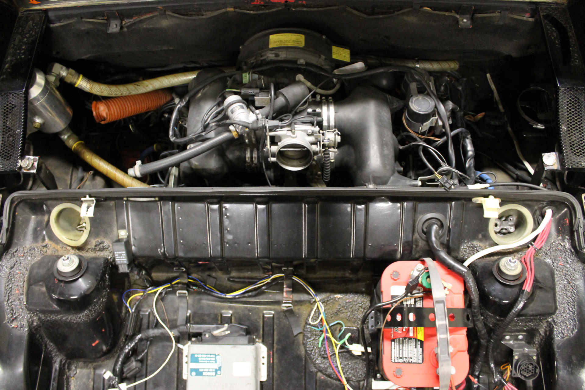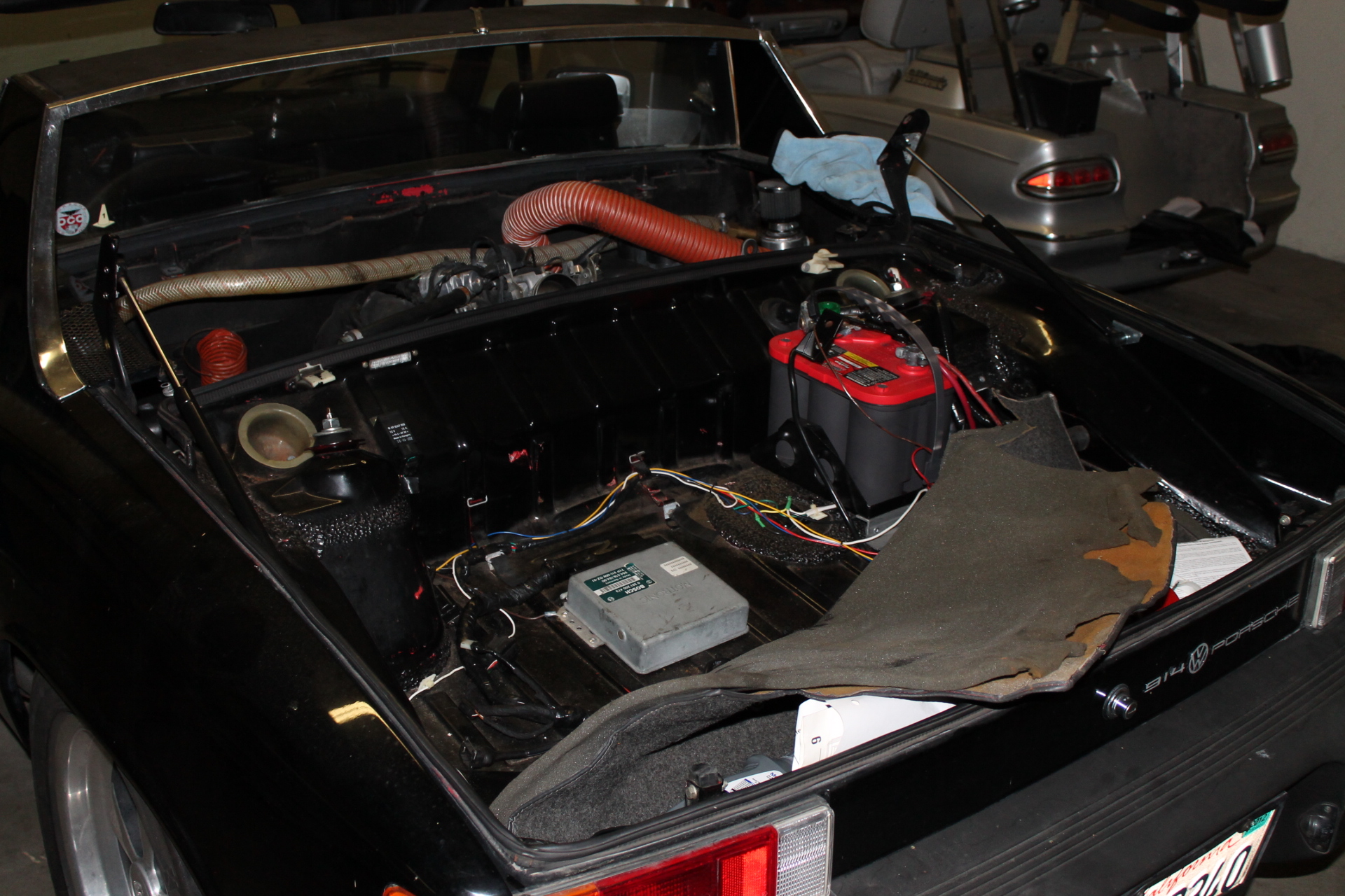 External breathers are necessary, unless you can run the engine breather line to the oil tank. Since you are changing to a stock 6 oil tank, the line from the center of the engine goes to the tank. Another breather line from the tank, generally went to the airbox on a CIS motor. I'm not sure if the same type of setup was used on the 3.6. Since the engine develops internal pressure (blow-by), the crankcase & oil tank must be vented .. whether to the intake of the engine or an external breather/catch-can. And the VAF in the picture is upside down. Richness or leanness of the fuel mixture is determined by the ECU. The VAF measures the airflow to the engine and sends the signal to the brain that determines the length of pulse to the injectors. The distance from the VAF to the engine shouldn't make a tremendous difference ... it's only air. Un-metered air after the VAF (intake leaks) will adversely effect mixture. Awesome Ron, I will be running a stock /6 tank, so I'm going to do exactly that. Connect the line from the center of the engine to the stock tank, and then the other to one of the breathers. Essentially, if I can eliminate one of the three breathers, I'm very happy. Now, it still remains to be seen if all this can be done, because it all depends on whether or not I can get rid of the modified tank up front. Furthermore, I'm not sure what the blue canister with the silver top in this photo is? It does have a lead to it, maybe a sensor of some kind? |