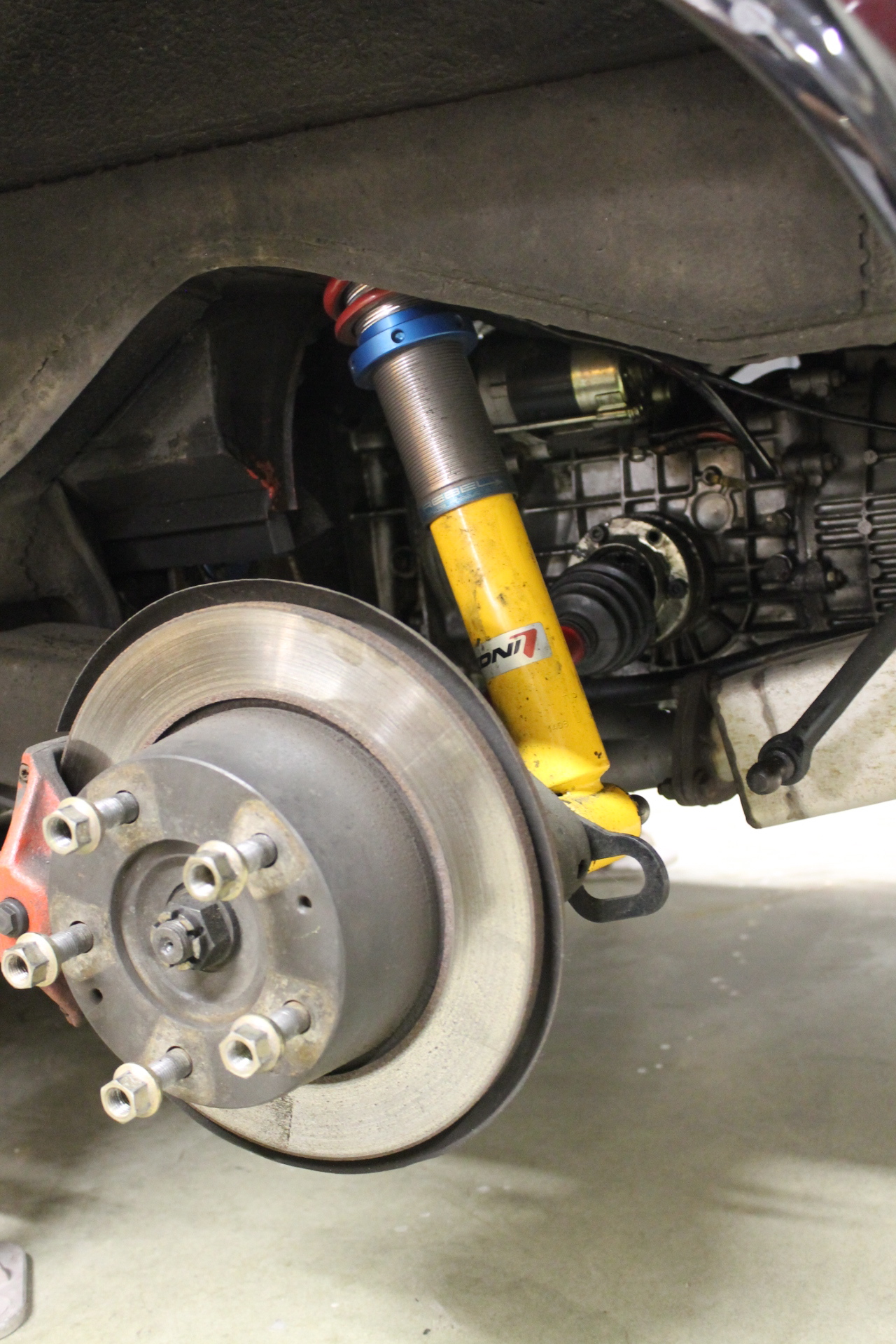Continuing on with the progress (I'm trying to get in a few hours each day), I've moved the two cars next to one another, and I'm preparing to start taking components off for wrinkle black powder coat next week; sheet metal, a few plates that I plan to fab up to organize all the electronics, etc. As for today, my Father and I lifted up the car to try to resolve the shifting issue the 915 had before, and actually fixed it successfully! And by 'We fixed it' I mean I sat in the car and went through the gears as my Father actually addressed the problem. (IMG:style_emoticons/default/slap.gif) While under the car, I discovered it is actually equipped with Koni adjustables in the rear, so I may bring them over to my car as well. |