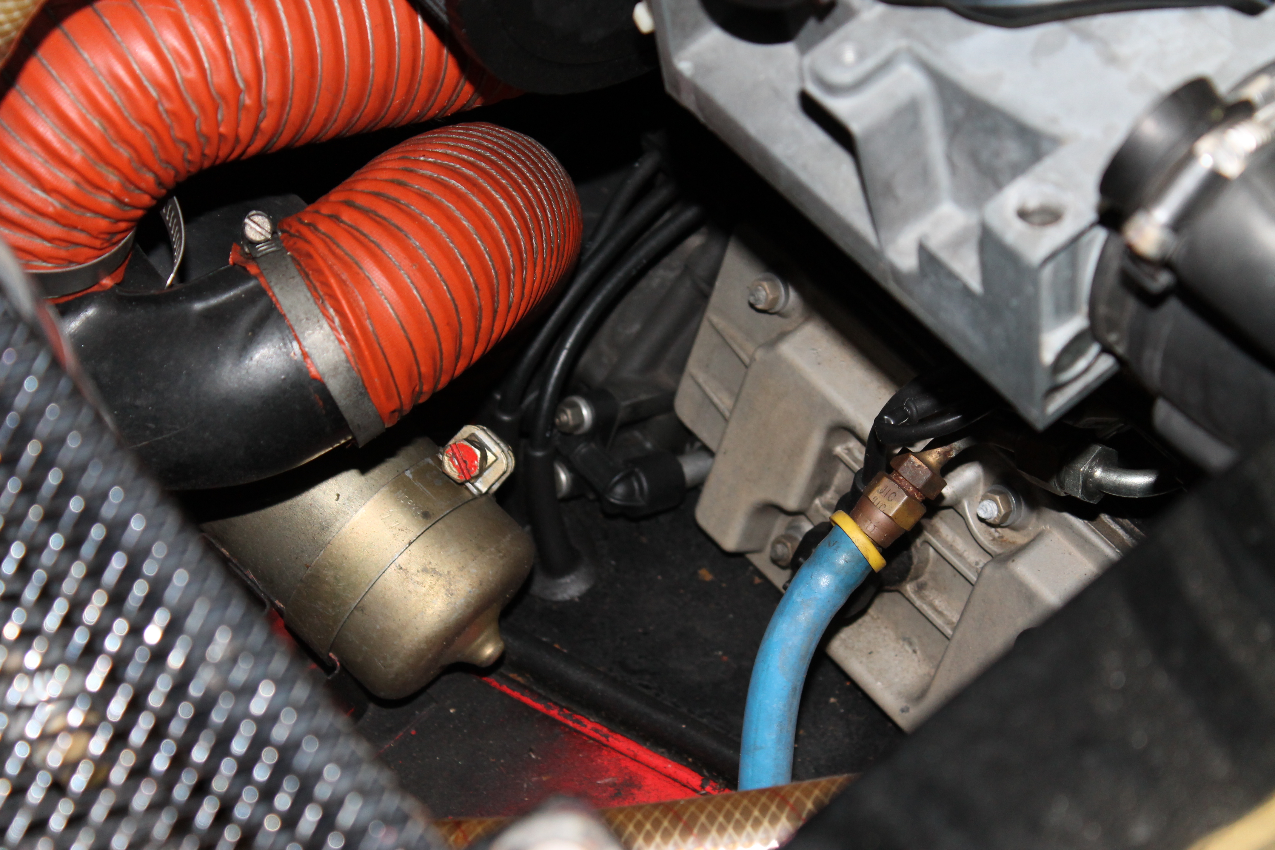 External breathers are necessary, unless you can run the engine breather line to the oil tank. Since you are changing to a stock 6 oil tank, the line from the center of the engine goes to the tank. Another breather line from the tank, generally went to the airbox on a CIS motor. I'm not sure if the same type of setup was used on the 3.6. Since the engine develops internal pressure (blow-by), the crankcase & oil tank must be vented .. whether to the intake of the engine or an external breather/catch-can. And the VAF in the picture is upside down. Richness or leanness of the fuel mixture is determined by the ECU. The VAF measures the airflow to the engine and sends the signal to the brain that determines the length of pulse to the injectors. The distance from the VAF to the engine shouldn't make a tremendous difference ... it's only air. Un-metered air after the VAF (intake leaks) will adversely effect mixture. Awesome Ron, I will be running a stock /6 tank, so I'm going to do exactly that. Connect the line from the center of the engine to the stock tank, and then the other to one of the breathers. Essentially, if I can eliminate one of the three breathers, I'm very happy. Now, it still remains to be seen if all this can be done, because it all depends on whether or not I can get rid of the modified tank up front. Furthermore, I'm not sure what the blue canister with the silver top in this photo is? It does have a lead to it, maybe a sensor of some kind? Trying seeing if there is a name on it. If it's Oberg ... it's a micro-screen filter with warning light. In either case I can see it gets power and is grounded. |