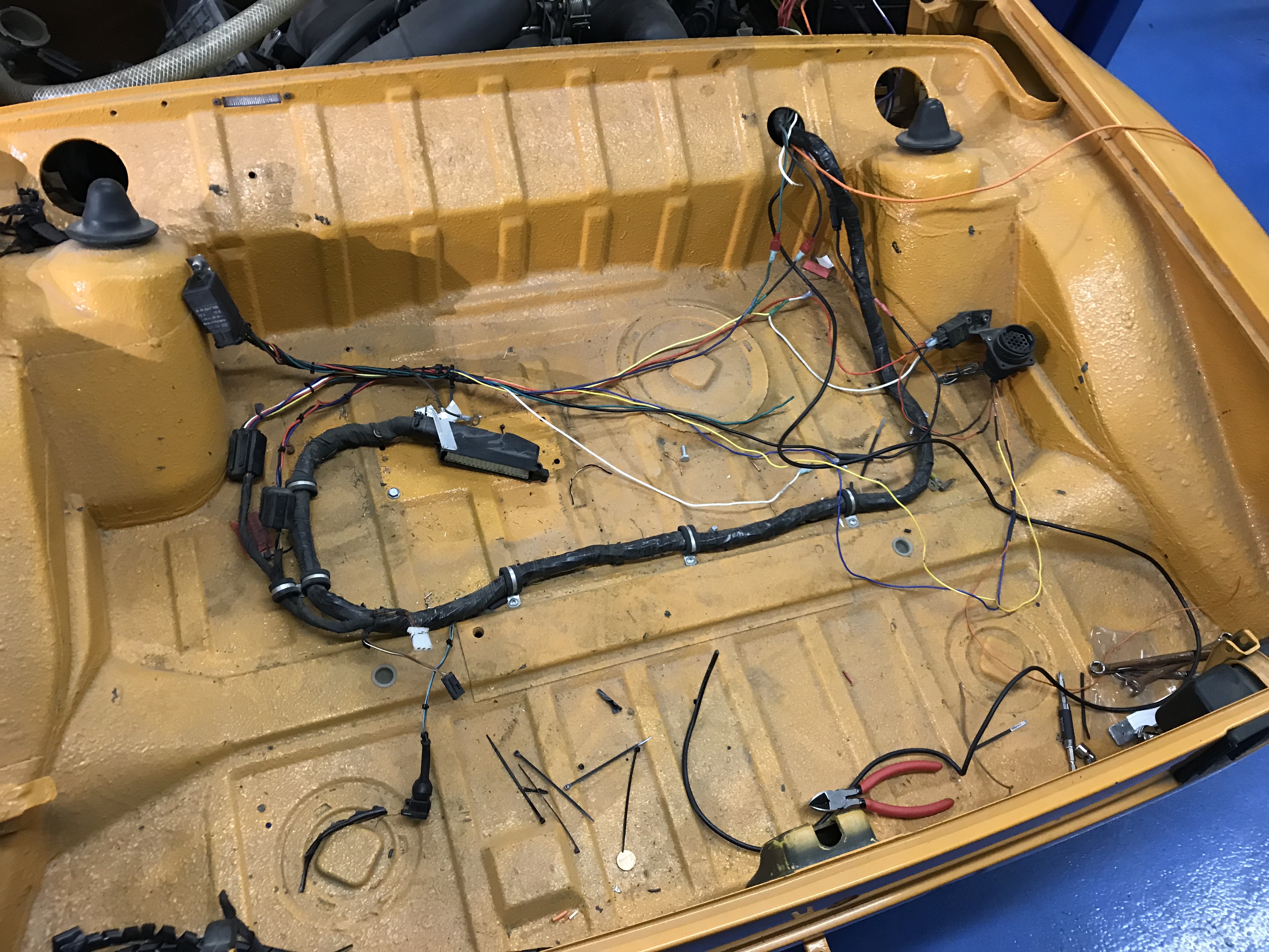 The car was sidelined once again last year, and I was resolved to have it finished by a professional shop. I originally took it to CPR in Fallbrook, CA to have them look at what needed to be done. I'm sad to say I wasn't very impressed with their previous work, but much less so with their communication, sales team, and customer interaction. After about 6 weeks of stalling, missed emails, etc. I was finally able to recoup the car. After that incident, both my Dad and I are determined to get this up and running over the next few weeks. After about a month of reorganizing, finding parts etc, we got to work last weekend and put in a good 8 hours on the biggest of the tasks, electrical. Really proud at how this is coming together, and as well as amazed how easy it is when you have two people who know these cars very intimately. In the course of a day, we were able to have the headlights, turn signals, hazards, and starter working. It's pretty cool to hear it turn once again with the high-torque starter, I had forgotten how that sounds. In addition, we decided to nix the idea of having the ECU in the back, and have begun relocating it to the cab below the seats (expecting the passenger seat, but any input would be appreciated). Going back to his ranch today, and hope to finish where we left off last week, connecting the aux oil cooler and relay, fuel pump relay, and begin reconstructing the harness with the dash loosely mounted. |
