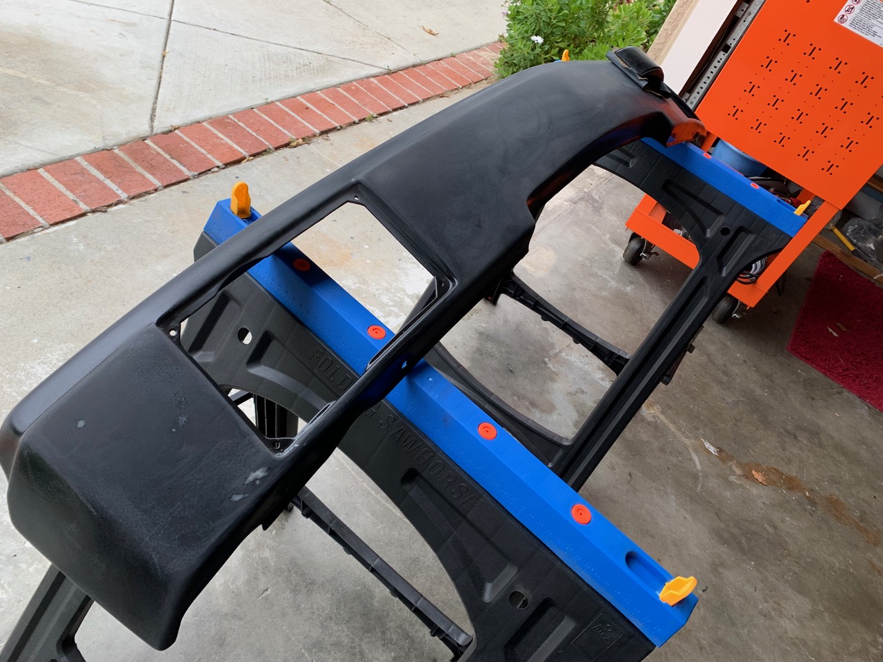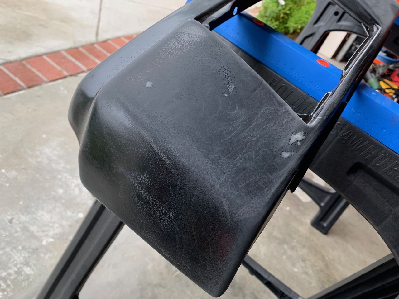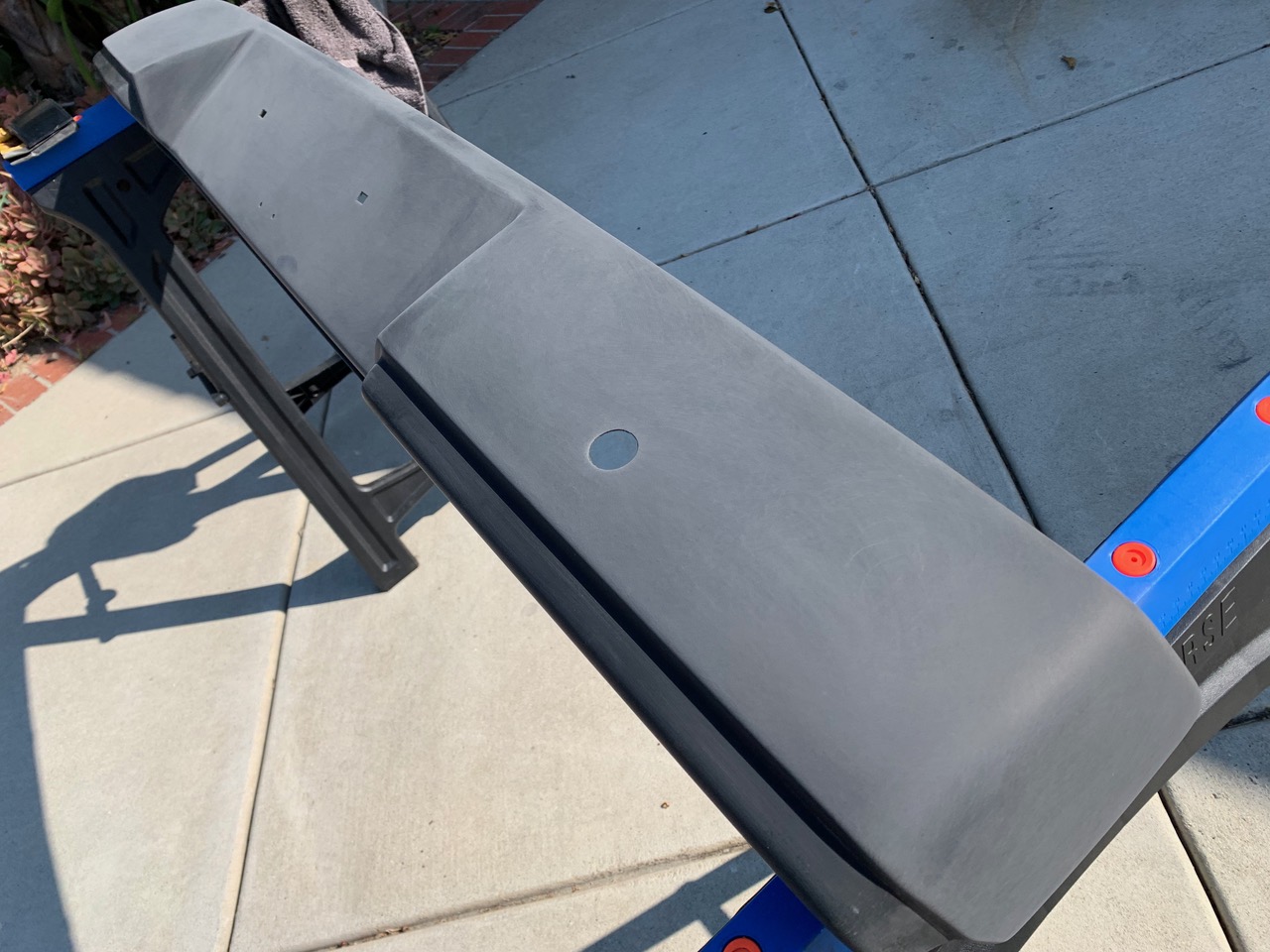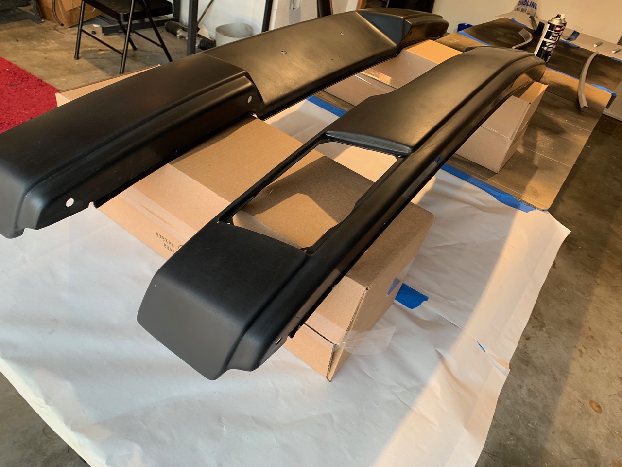 Last-weekend, I was able to carve out some time to give the bumpers a final-pass before paint. Though I had originally planned to spay them with a paint-gun, I have had great experience with SEM in a can lately and figured I would give it a try and use this coat as 'primer'. I'm happy to say that if these are given the right amount of prep, use adhesion promoter, and painted in the right-environment the 'rattle can' approach is VERY good. As with anything paint / bodywork related, you get what your pay/prep for. Previously, these were cut, modified and blended for my GT Cooler and then sprayed with 'feather-fill', so they only needed a bit of polyester for a few small details. I stayed away from the pneumatic and electronic tools (jitter-bug) to avoid any accidents. With the polyester-filler placed in certain spots, I started off with 480 grit, then moved to 800 and finished with 1000 wet/dry. Final prep was with a bit of scotch-brite. Then, 2-coats of adhesion promoter. A 10-minute wait, and I finished with 3-coats of SEM 'trim-black'. About 1-can per-bumper, though I also painted my sail-panel trim during this session. Note - To give those less-experienced with bodywork, I'de like to give you an idea of the labor put into this. Everything described in the paragraph above, from beginning of prep to painting, took about 6-hours. This does not including the shaping and initial bodywork done previously. It's fair to say that, depending on the condition of your bumpers, starting a project like from scratch can easily take 20-hours of work, without factoring in disassembly/reassembly, sourcing the paint and supplies (not to mention material-cost), and rework. Just my feedback, but I would factor that into your estimation when considering how long this will take, doing it yourself, or contracting. Pro-tip: See the last-photos of the bumpers staged before painting? It would have been much easier if I would have 'rotated' each bumper 180º so they would face 'out' due to the 'curve'. Something I realized 1/4 of the way into painting. Rear bumper - top toward the painter / Front bumper - bottom toward the painter ** Edit: Weird, I thought I had some 'after photos', but everything is during prep and setup. I'll have to add some later. ** |