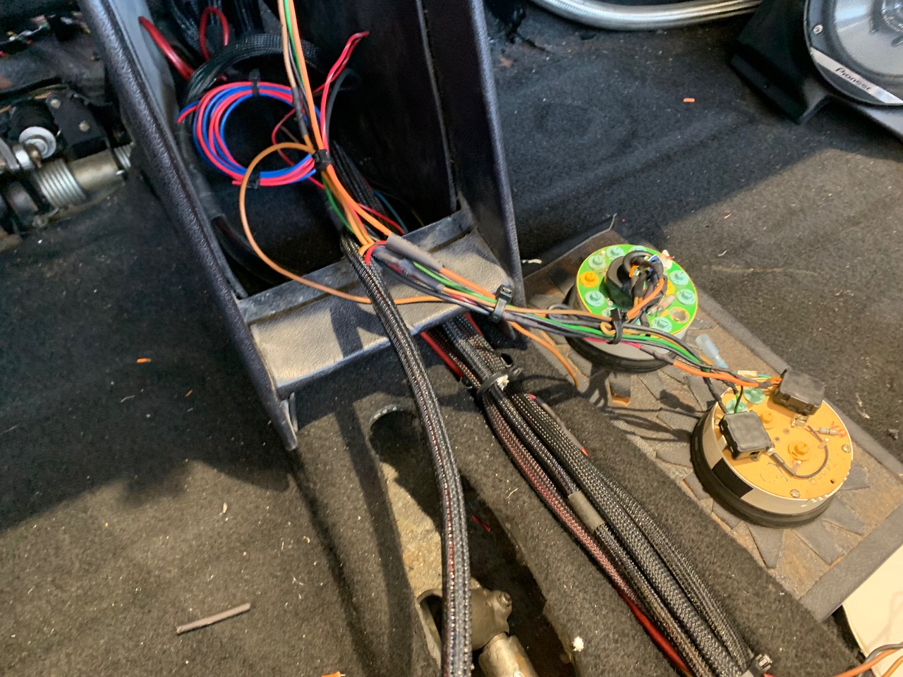 Since my last post, I've been hot on the car, stealing an hour or two whenever I can. Alot of progress was made after I picked it up from it's last-session at European Motorsports. We seem to have developed a pretty good cycle of dropping the car off to get items functioning, and then I take out back to the garage to clean up or sort everything out. At this point, the motor is functioning normally, as well as the gauges and status lights (Check engine, Fuel gauge and Light, Alternator Light, Oil Pressure, etc.). Though it came back as a 'rats nest', I'm very happy with the result in sorting it all and making a new section of the harness.