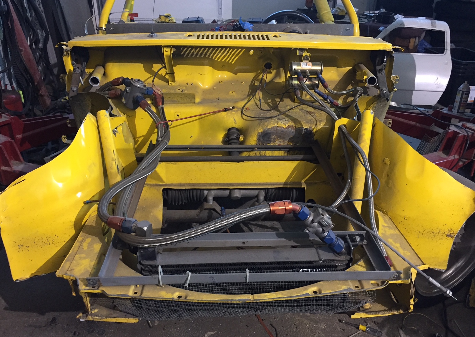 I was only to get a half day in today, had to leave early for a daughter orthodontist appointment, but tomorrow I will be alone at the shop to I can keep the momentum going. I was able to cut away the top of the cowl and the hinge area, ran out of time on the steering column area, going to leave as much of that as I can because I don't know how much I will need and where everything will align with the new dash.