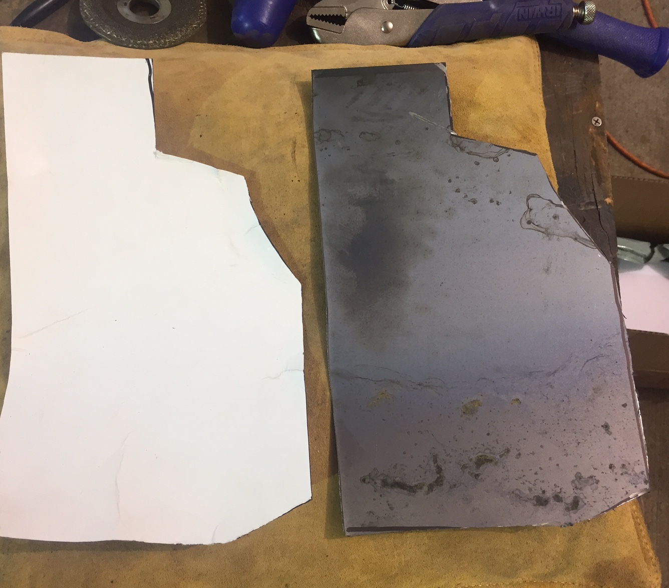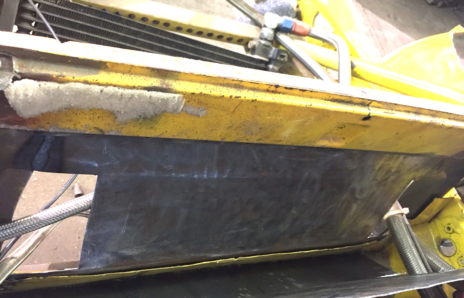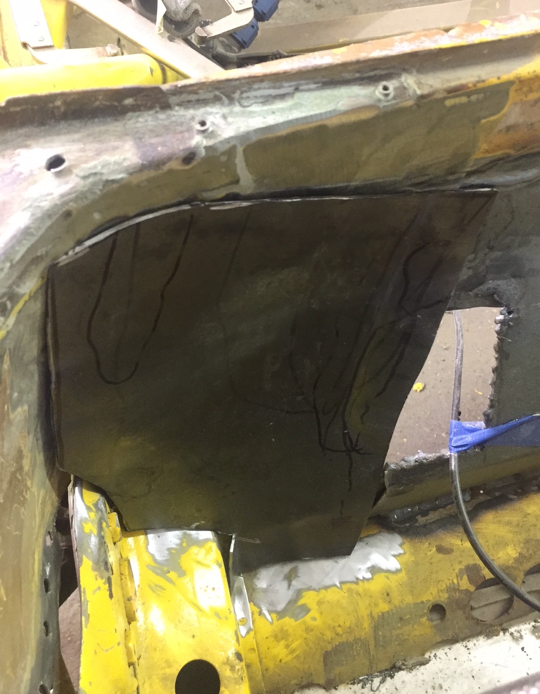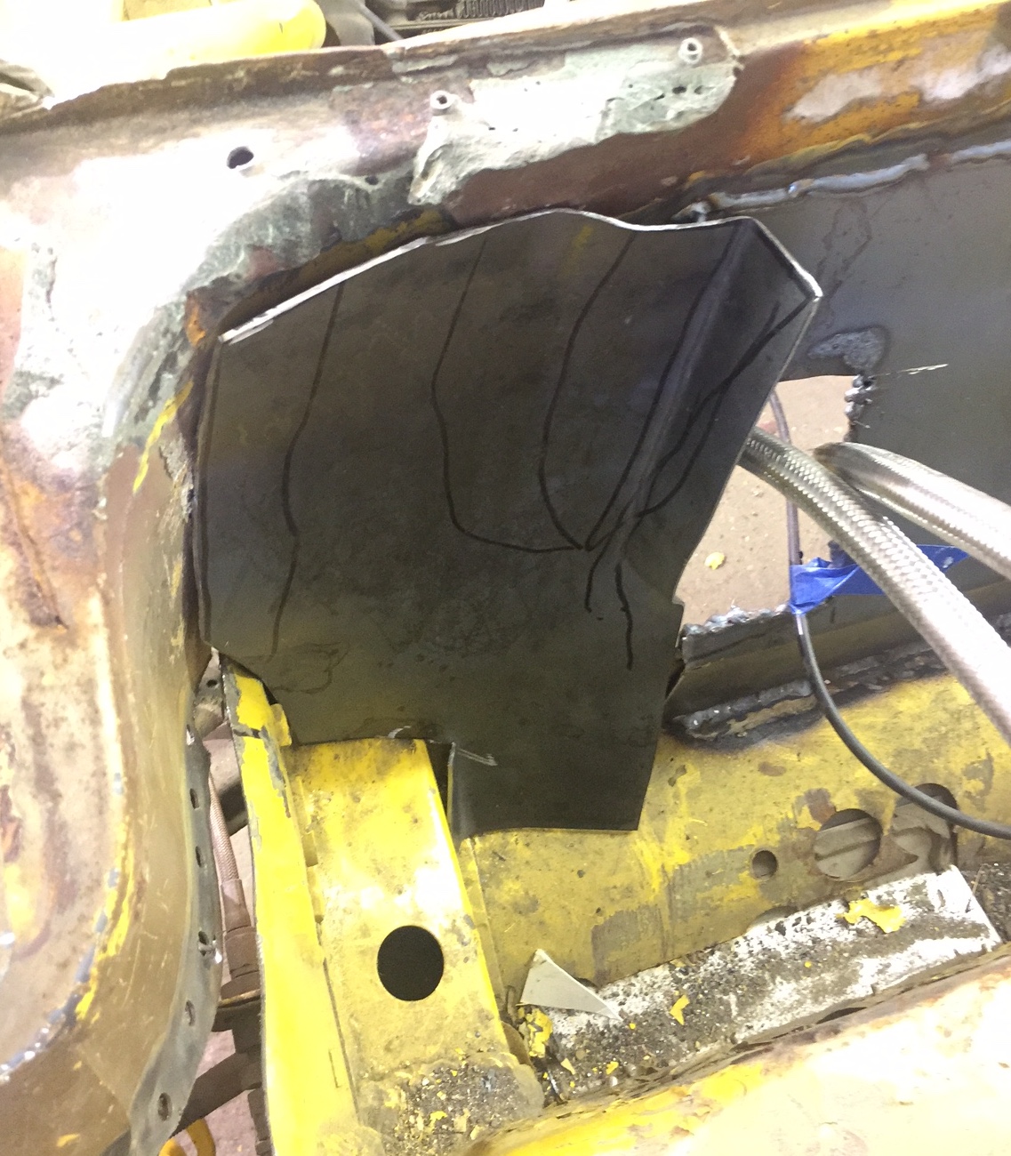 My wife was having friend's over today so I got to slip away to the shop. It doesn't look like much but this piece curved in about 5 different directions, so it was a lot of fitting, banging, fitting, wheeling, fitting, banging, and finally welding it in.