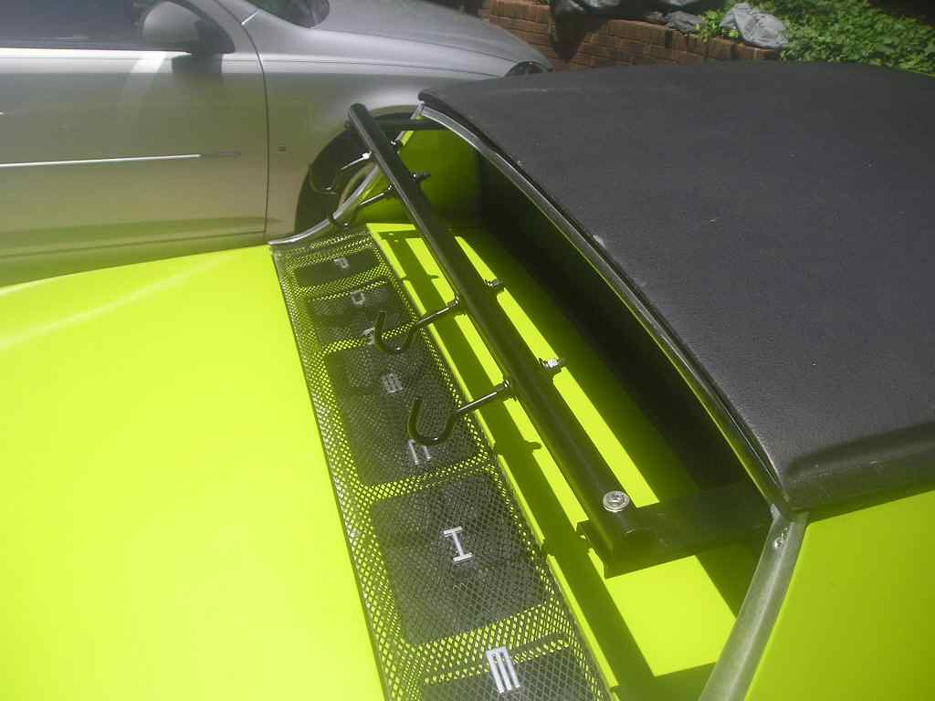![]() ![]() I used old Yakima parts i have had forever, and the engine lid has been reinforced under the fork mounts....will need to control the pedals to keep them from hitting the trunk lid, and may have to add a scratch preventor plate under the fork mounts after the car is painted! I think this is a good solution. I can add 2 wheel holders to take the front wheels, or put them in the trunks |