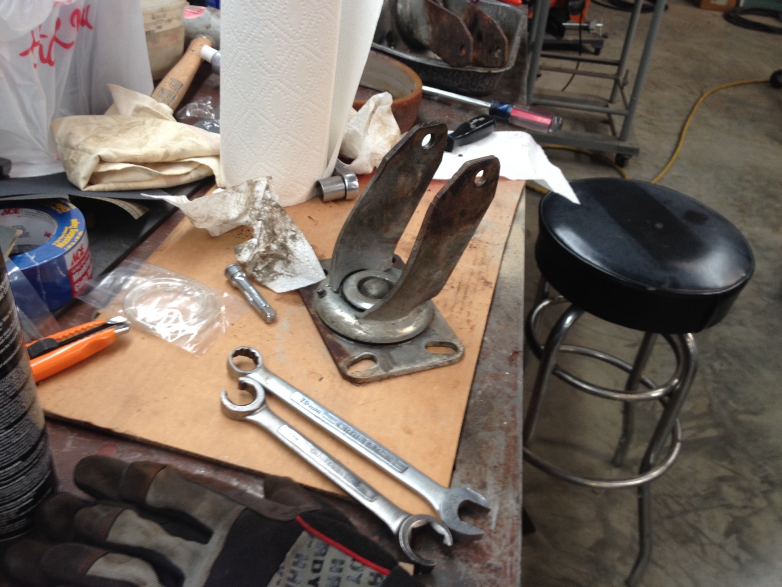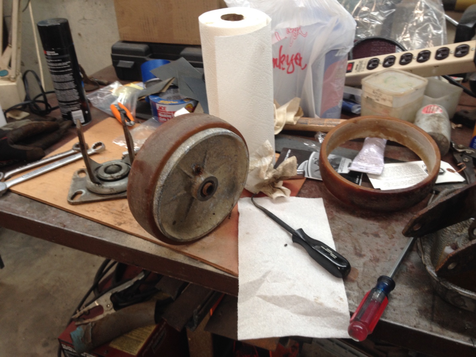 The casters have ball bearings in the swivels, and roller bearing on the wheel shafts. They were totally gunked with dead grease. So we totally removed and disassembled the casters. Sorry for the blurry pic. The brake was rusted to the point of not working The poly tires were loose and wouldn't stay on the aluminum wheels Attached thumbnail(s) |