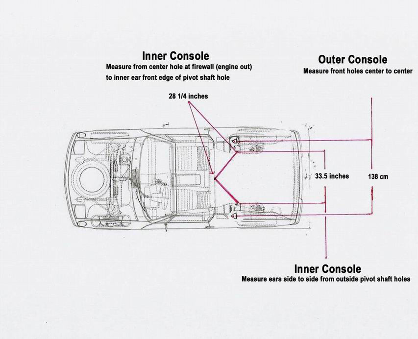 This is what you are looking for.............. These measurements were taken from an undamaged car and cross referenced to mine. The measurements on the inner ear will vary car to car due to rust, collison, console fatigue etc. Expect a 1/4 variance when you go to take measurements. Those inner ears take a beating over a lifetime. By triangulating from the hole in the firewall to both right and left ears you will not have a problem when you are ready to set the camber and toe. Using the measurements in the diagram: Taking this to another level. You can get the inner console tacked in. Then mount your control arm. Use an "All-thread" with a spherical rod end or piece of tubing where your shock mounts to the control arm, the top of the All-thread goes to the shock tower with some washers. Base the length of the All-thread on your normal ride height (sitting on the ground). Then using a camber gauge check it to see where you are before you weld everything solid. Install a wheel and tire and you can also check toe while static. Attached thumbnail(s) Attached image(s)