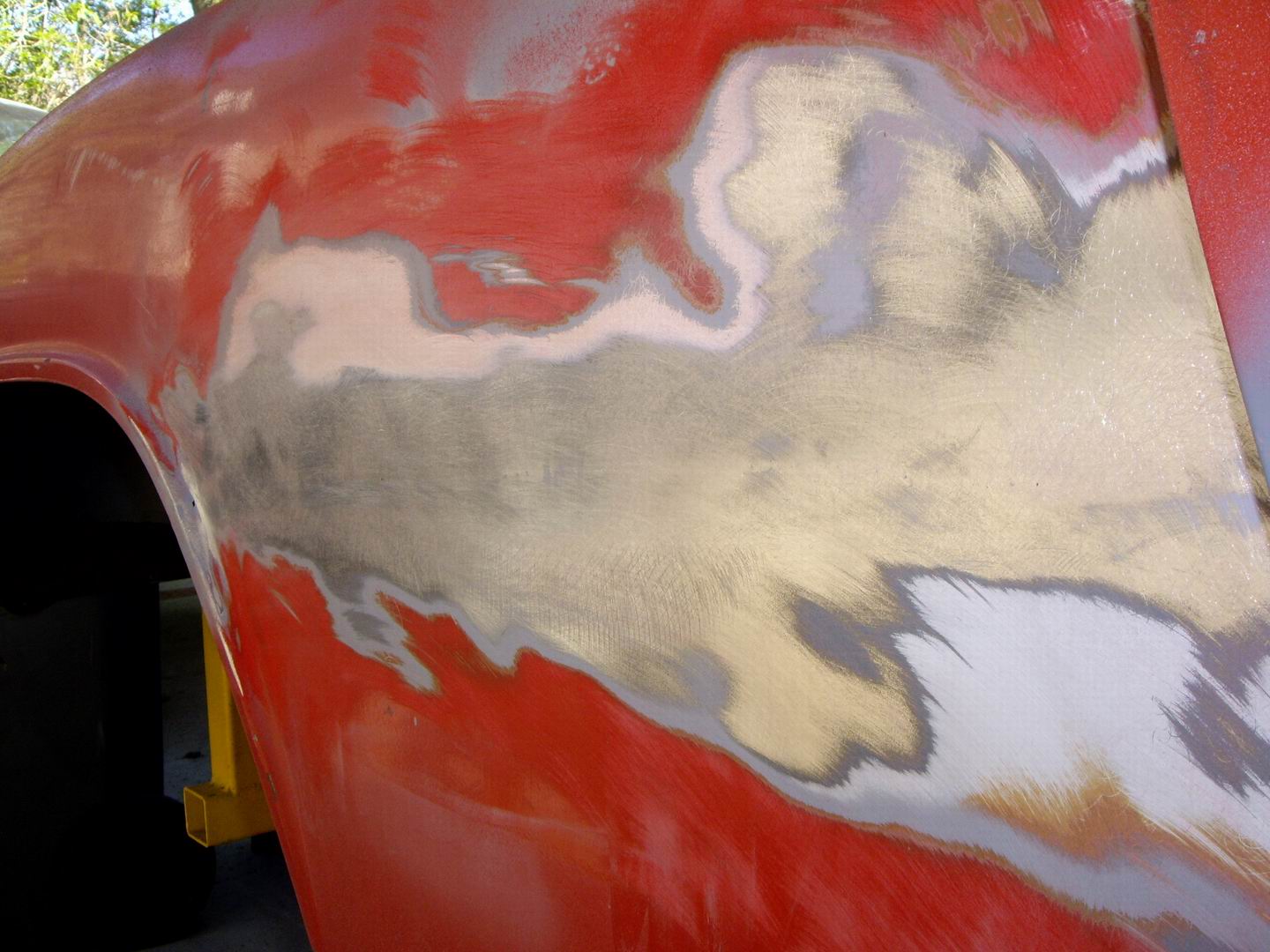 Pink filler and yellow filler. Get out the "Mud Hog". Oh well it's only a little primer wasted. The pink filler is below the color coat (copper) and yellow on top of old color where it shouldnt be. Hard to featheredge when it is like that. 6 coats of paint and primer I counted not including filler. The old filler is very thin and doesnt cause any concern. The red does as it is acrylic enamel or possibly Nason synthetic enamel and it has to go away because past experience dictates it will lift or react with solvent. It will get stripped even know the substrates are in suprisingly good condition. As far as the butt weld line there are 2 small low spots (below the pink filler) and 1 more at the lock pillar that can be bumped out with a hammer and dolly or skim coated. I have a set of steel flares and most likely will go that route although I have been talking to a fiberglass supplier that is willing to do a wide street weight version of belt line qtr panels with a reinforcement in the debris impact area. We will see? Wes, Lots of room under the wheelwell to install the pickups. All I need is a 3 inch cutoff wheel, an airsaw and a angle grinder. Attached image(s)