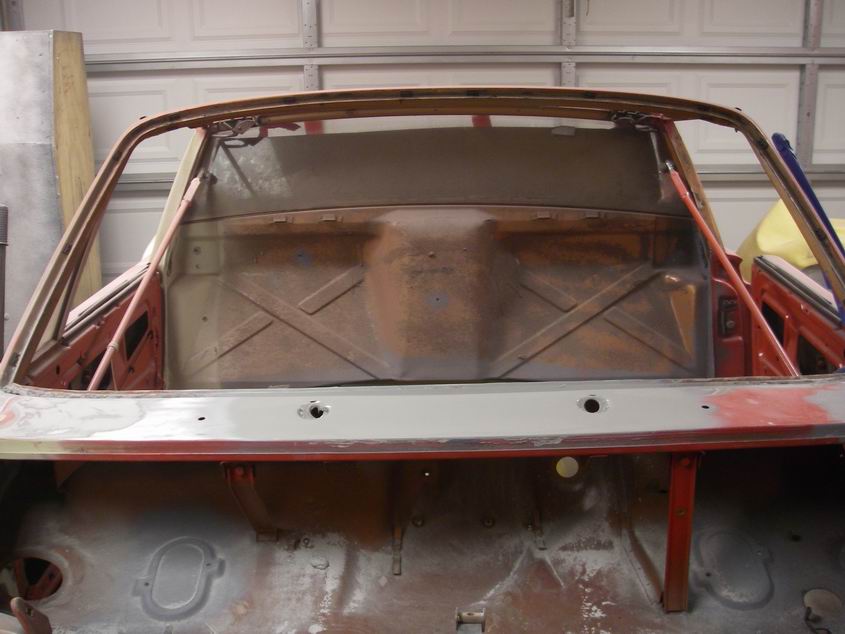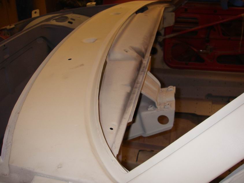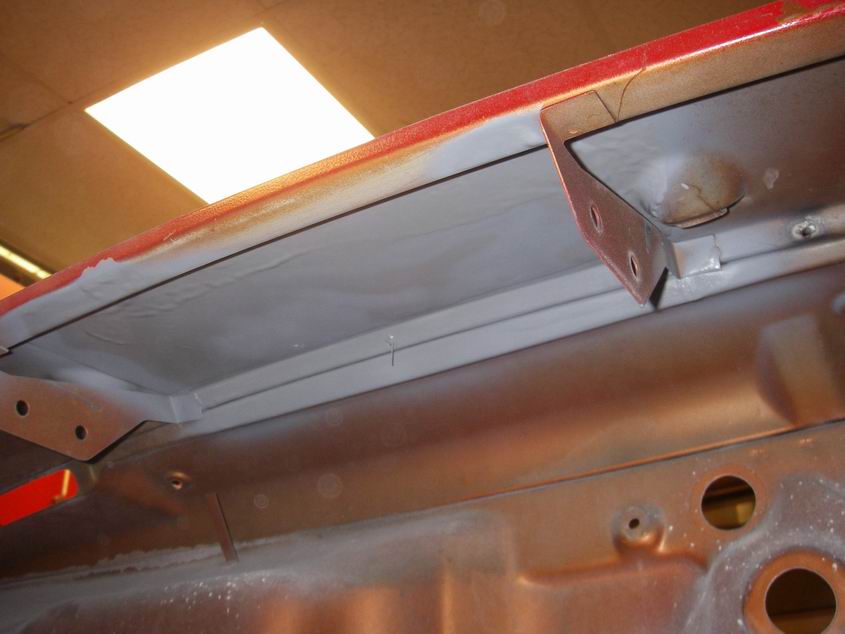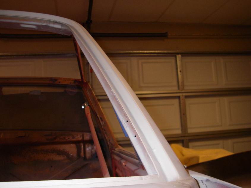 The windshield molding clip hole's are all welded up. No need for these any longer. I will use a rubber reveal molding. Pilot holes are all welded up and epoxy primed.