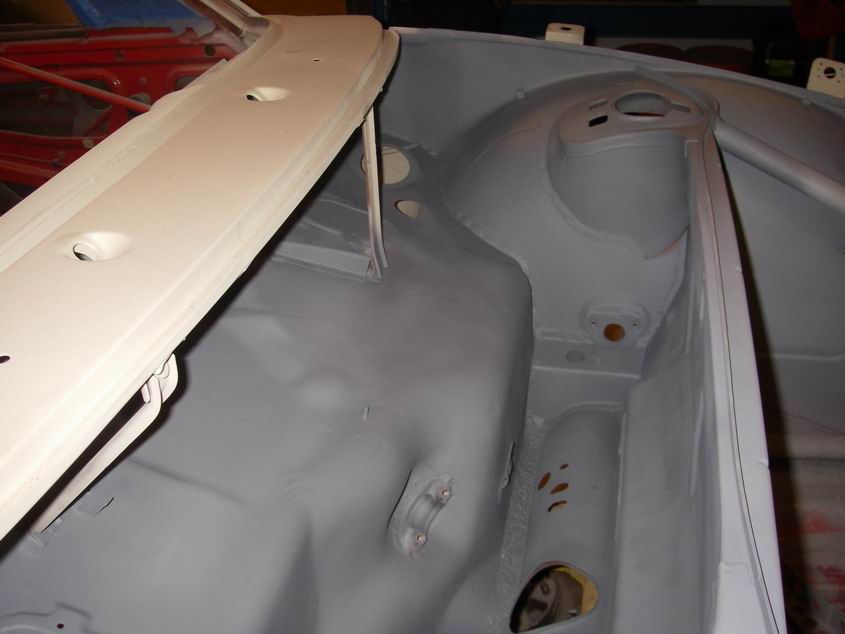 Forward bulkhead compartment denuded of seam sealer. Stripped to bare metal looking for rust. I did find some minor surface rust scale where the two bolts secure the hood lock cylinder housing. Chemical metal prep was all that was needed. Self etching primer applied. Very clean.