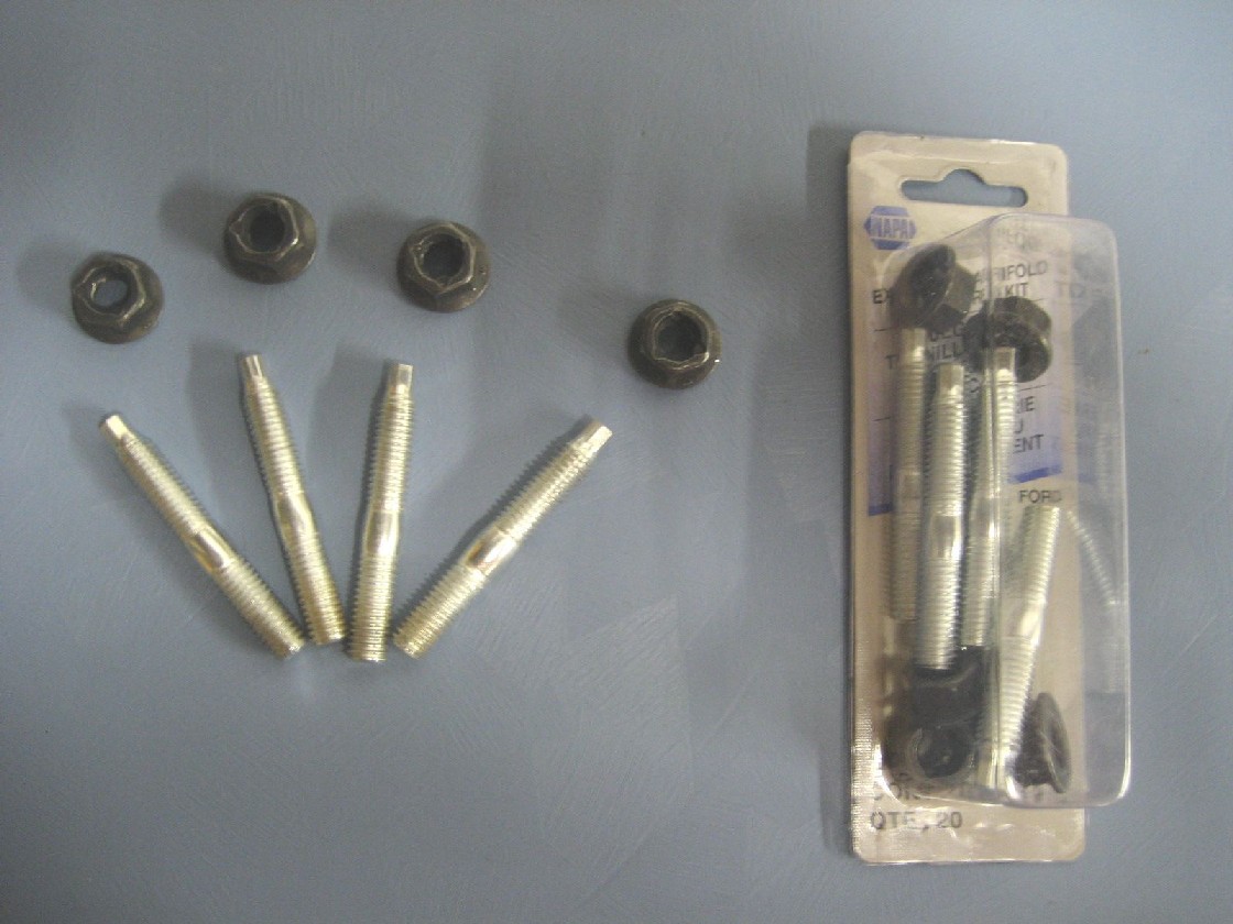 I found this package of 10 M8 x 1.25 x 62mm studs and 10 nuts pre-packaged at NAPA. Looks to be an exhaust manifold stud kit?? Studs are plated (so they won't rust) with a small hex swaged on one end. Nuts are deformed thread locking type. Studs are the perfect length for mounting the bumper with dog bones to the car, front and rear. Thread the stud through the bumper bracket with just enough thread on the backside to lock the nut and retain the stud. The remaining stud sticking out is the perfect length. You'll need 4 additional nuts and washers to complete the bumper install. Number on the package is 600-2604.