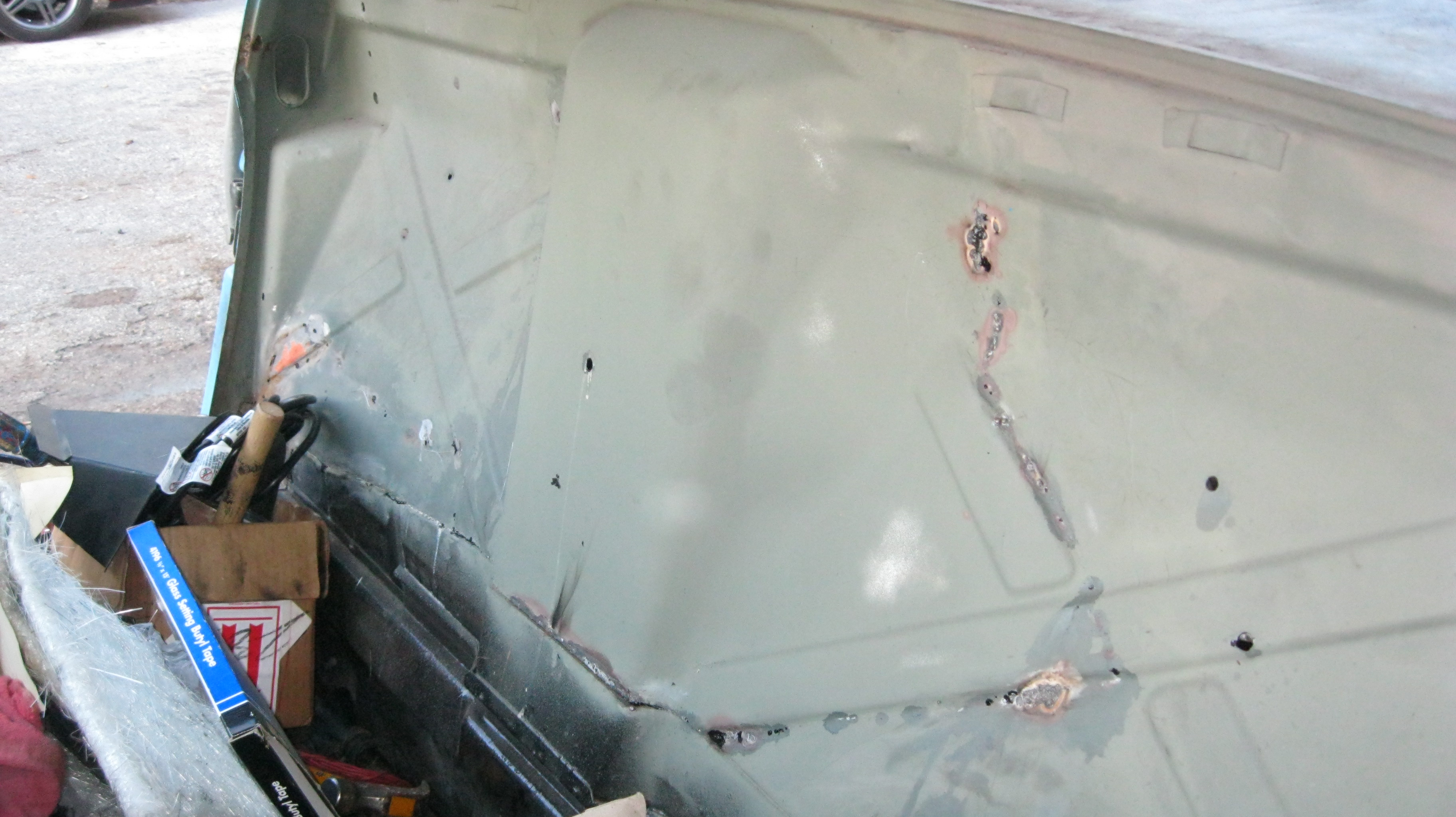 On that note - does anyone have a set of decent used pins? Or at least know where to get new ones? Also, as we really rushed to get the car back together I didn't do a good job taking pictures. I did weld the lower rear quarter panel back on with minimal flex in the metal. This was accomplished with low heat, really taking my time spacing the spot welds out and using a damp cloth to cool after each weld. I never expected it to be flush and nowhere near the quality of the work of people like Scotty B. However, I ended up with a very thin coat of Evercoat over the top, which I can live with. One day I'd like to learn how to do this without any filler at all. Attached thumbnail(s) |
