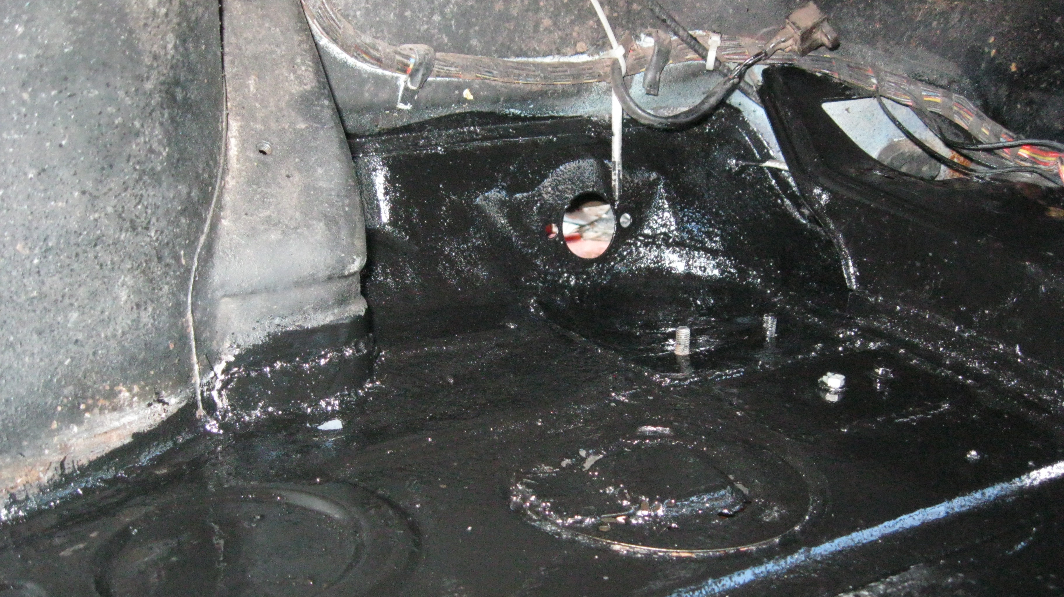 Doh! Since I guess I still haven't reached enough posts to be able to post pictures back to back, you guys will have to refer to my previous posts to see how back the pedal area was. This picture is the area welded up and POR'd. This actually was one of the easier pieces to fabricate! Cut it out, and basically just hammered with a ball peen and a piece of wood with a valley in it till I got the shape right. Don't skimp in this area - use good heavy gauge steel. One, to give some wiggle room in case it rusts in the future (doubtful). But also because there is PLENTY of flex in the floor in this area when under threshold braking. Even though I thought I did a pretty good job here, when we were bleeding the brakes I could see quite a bit of deflection. I'm planning on putting in something similar to Chris' Tangerine Racing MC brace to help cure this.