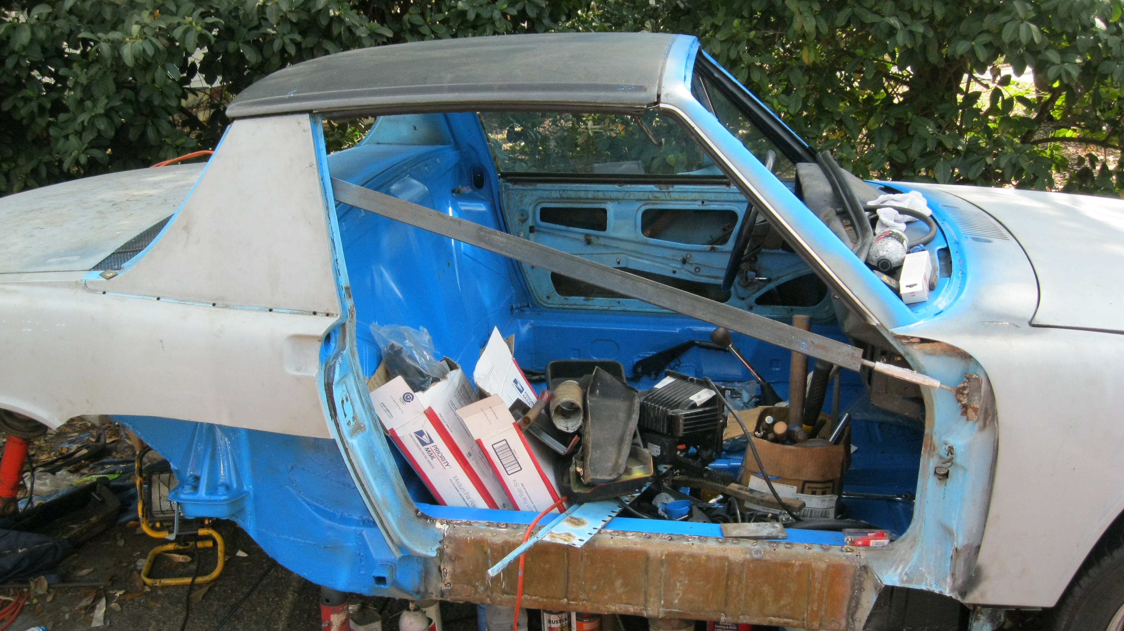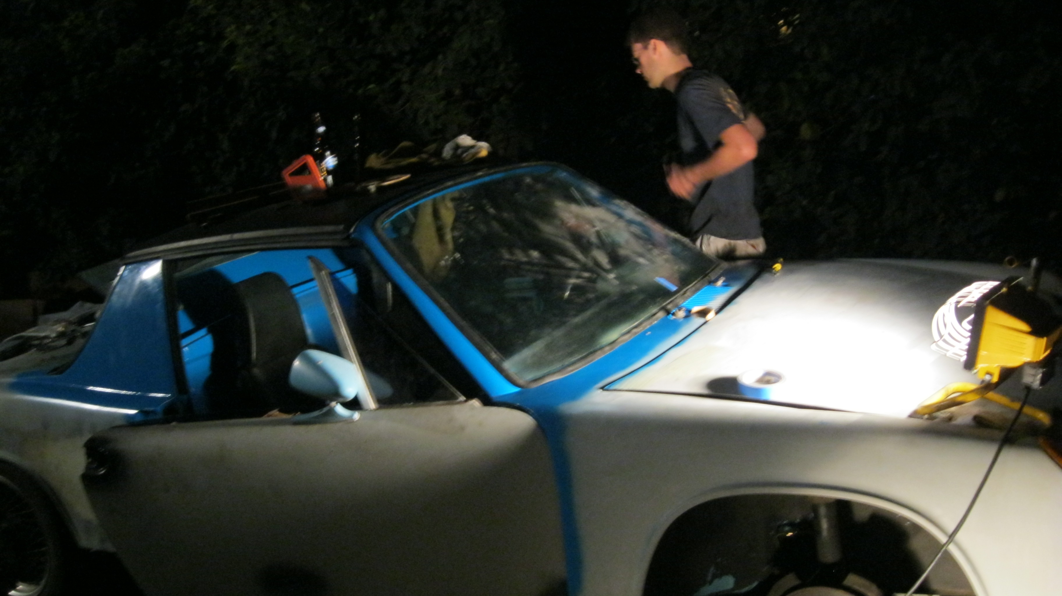 And...... PAINT! No, its not a factory Porsche color, I know. Again, in my defense there is nothing original left about this car and its a 1.7 anyway. However, I'm curious if anyone can guess the color? Hint: its domestic. Some might hate it or wonder why I chose this color, but it'll make sense later. I only did the interior and windshield areas for now using a Preval Sprayer just to get it back together. I'll go back to some of these areas later when I spray the whole car. |