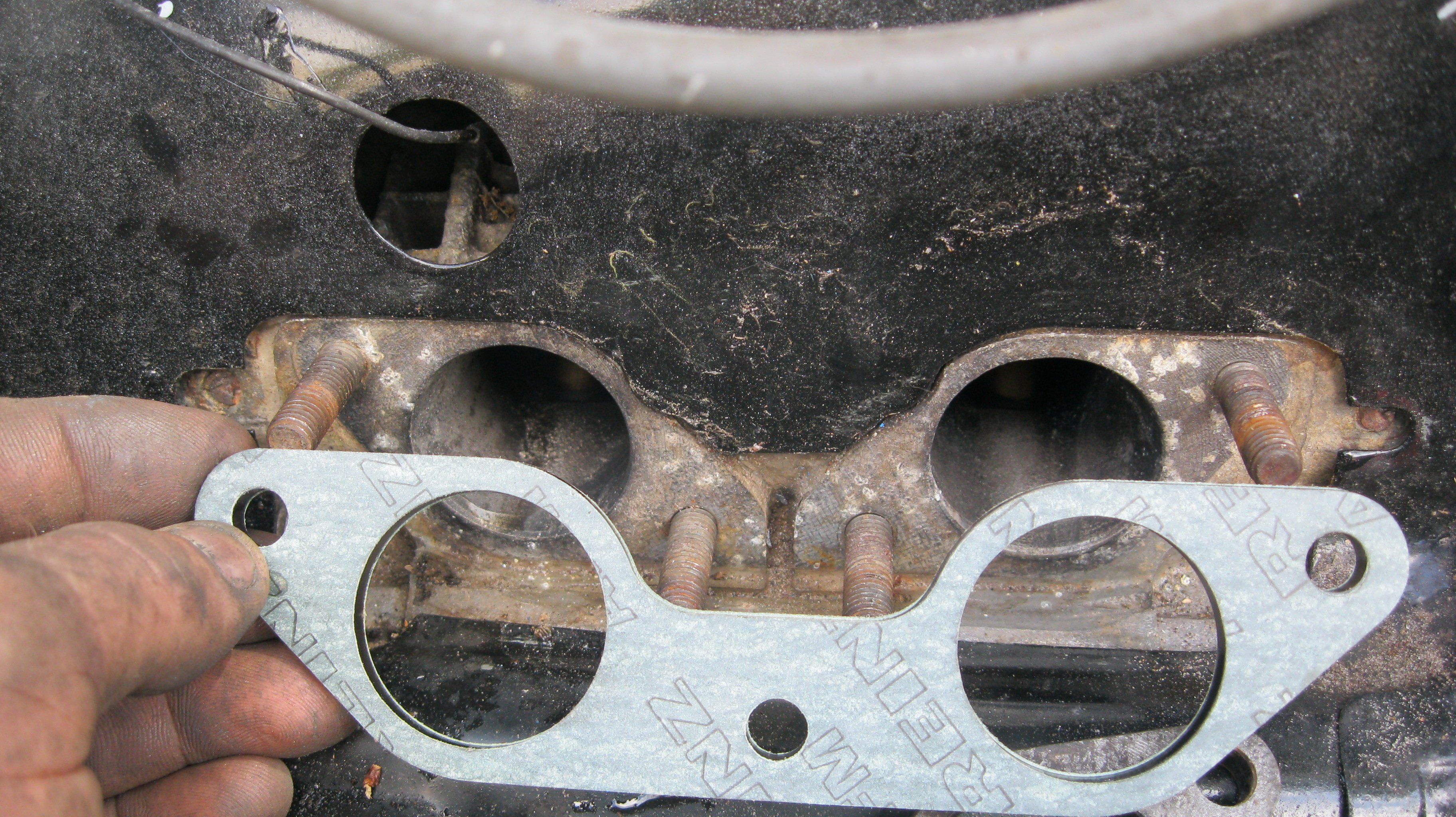 Here is something else we noticed. I ordered new intake gaskets from Pelican, which had three holes. Unfortunately this car has four studs? Did I miss something here? Ended up re-using the old ones.