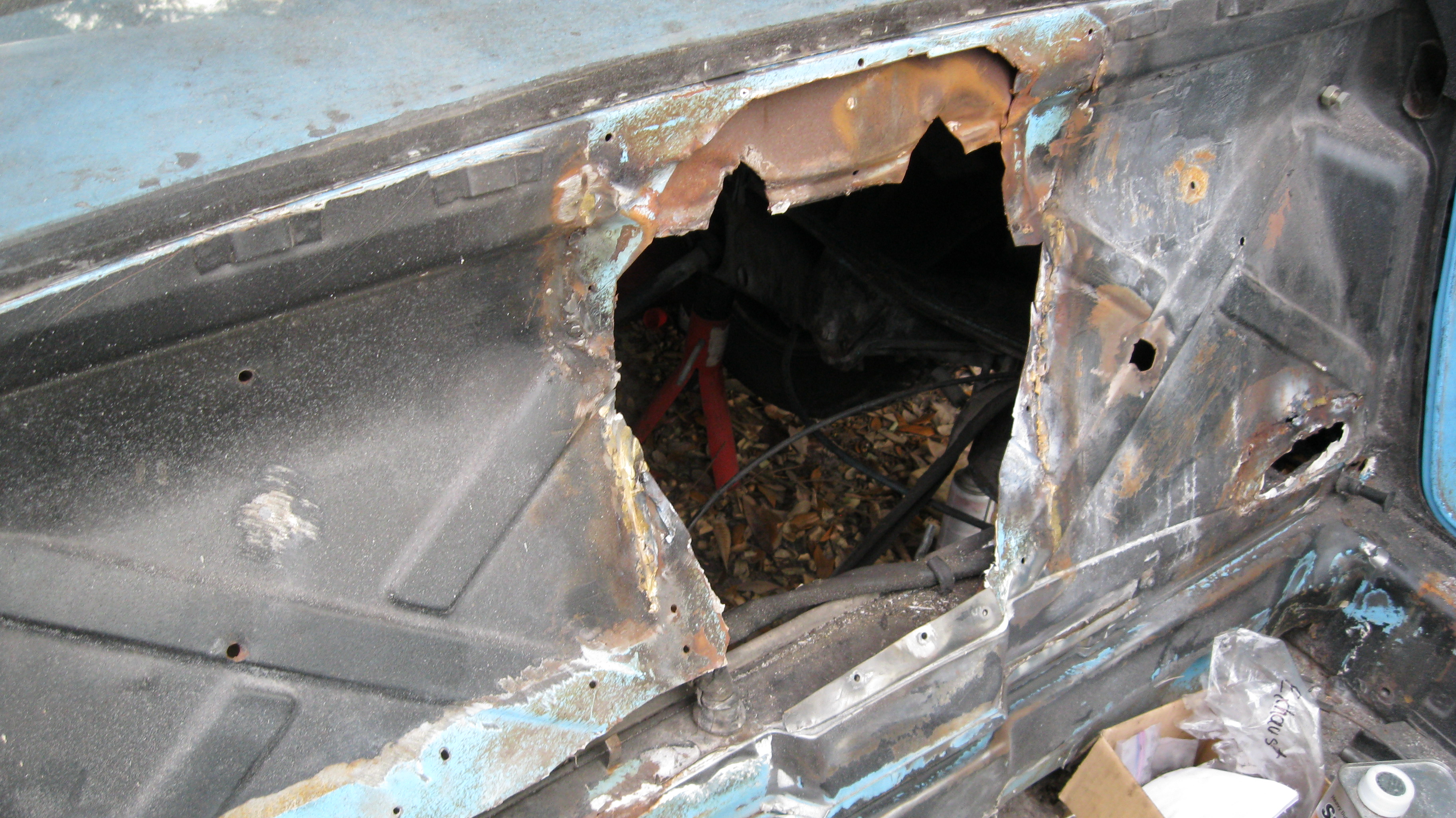 "Yep." "How bout brass?" "Yep." "Bathroom caulk?" "Yep." "Beer?" "Yep." "Sounds like a recipe for a new far'wall to me!" "Yep." Well thats how I imagine the conversation between these two (IMG:style_emoticons/default/sheeplove.gif) went at the time. Now I get to grind brass out a little at a time. Tried MAPP gas - it doesn't work. Gets the brass just hot enough to make you THINK you can scrape it out. It got a little gummy, but not enough to actually be of service. Depending on what Bruce Stone comes up with, I might be able to just cut around it if the replacement hump is big enough. I was originally going to try to replicate this. Better that I don't - I would never get it right with the basic tools I have. All the other little holes I can take care of with some sheet steel and butt welding. Oh yeah, I forgot to mention that if you're going to do ANY butt welding, come off the ten bucks and buy a set of butt welding clamps from Harbor Freight. You will use them for far more things than you could ever imagine. A Dremel is almost a must as well. -George Attached thumbnail(s) |