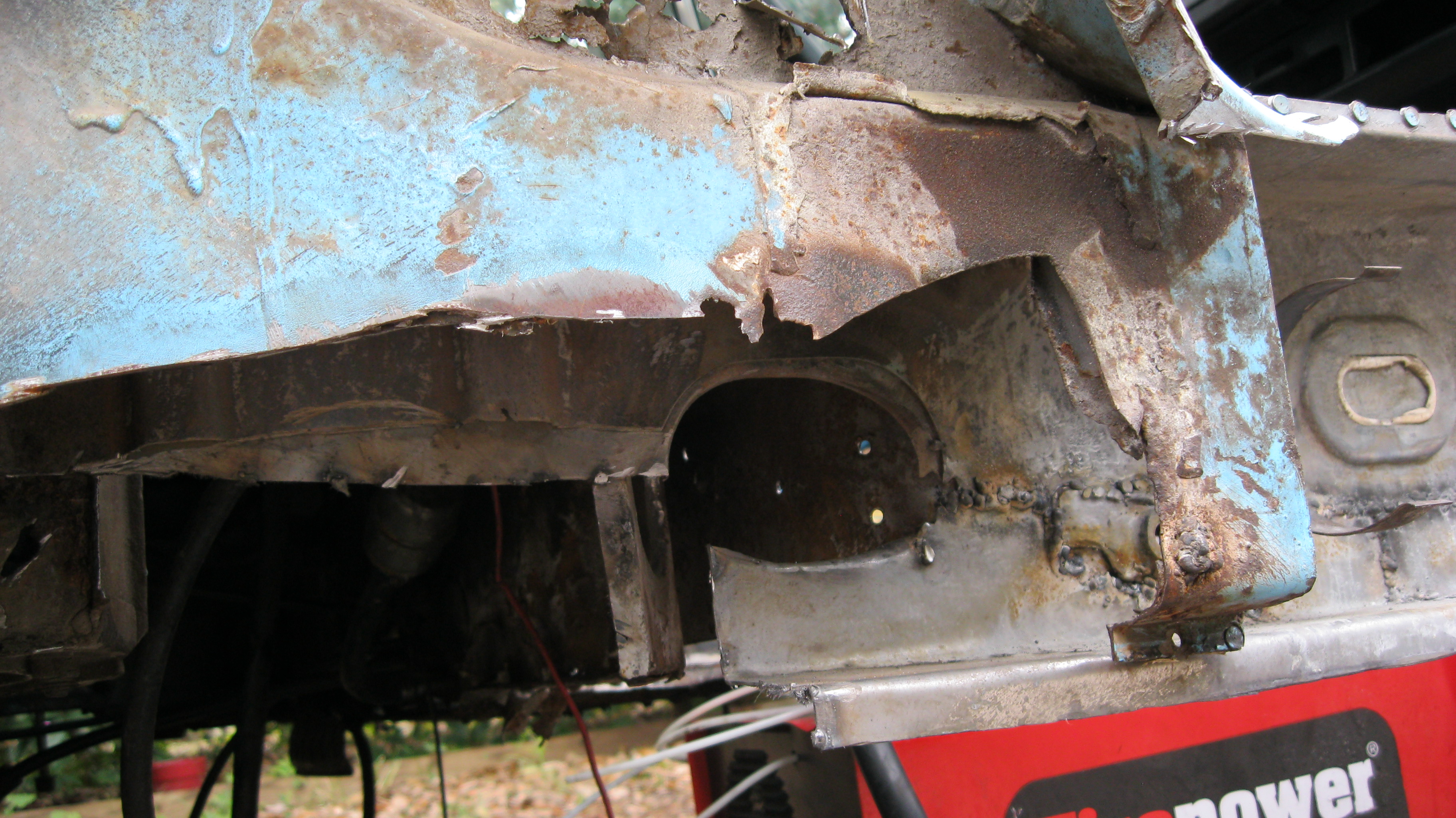 Okay, a little fast forward. I forgot to take pics of the rust before I cut it out, but here is where I decided to begin the repairs. As I'm sure you'll see in other photos, I already made the door bar brace out of some channel steel and some cheap home depot steel turnbuckles (with aluminum body. Like I said, I'm a cheapskate and couldn't find any better turnbuckles anyway. This may come back to bite me in the (IMG:style_emoticons/default/bootyshake.gif) later on, but as of right now its holding at 25 1/8 inches. I don't even recall having to adjust it any other than just getting the turnbuckles tight initially. With the rust this car has, its amazing it isn't already broken in half. I've taken multiple measurements and nothing has changed. Also, I have to note with the rust it had, there was nowhere for me to jack the car up but the rear suspension and front donuts. I know others have supported their cars much better than this, but it doesn't SEEM to be a problem. Sometimes you have to do what you can. Also, this car won't be on a rotisserie - its all being done in my driveway on jackstands.