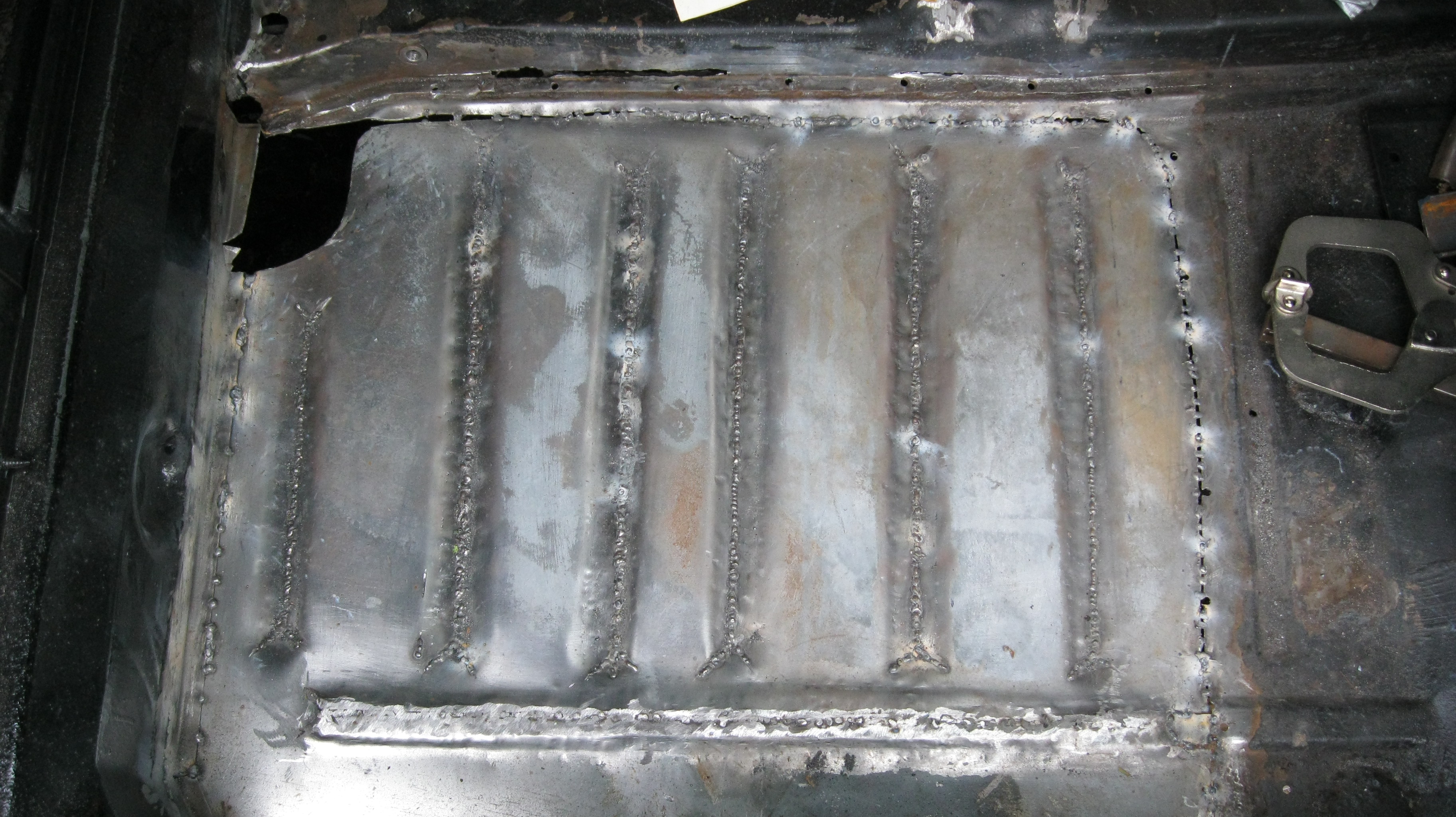 Thanks for the kind words fellas. Been raining all day so I couldn't get any work done on the car before classes this afternoon. However, I went out and took a few photos. This one is the passenger floorboard we made. Still needs some welding and a few more bends to be complete, but I think it'll do fine in the car. It was a full days worth of work to make, but for me, cost is everything. If you look at the welds, you can see how it was done. We cut a few slots lengthwise using a cutting wheel as well as one down the side for the seat channel. Then, bent those downward using channel steel and a ball peen hammer. Then, hammered this "V" shaped valley against bar steel to achieve more of a "U" shape. This left about an 1/8th to 1/4 in gap, which had to be welded closed. The only real problem was the warping, because I failed to mention to mark that he needed to put in all of his spot welds first. However, fitment wasn't bad, and since this car was destined for a scrap yard anyway, I think anything we do to it is an improvement. Once I'm out of college I'll find a nicer model to do everything the "right" way (IMG:style_emoticons/default/smile.gif)