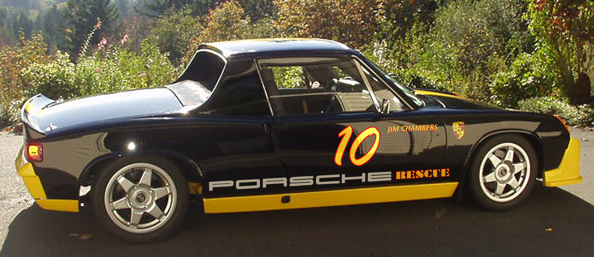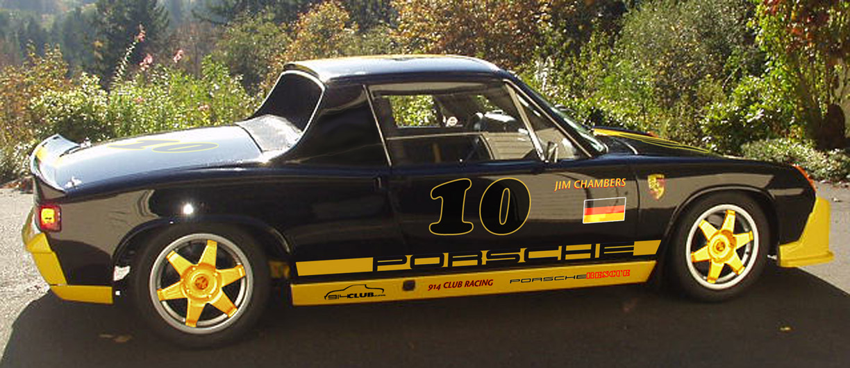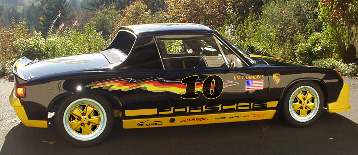 1. 911 Fuch wheels, yellow painted centers. 2. Jeff Bowlsby's porsche stripe decal. 3. Driver's name decal. 4. USA flag decal. 5. Transparent moving German flag,with number 10. 6. Owners web name Porsche Rescue decal. 7. Sean Lee's 914 Club.com decal. 8. 914 Club Racing decal. Attached thumbnail(s)