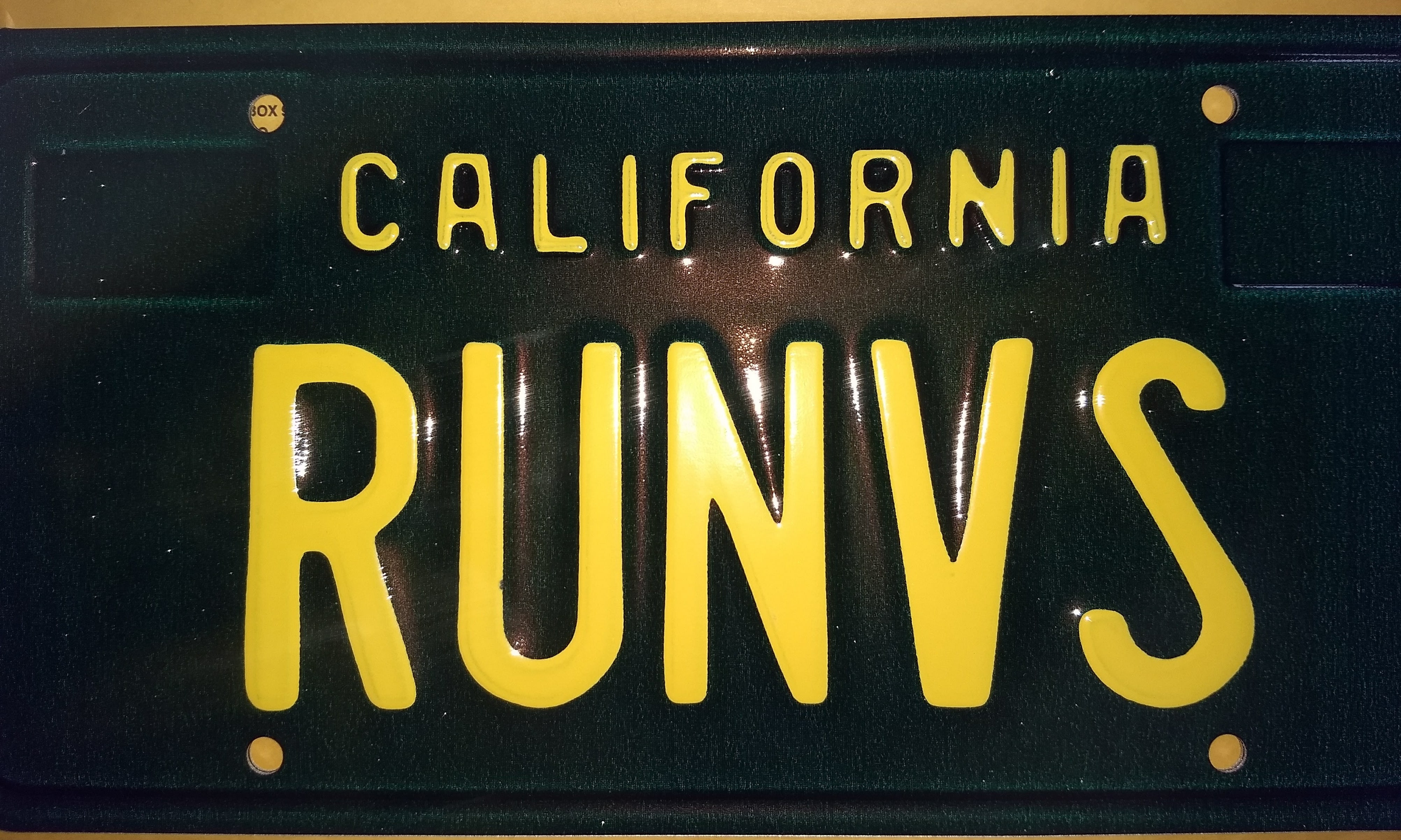 When I was a kid, there was a 914 running around town with these plates on it. It's a bummer that I couldn't get them in Blue and Gold but, I'm stoked that I got them at all. (If it doesn't make sense, just say each letter out loud to get the gist of it.) |