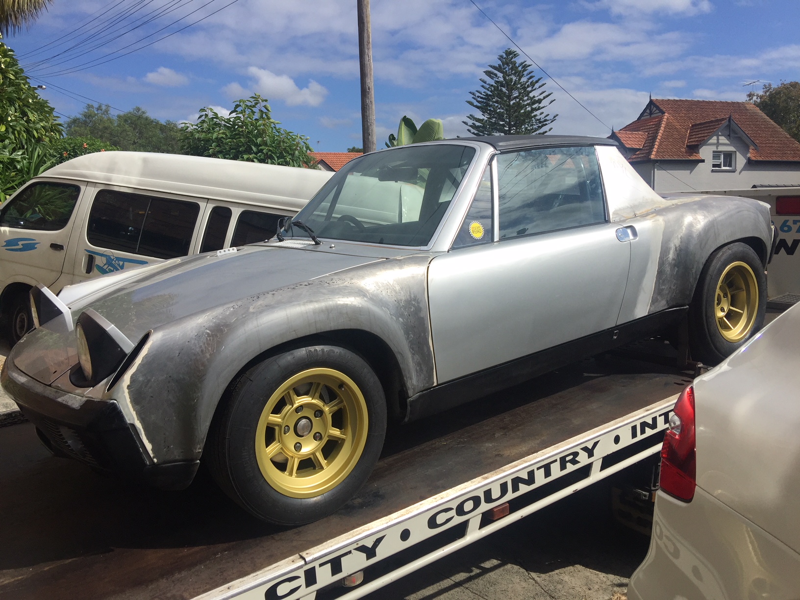 The wheels are by Group 4 Wheels I had them on my old Martini 911SC and they are very nice. These are 15x8 and 15x9 with Michelin TB15 tires. The car will stay silver. It had an extensive big dollar resto about 18 years ago and has hardly been driven since. The underside, trunk, engine compartment is in near perfect silver so it would be pointless stripping back to a shell again. The bodywork recently completed consists of the steel gt flares, fibreglass bumpers, rockers, valance, through hood filler, gt oil cooler setup in front, gt bonnet pins, hood lights etc etc. it will run a subtle but different livery once painted. |