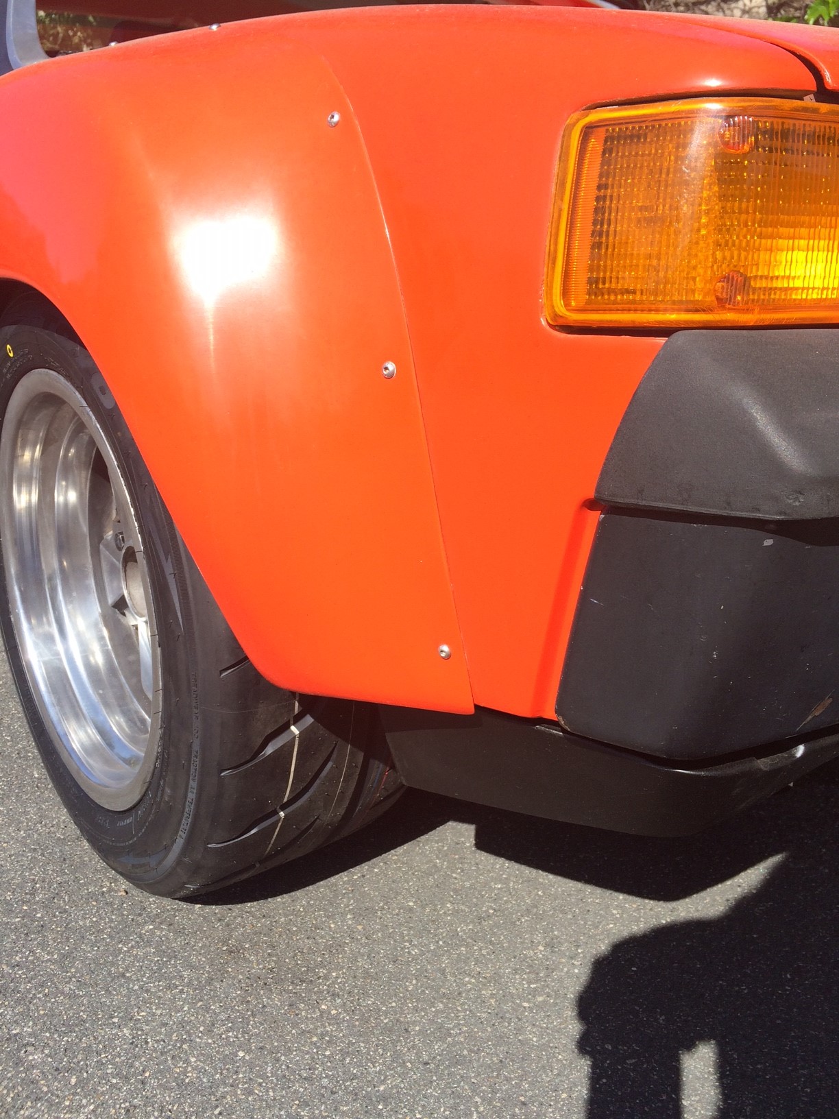 I resprayed the bumpers black as i changed my mind and didn't like them orange. A couple of little pin holes have appeared so something reacted, maybe dust (IMG:style_emoticons/default/confused24.gif) i'll sort that out. I got the temp gauge and fuel gauge working in the original multi gauge. The driver side wheel is off as the caliper is seeping fluid from somewhere! While this is open i've cleaned off the flaky underseal and primed the chipped bare metal. Repaint tomorrow when i get home. The trim around the engine bay which holds the seals was dented/chipped in places so that has been straightened and painted. There was a tiny raised spot on the rear fender close to the drivers door handle. Investigation found no rust so that's been prepped for paint. I also found a new dent in the same fender. I walked away then! |