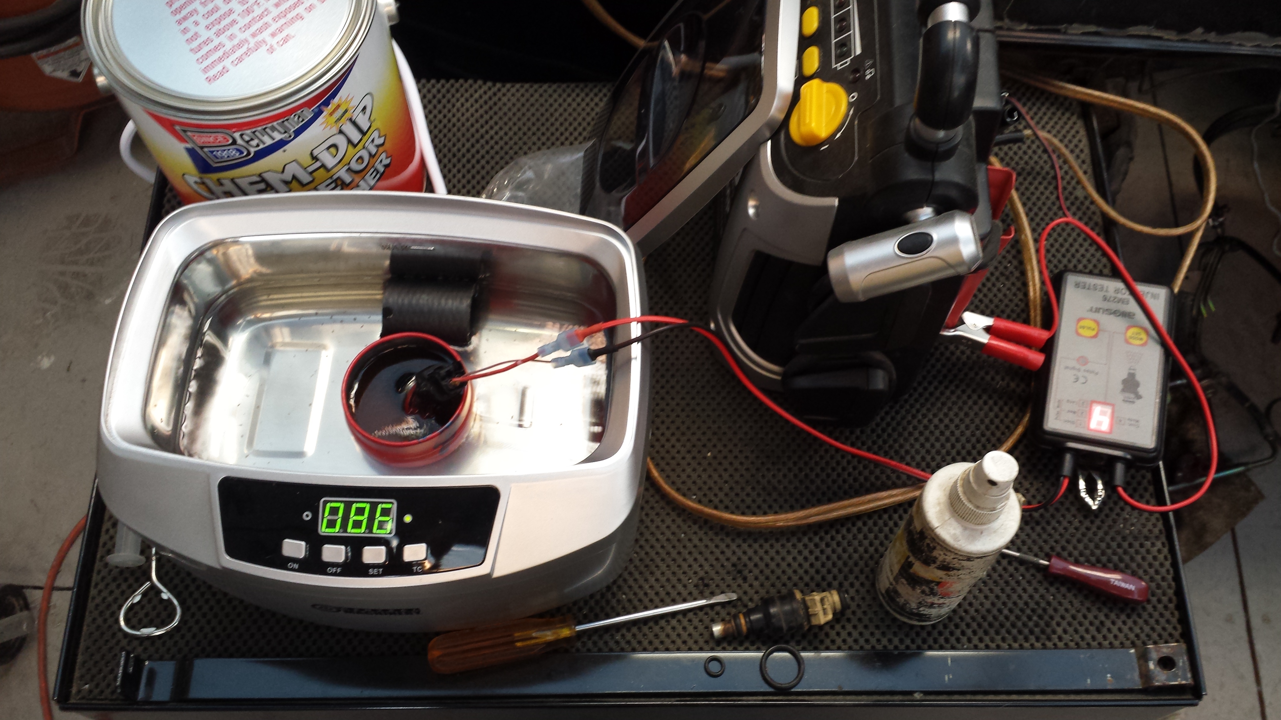 Got the injectors un-gummed up like a pro... Also got the engine back together and tried to start it. Now I have squirts and no sparks (IMG:style_emoticons/default/headbang.gif) which is actually good because I might be stupid and try to drive it to Rt66 in 2 days after being parked for 10 years (IMG:style_emoticons/default/slap.gif) For those that would like to know... I got the injector pulser off ebay for $30 (All Sun EM276) and the ultrasonic cleaner from Harbor Freight. No $avings over Pro cleaned but I'll use it many more times. |