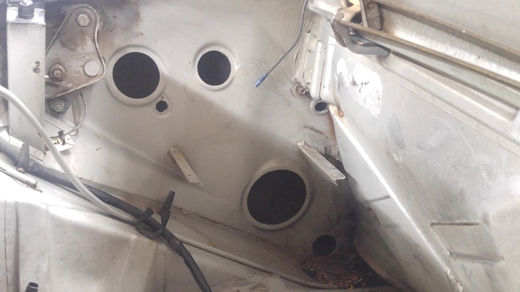 A box was delivered with a muffler heat shield. I welded it onto the replacement trunk floor and gave it a coat of etch primer while I could get in all the nooks and crannies. the crumbly looking stuff is leftover seam sealer. Also a pic of the holes I drilled for the oil tank. Still need some file work before a test fit. Attached thumbnail(s) |