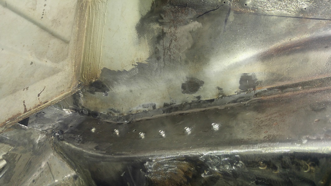 Over the weekend I patched the side wall. I finished the patch for the top of the long today. I'll do the plug welds tomorrow and move onto the side wall for the battery tray.