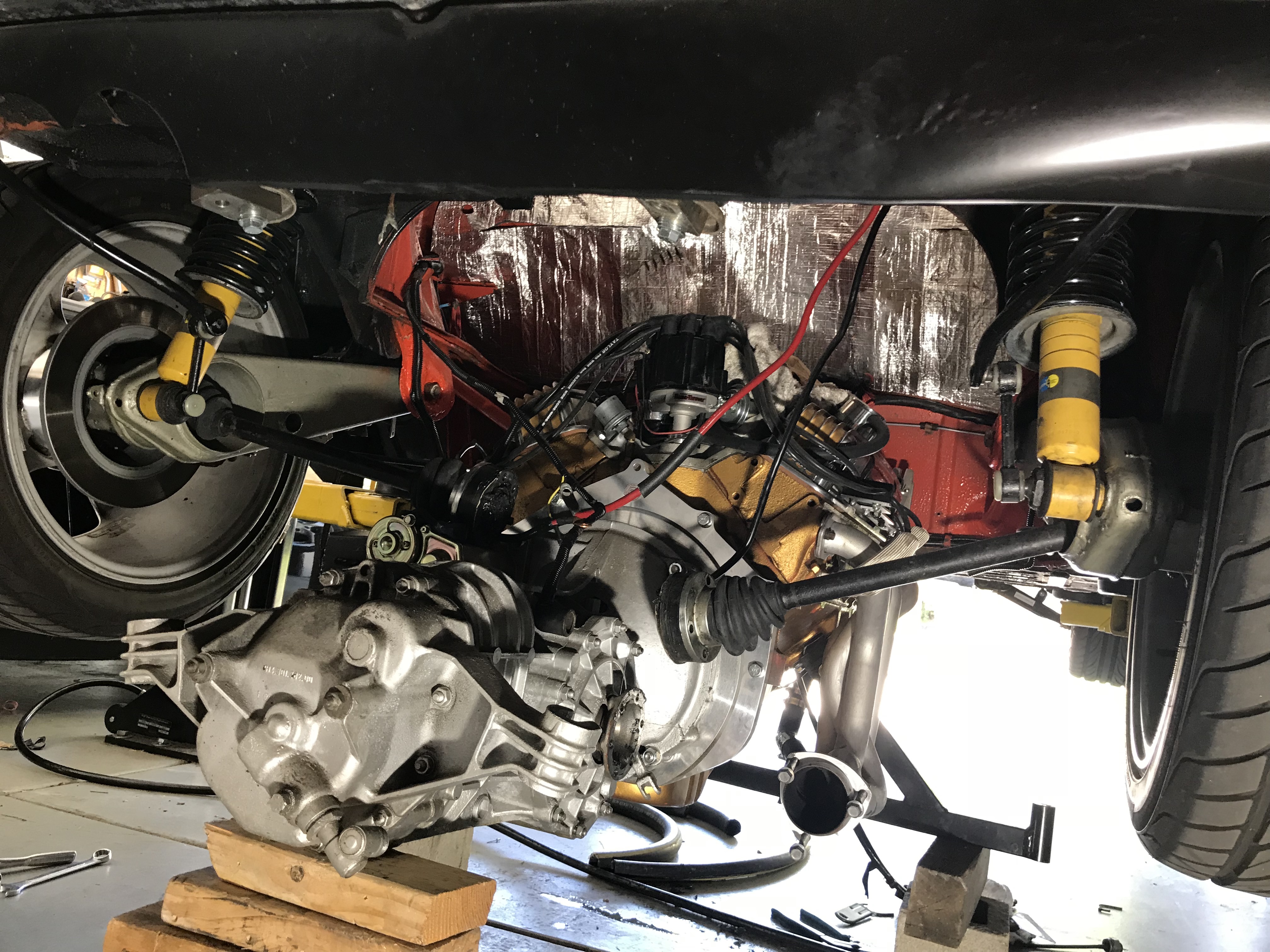 Finally finish the engine rebuild and the installation and tuning of new PMO's. Car runs great. Then, the starter is intermittent. Starter solenoid needs a tap from a rubber hammer. Should not have installed an old starter when the engine was out. Learned a lesson. Anyway, can't get to the top starter bolt with different combinations of extensions, universals and cuss words. Unbolted the muffler, removed the two rear engine/transmission mounts, lowered the engine a few inches and it went quickly. Always something. . . . Now for the rain to quit.