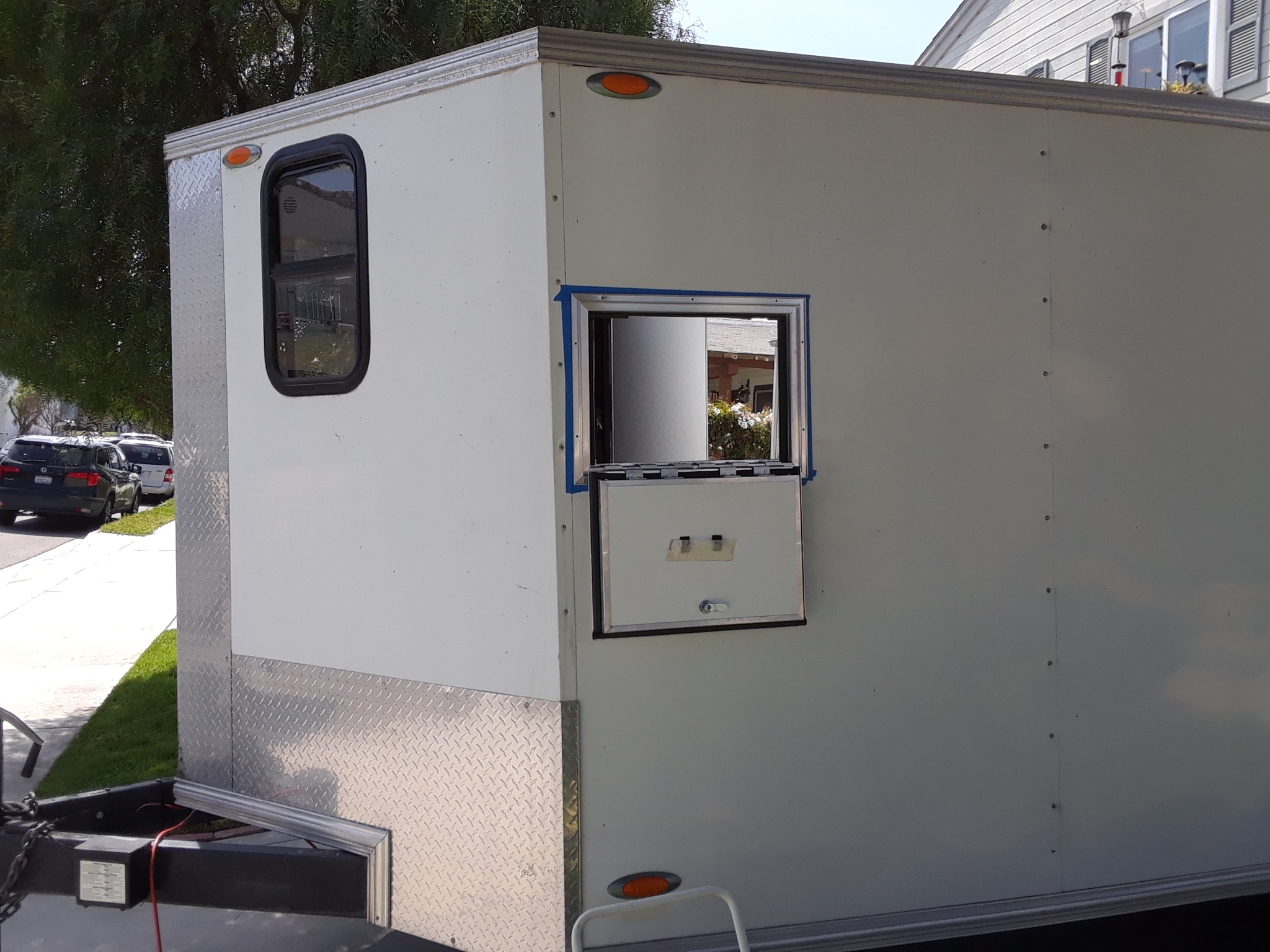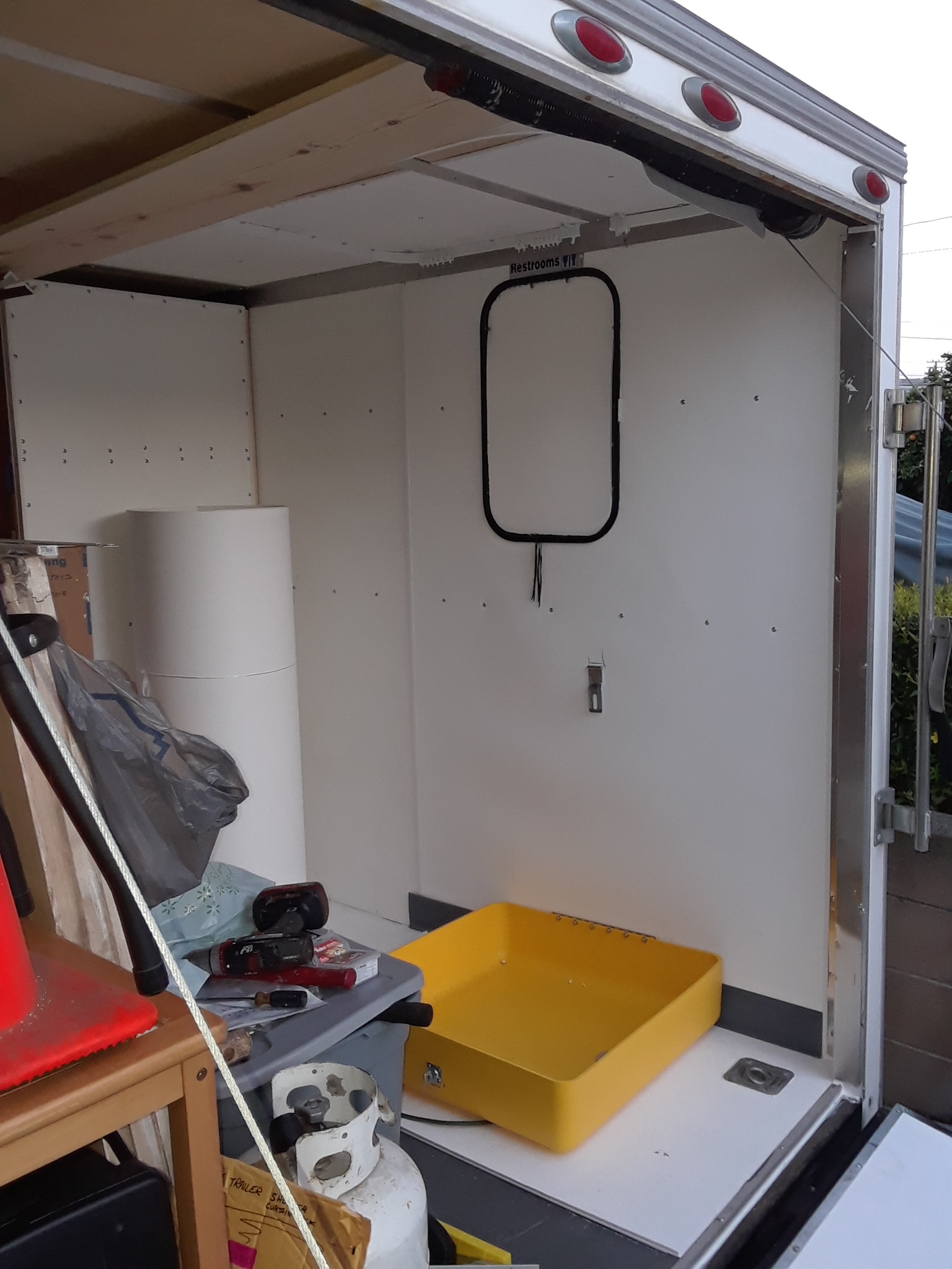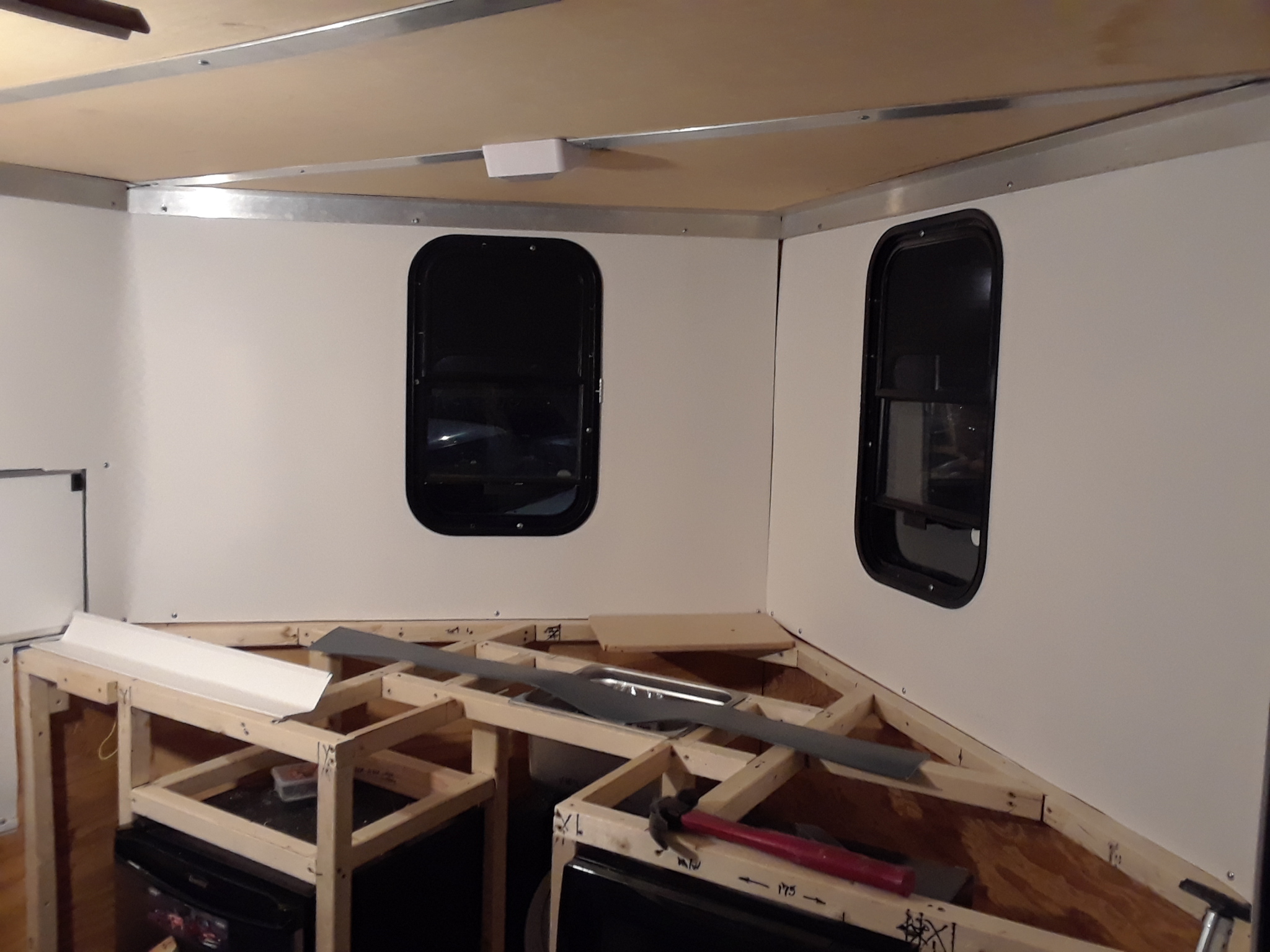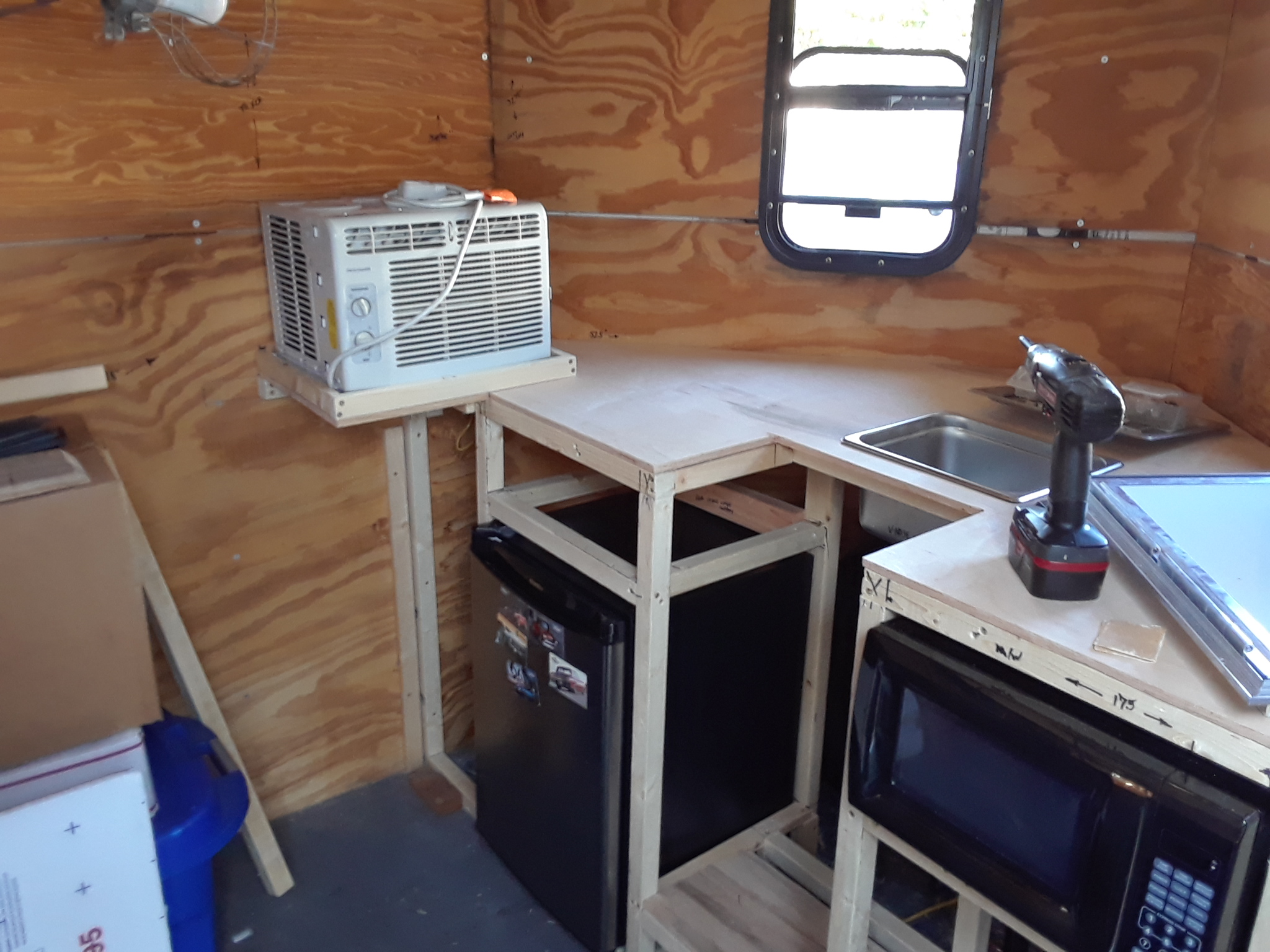 The 'bathroom' area in the rear is pretty much done except for the plumbing and the shower curtain. It has a folding privacy wall for the porta-potty area and a fold-down shower pan that when both are stowed away, still allows plenty of width for any of the P- cars to fit comfortably. Recently been working on the kitchenette area. Temporarily installed the counter-top and a small sink, as well as mocking up where a slide-out A/C unit will go. Removed the counter-top yesterday so I could install a small cargo door for the A/C unit and then covered the walls with PolyWall sheeting like the bathroom has. Next task(s) will be installing the electrical systems, including solar and generator power sources, as well as a shore power connection ... then the H2O and propane plumbing. When that's done, the counter-top can go back in, and constructing the cabinet doors and drawers should finish up work in the v-nose area. My cars and bikes are gonna like riding in this 'rolling garage' (IMG:style_emoticons/default/biggrin.gif) |