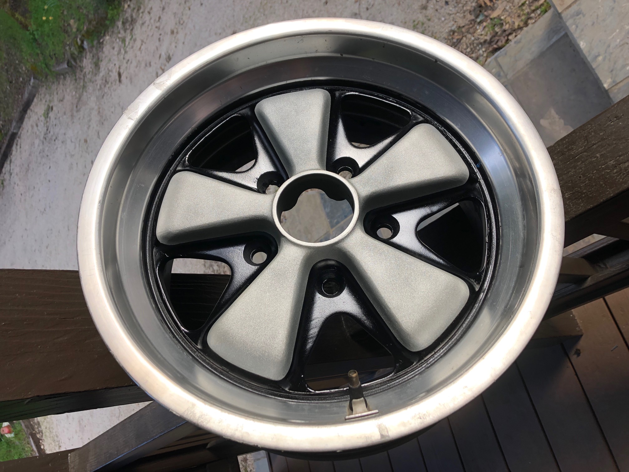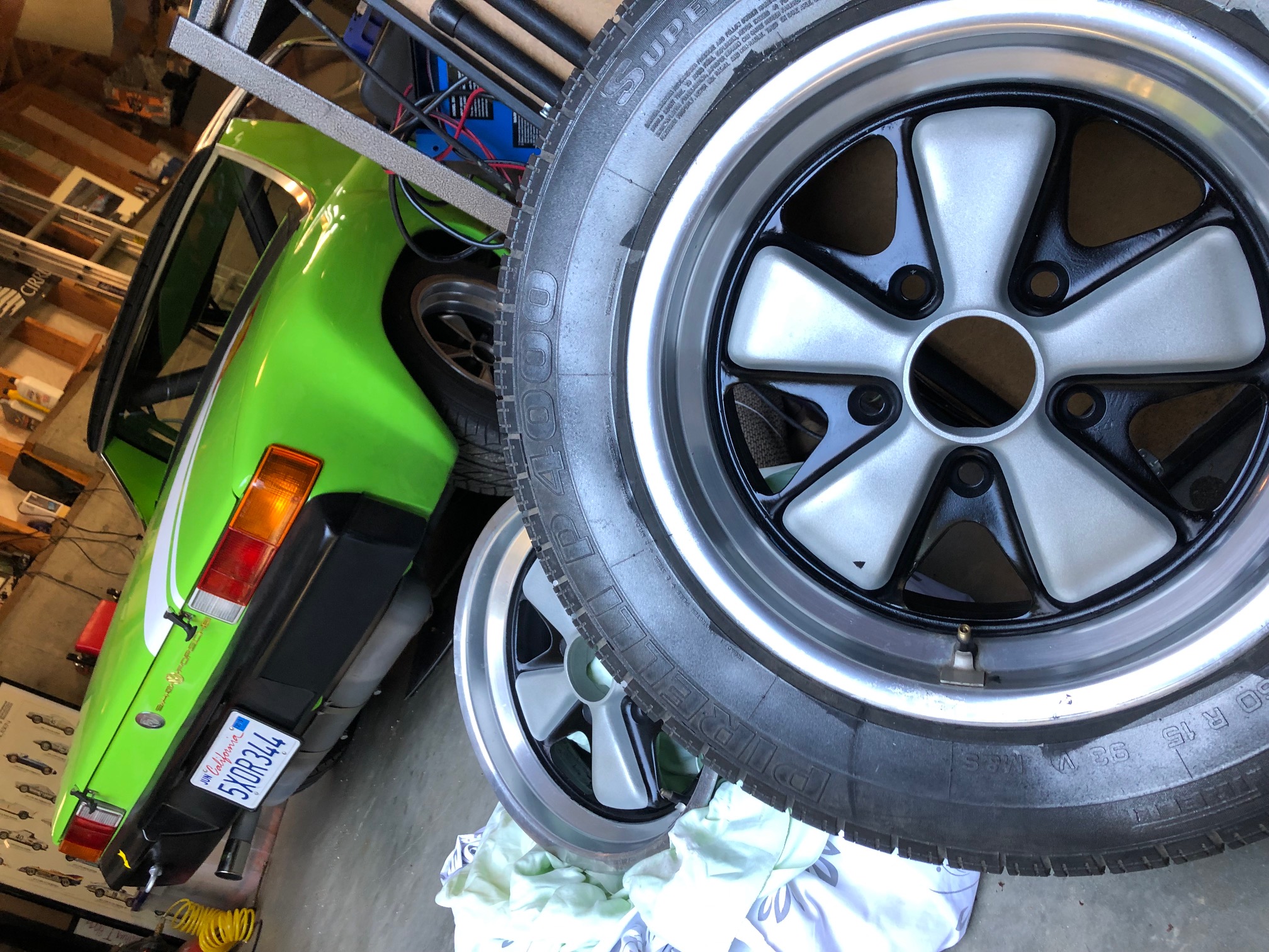 And I did a little more resurrection work on these 7" Fuchs: Trying to preserve the factory rim and lip finish as is (not concours, but presentable), but the centers were in bad shape and needed refinishing. I have a set of matching 8's that will be getting the same treatment. And before you point it out, yes that tire is old / cracked / scrap and will be replaced. |